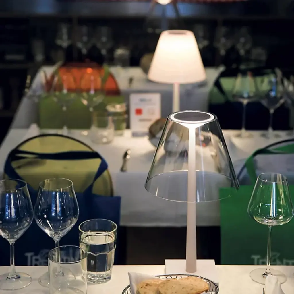 Charming lighting you can take with you. Either indoors or outdoors, the portable Dina Plus LED Rechargeable Table Lamp from Rotaliana by Luminart creates a welcoming ambiance and a memorable silhouette. The neat, attractive personality of this piece is a testament to designers Dante Donegani and Giovanni Lauda’s push for simplification in their work. The design duo gives you classic lighting elements like the tapered drum shade with an inventive modern spin. This shade sets itself apart with a slick quality created by a polycarbonate construction. A tapered aluminum column lifts the shade in the air in a silhouette that draws the eye from afar. The sleek metal base doesn’t just anchor the piece to the table, it houses its most innovative functionality. The base offers one plug for charging its 30hr light-producing battery and another USB one for conveniently charging your devices. Turn the piece on and set its vibrancy with the touch-sensitive dimmer. LED light softly filters through the shade, creating an inviting atmosphere filled with warmth.
