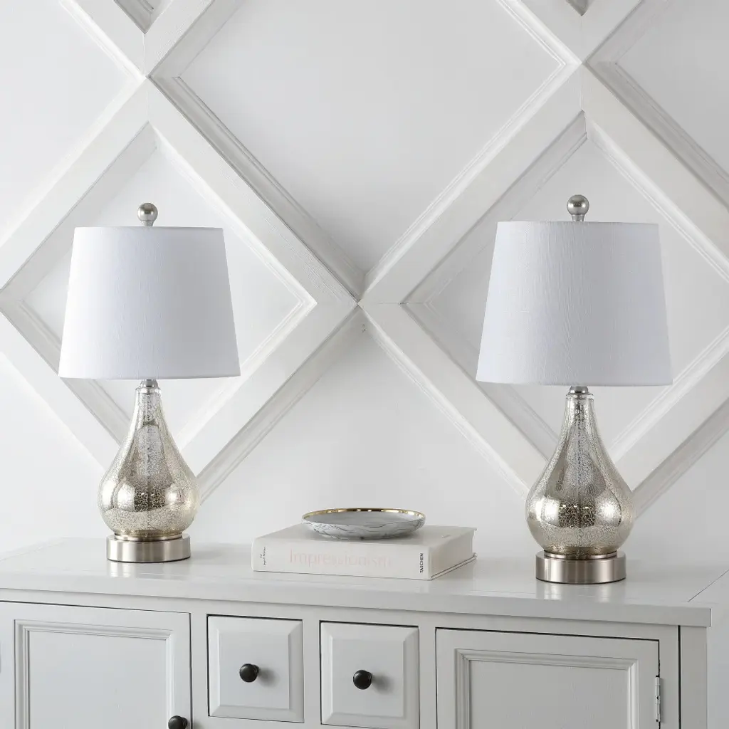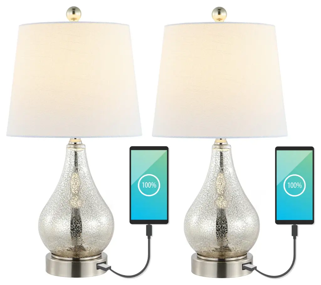 Dress up your space with the silver sparkle of mercury glass lamps; they also have handy USB charging ports for mobile devices. A pair of modern vase lamps is perfect for a bedroom, guest room, living room, or entry console. The charging feature is ideal for vacation homes and hospitality projects.Features:• This timeless pair of silver teardrop lamps is perfect for traditional and modern interiors, especially guest rooms and resort rentals• Quality features include a hardback fabric shade, elegant silk-wrapped cord, and USB charging port for mobile devices• Perfect for homes that desire modern textures with traditional design for vintage ambiance• Takes 1 bulb and compatible with TYPE "A" 60W or CFL 13W or LED 9W• Color: Silver with white shade• Body Material: Metal/Glass• Includes: Two (2) lamps• Assembly RequiredDimensions:• Lamp: 21 inches high x 11 inches wide x 11 inches deepAbout us:You see a lamp.We see a decorative work of art.A perfectly curved shade casts a dramatic shadow on a floor. A silk cord you never want to hide. Compatible with LED lightbulbs: as easy on the environment as they are on the eyes. The JONATHAN Y Lighting collection considers every detail from impeccably sourced materials to designer styling. And our prices are so attractive, we''ve transformed a functional necessity into a fashion accessory.JONATHAN Y Lighting - a fashion revolution in home decor.