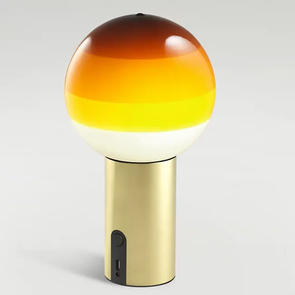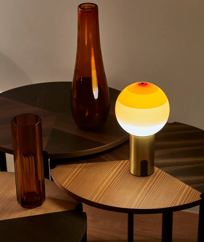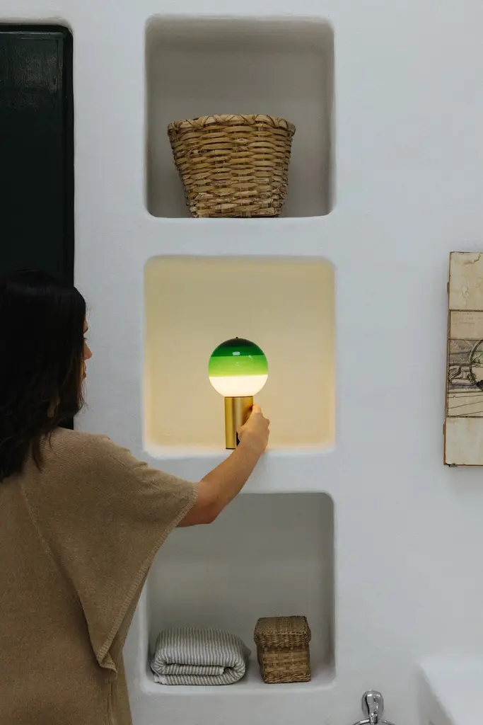 The new portable Dipping Light relies on a battery to forego the cable. It has a switch at the base and, like the other Marset portable lamps, features a dimmer to set the light output at one of three intensities. Small but important changes to make it completely mobile. Beyond its function as a lamp, the Dipping Light seeks to excite. When it’s turned on, its different shades of paint sift the light, creating a magical ambient effect. When it’s off, its colored glass sphere is an object charged with beauty, and eye-catching design piece for a shelf, bedside, or table.