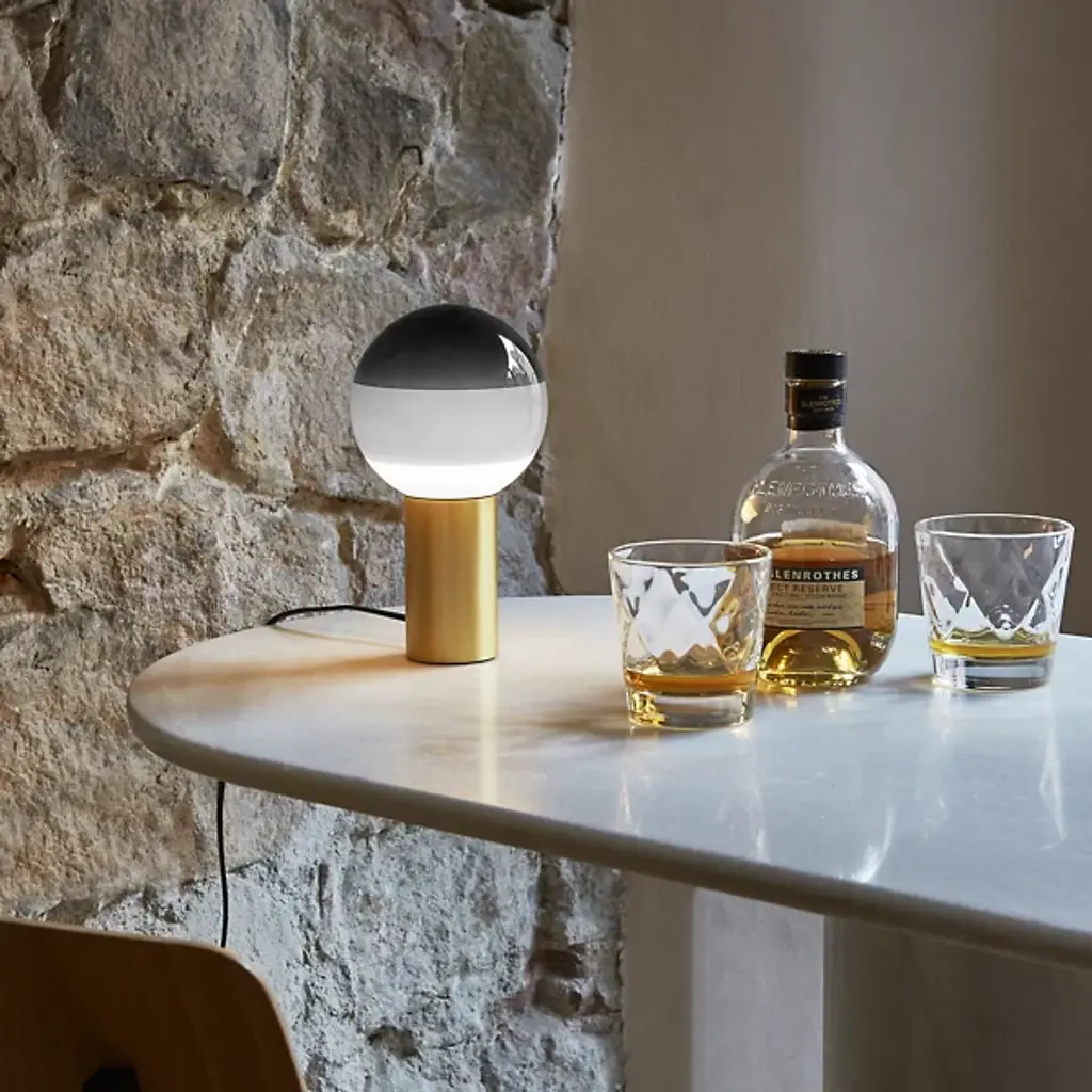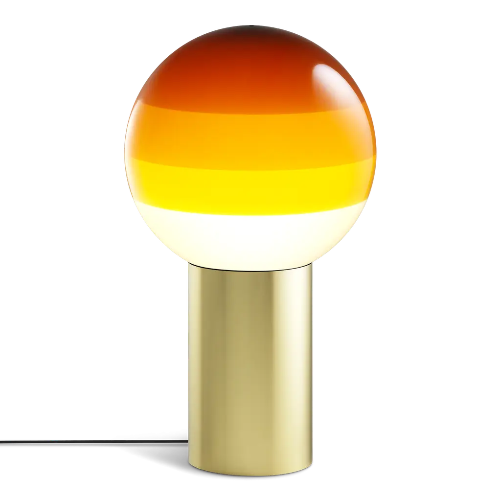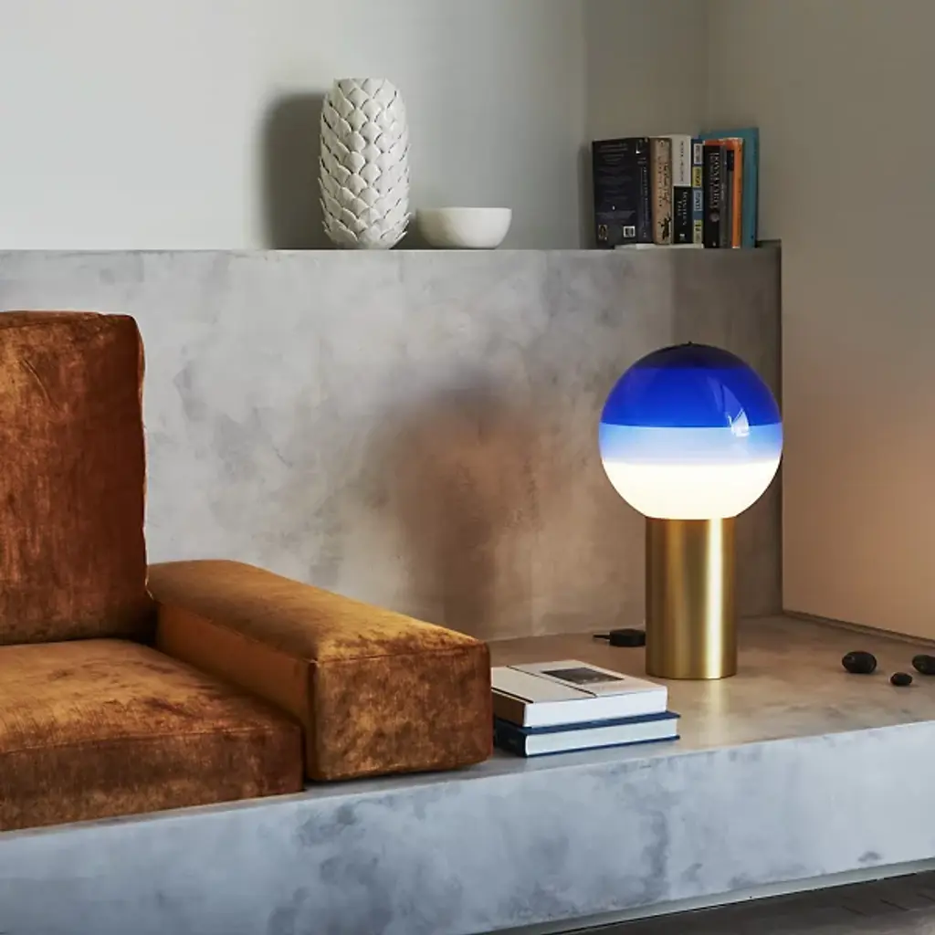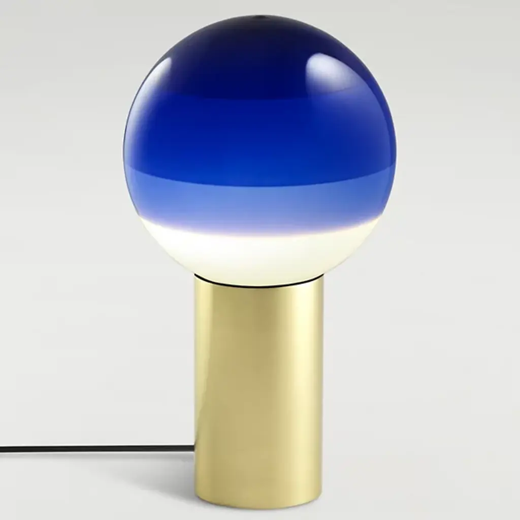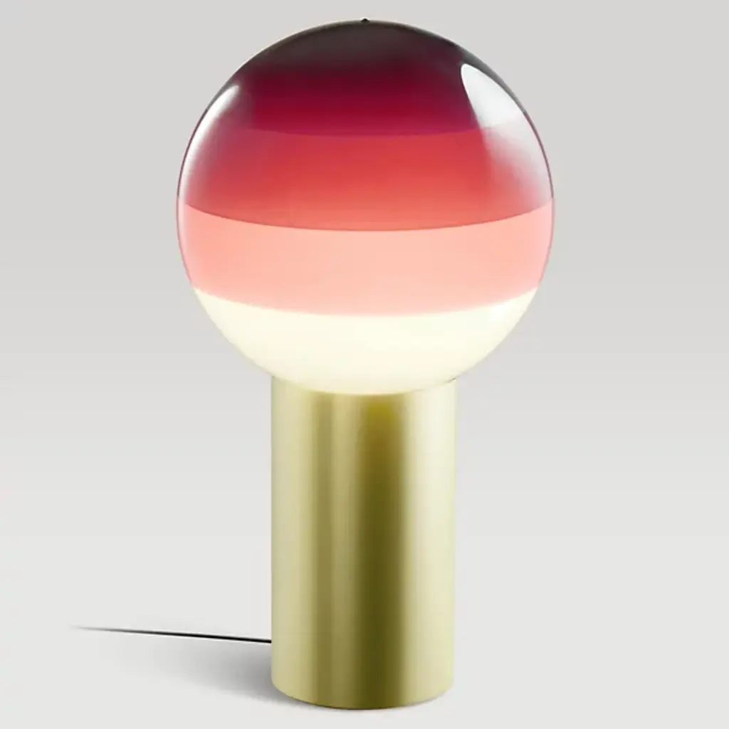 Partly art and partly lamp. Decorate your home interior with lights and colors with this Dipping Light LED Table Lamp by Marset. The spherical blown glass shade is carefully dipped in paint multiple times to form layers of hues with clean borders. When the LED is lit, it radiates a beautiful rainbow of shades across the room. This vibrant orb sits on top of a cylindrical metal base, which adds a metallic sheen to the luminaire.