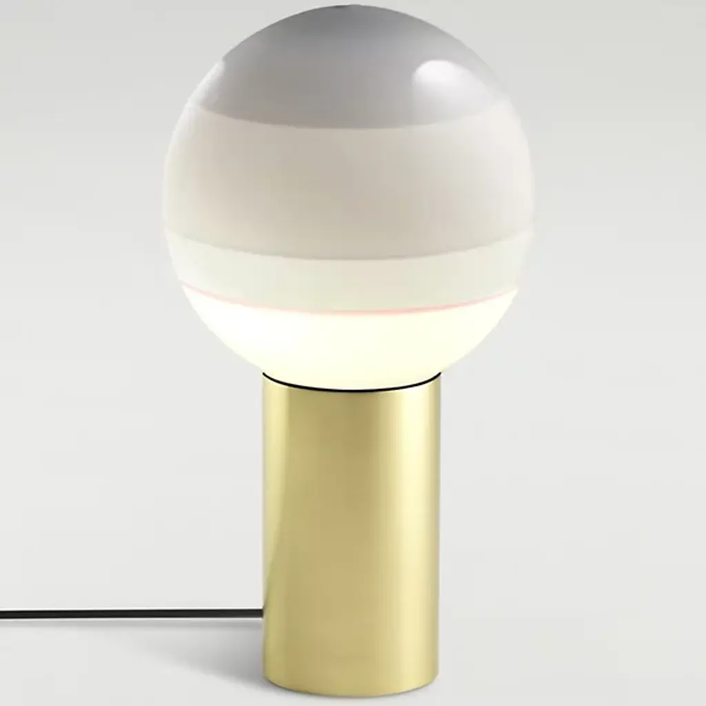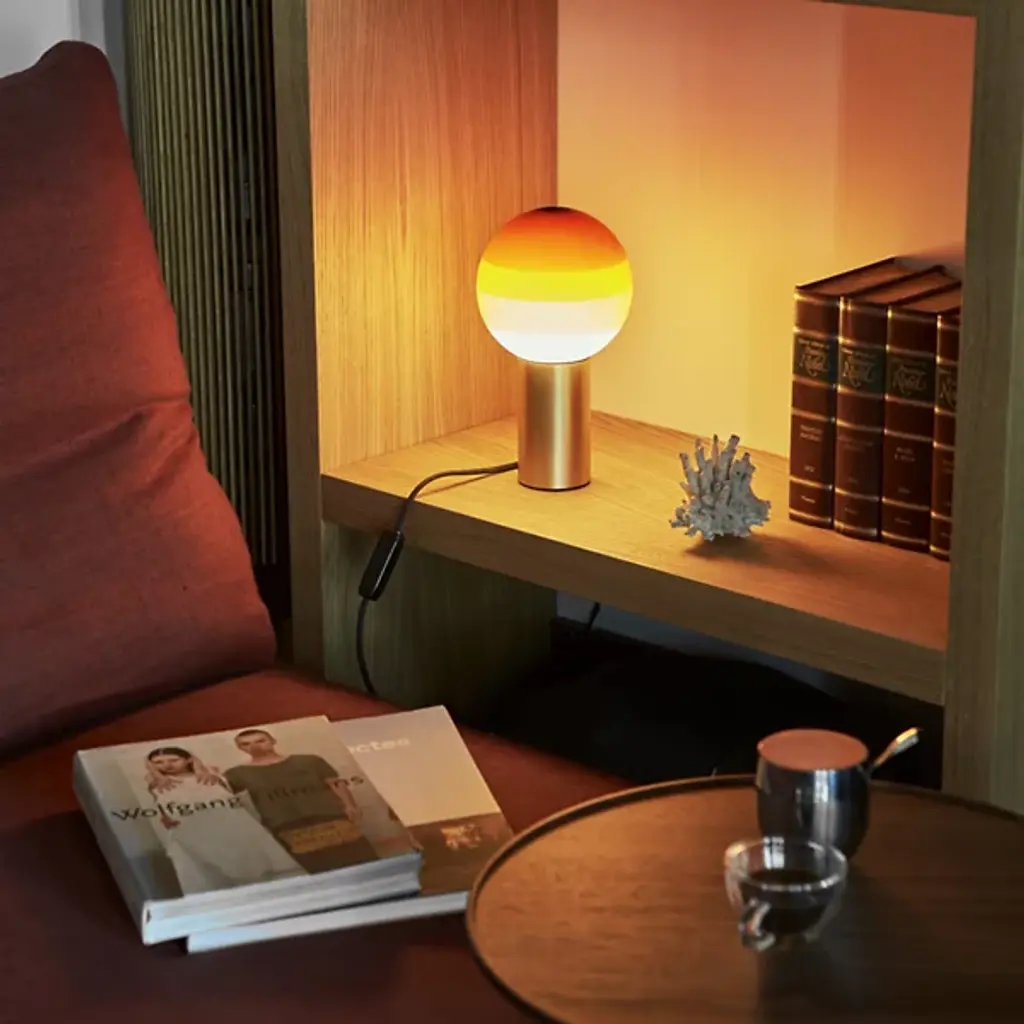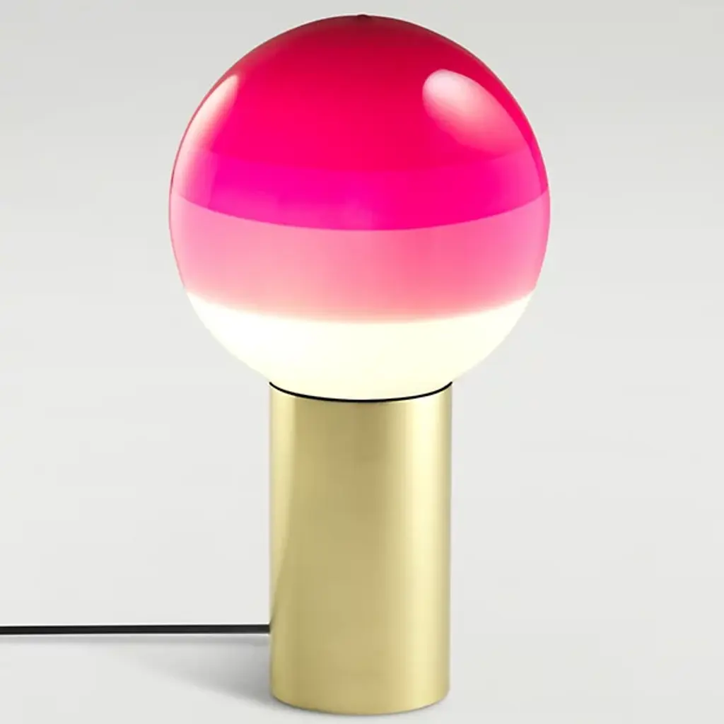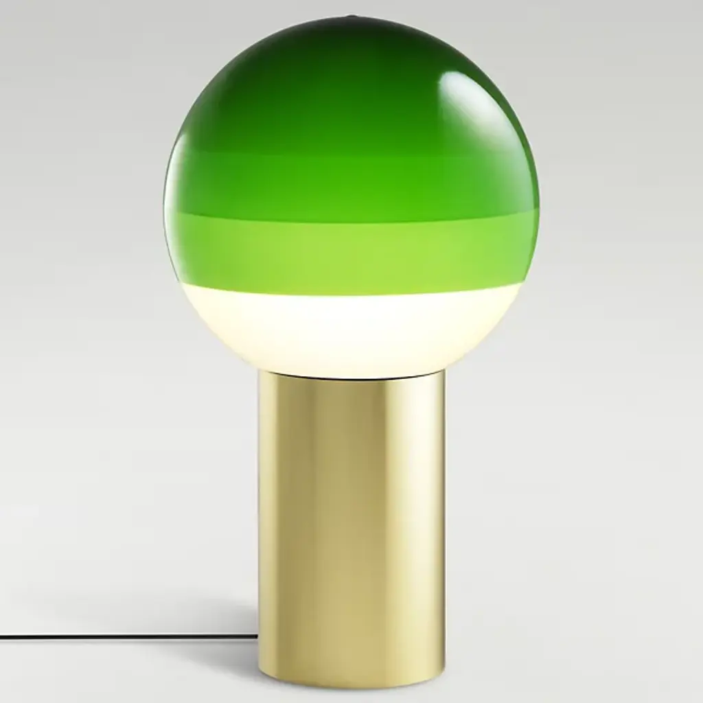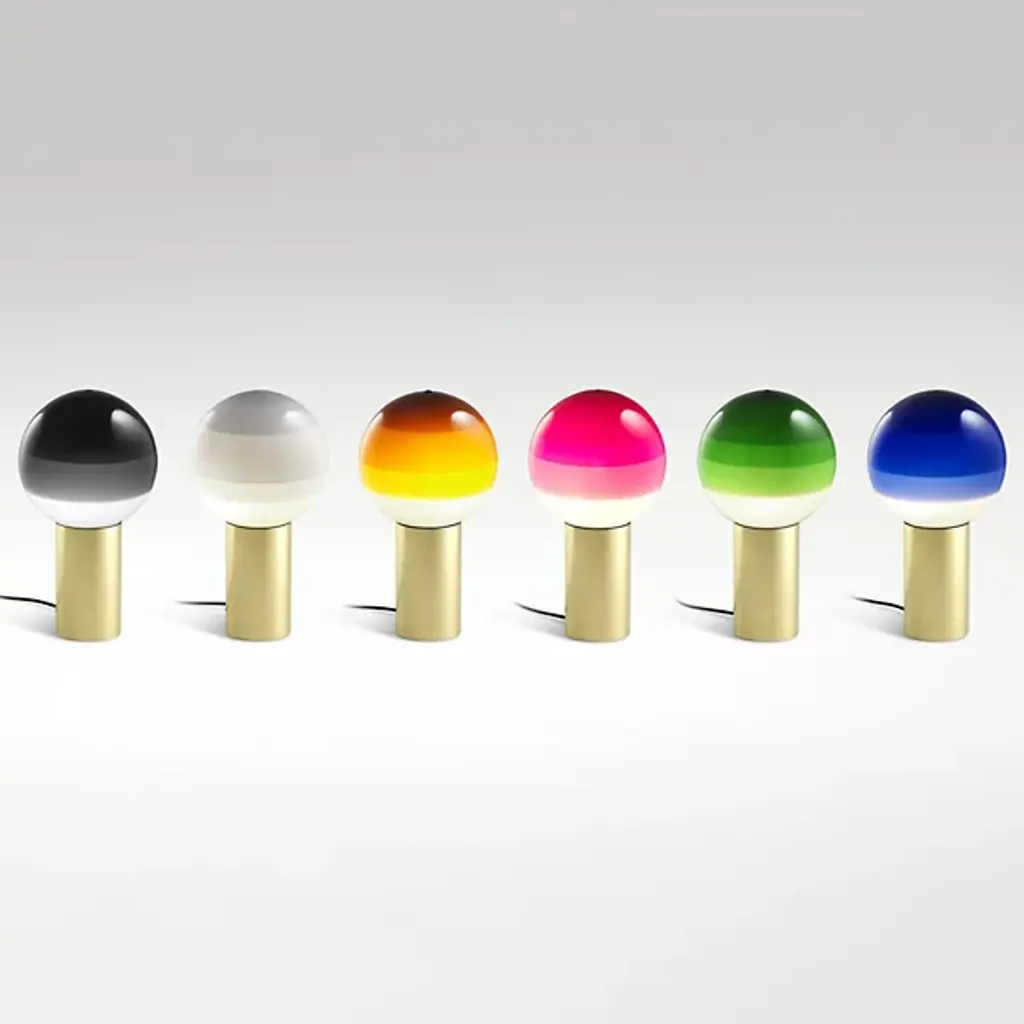 Partly art and partly lamp. Decorate your home interior with lights and colors with this Dipping Light LED Table Lamp by Marset. The spherical blown glass shade is carefully dipped in paint multiple times to form layers of hues with clean borders. When the LED is lit, it radiates a beautiful rainbow of shades across the room. This vibrant orb sits on top of a cylindrical metal base, which adds a metallic sheen to the luminaire.