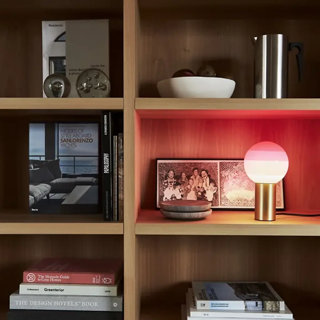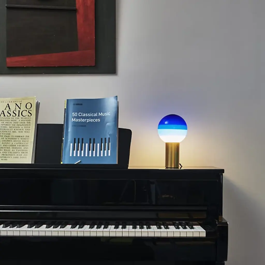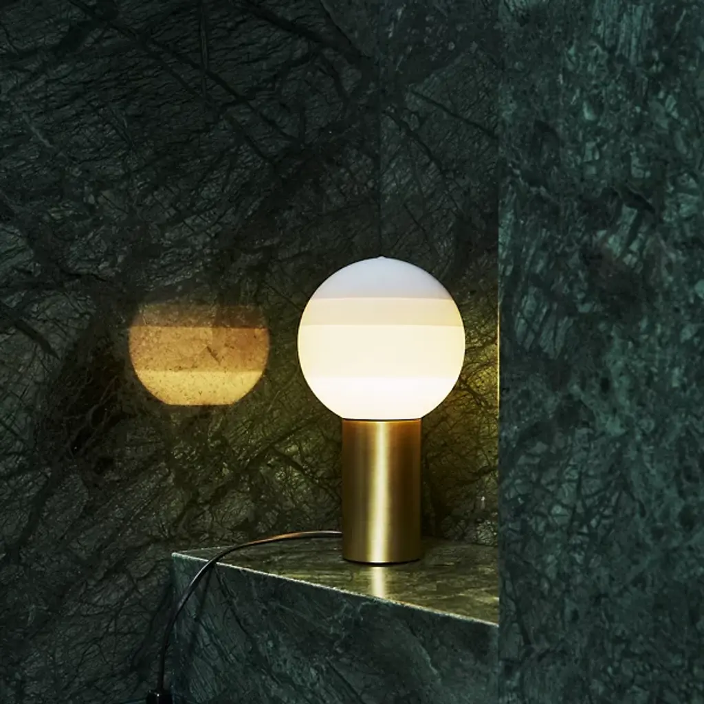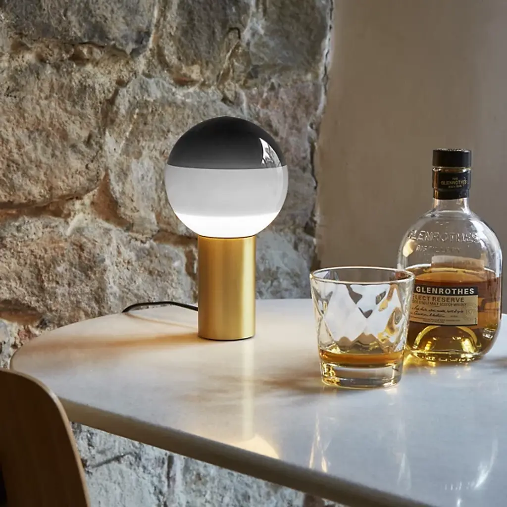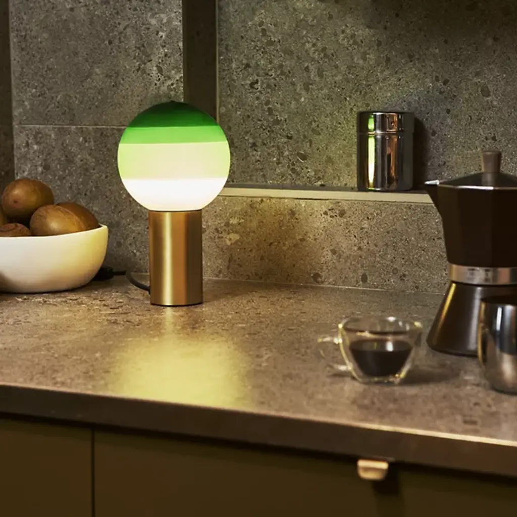 Partly art and partly lamp. Decorate your home interior with lights and colors with this Dipping Light LED Table Lamp by Marset. The spherical blown glass shade is carefully dipped in paint multiple times to form layers of hues with clean borders. When the LED is lit, it radiates a beautiful rainbow of shades across the room. This vibrant orb sits on top of a cylindrical metal base, which adds a metallic sheen to the luminaire.