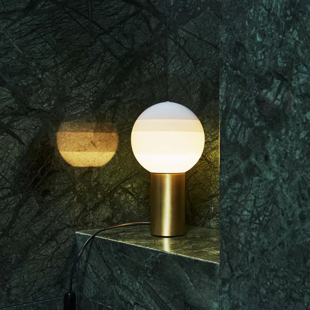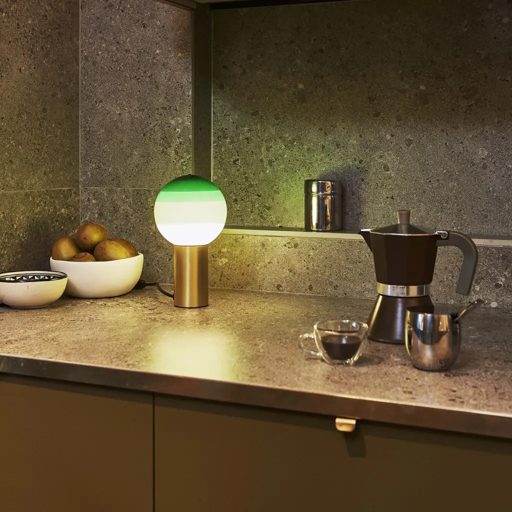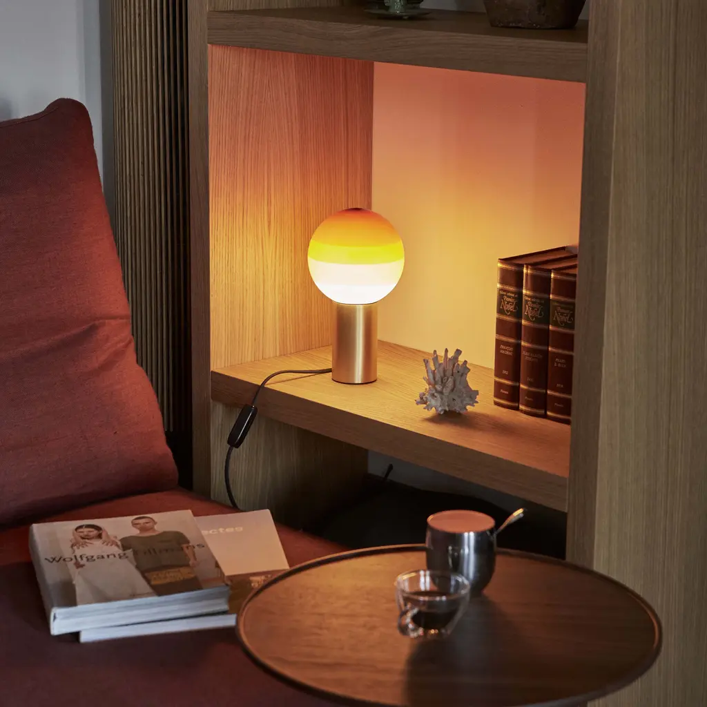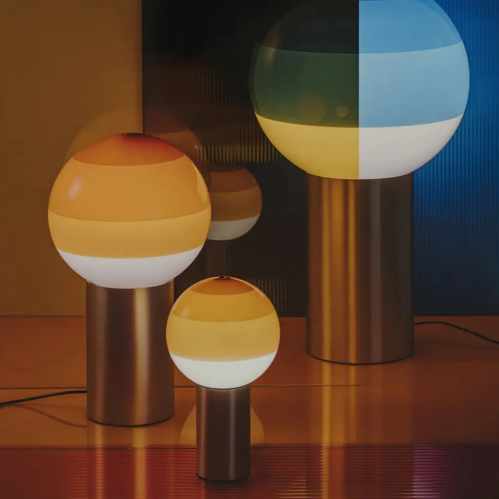 Part LED lamp, part decorative object, the Dipping Light Table Lamp from Marset stuns with handcrafted beauty. Concentric circles of paint on its blown-glass shade sift the light, creating a magical ambient effect when turned on. When off, the lamp serves as a unique statement piece with its multi-colored orb perfectly balanced atop a metallic base, ready for accenting a shelf or table. Highlights