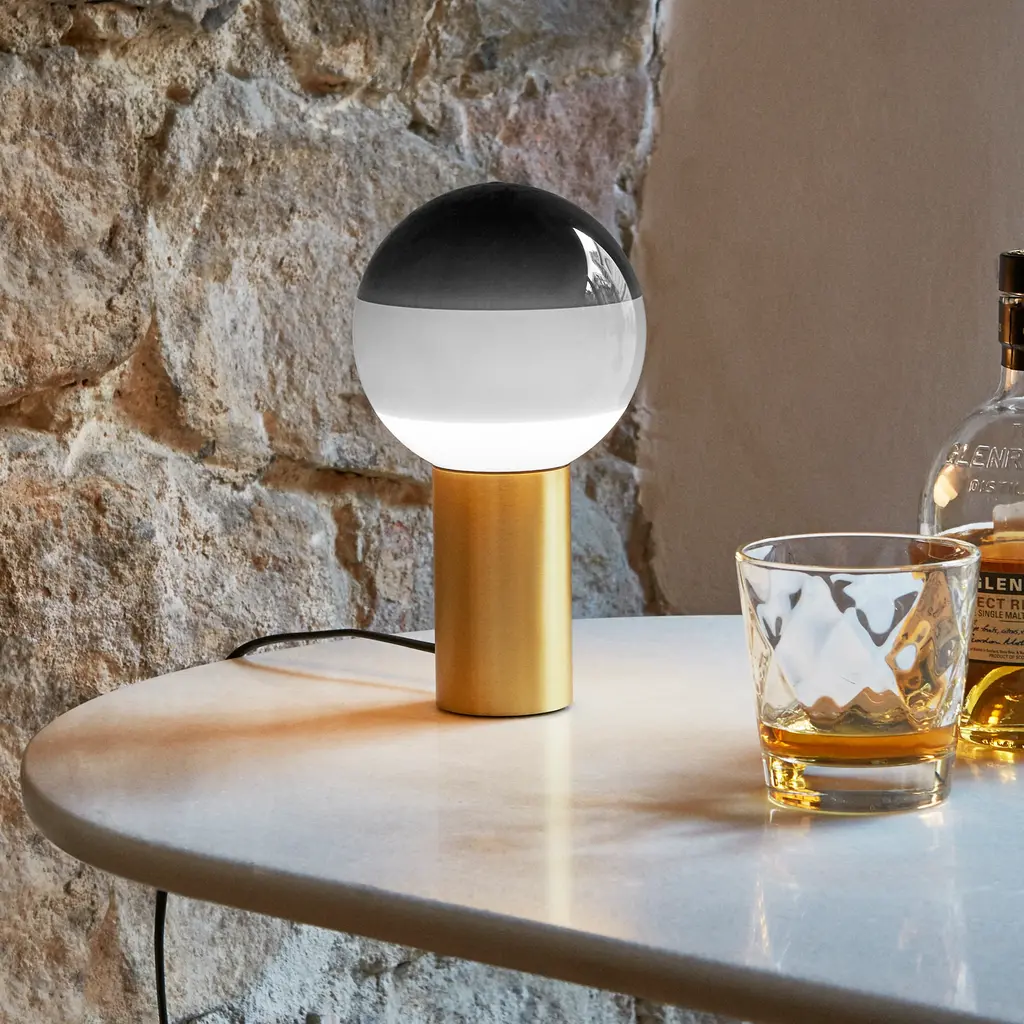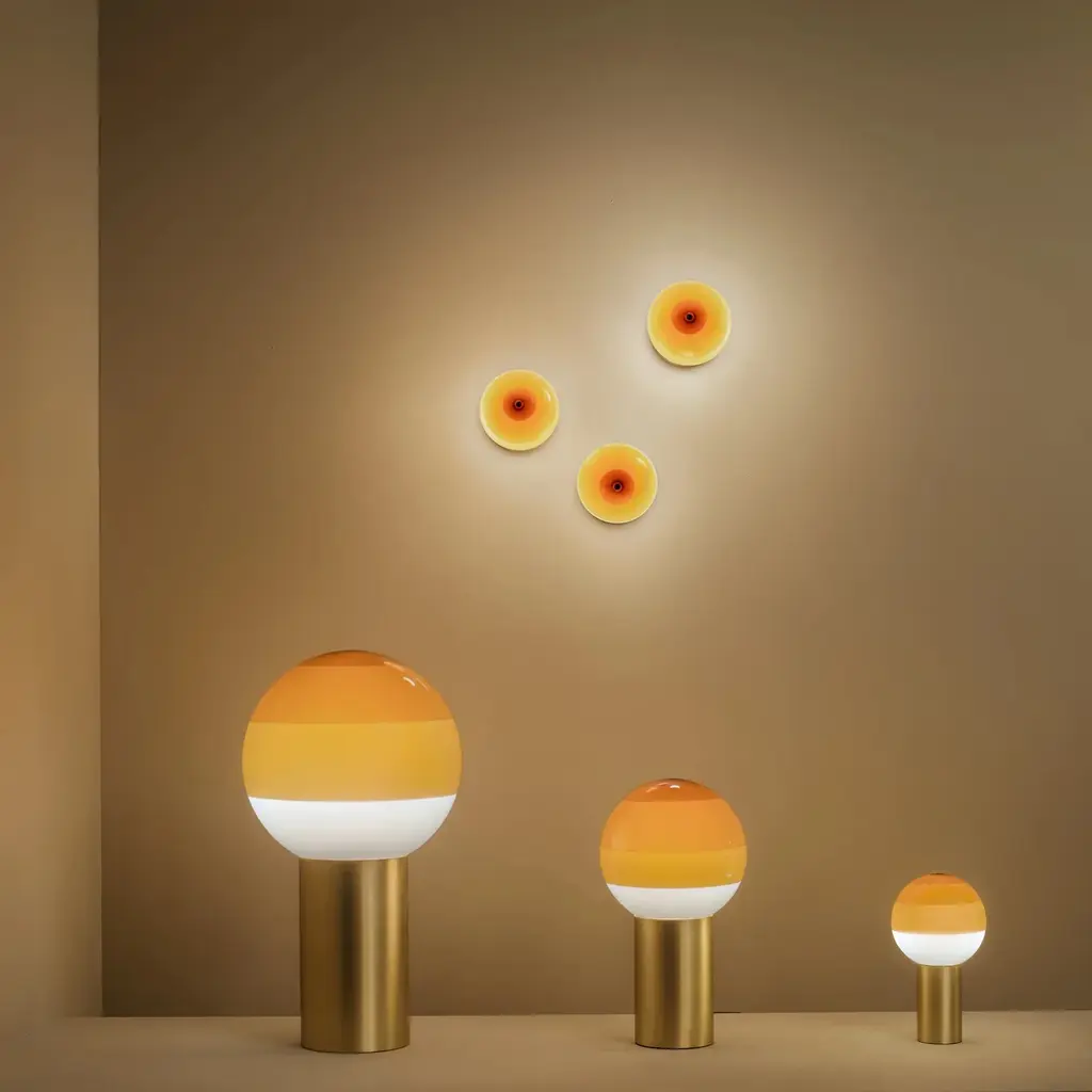 Part LED lamp, part decorative object, the Dipping Light Table Lamp from Marset stuns with handcrafted beauty. Concentric circles of paint on its blown-glass shade sift the light, creating a magical ambient effect when turned on. When off, the lamp serves as a unique statement piece with its multi-colored orb perfectly balanced atop a metallic base, ready for accenting a shelf or table. Highlights