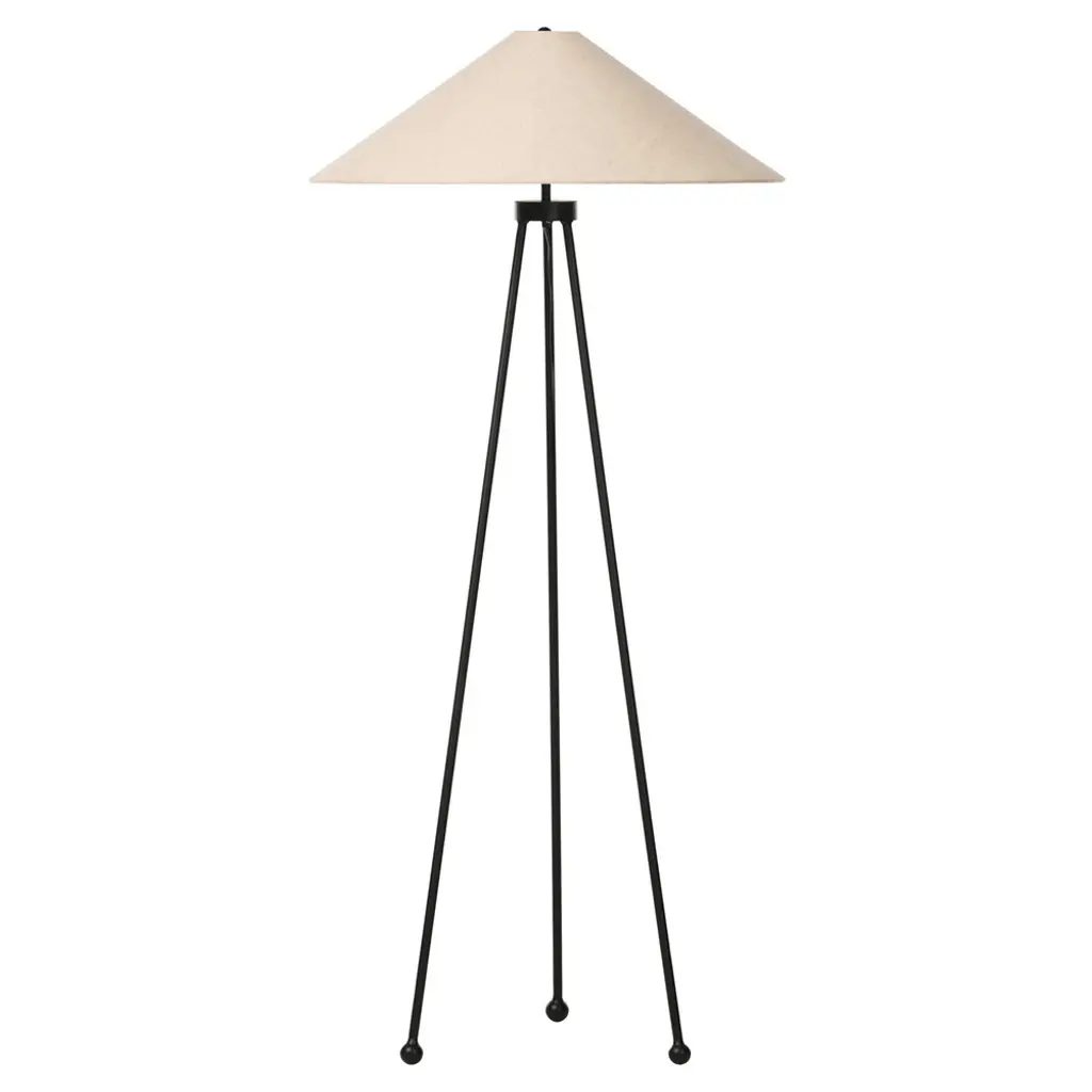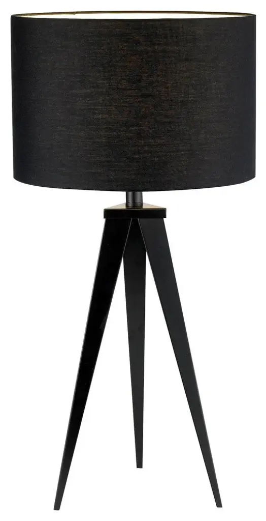 The Director lamp has a black metal tripod base with a black poly-cotton drum shade. On-off rotary socket switch. 100 watt incandescent or 26 watt CFL bulb. 28" height. Base: 18" height, 9" between each leg. Shade: 9" height, 14" diameter.Bulbs only included for LED lighting.