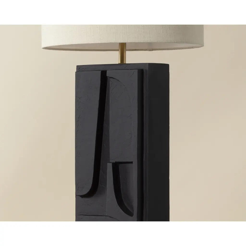 Abstract shapes carved into the base of the Dirsan Table Lamp give the design an artistic flair. Crafted from casted aluminum, this piece retains its sculptural look thanks to its black plaster finish.