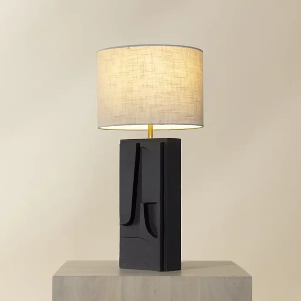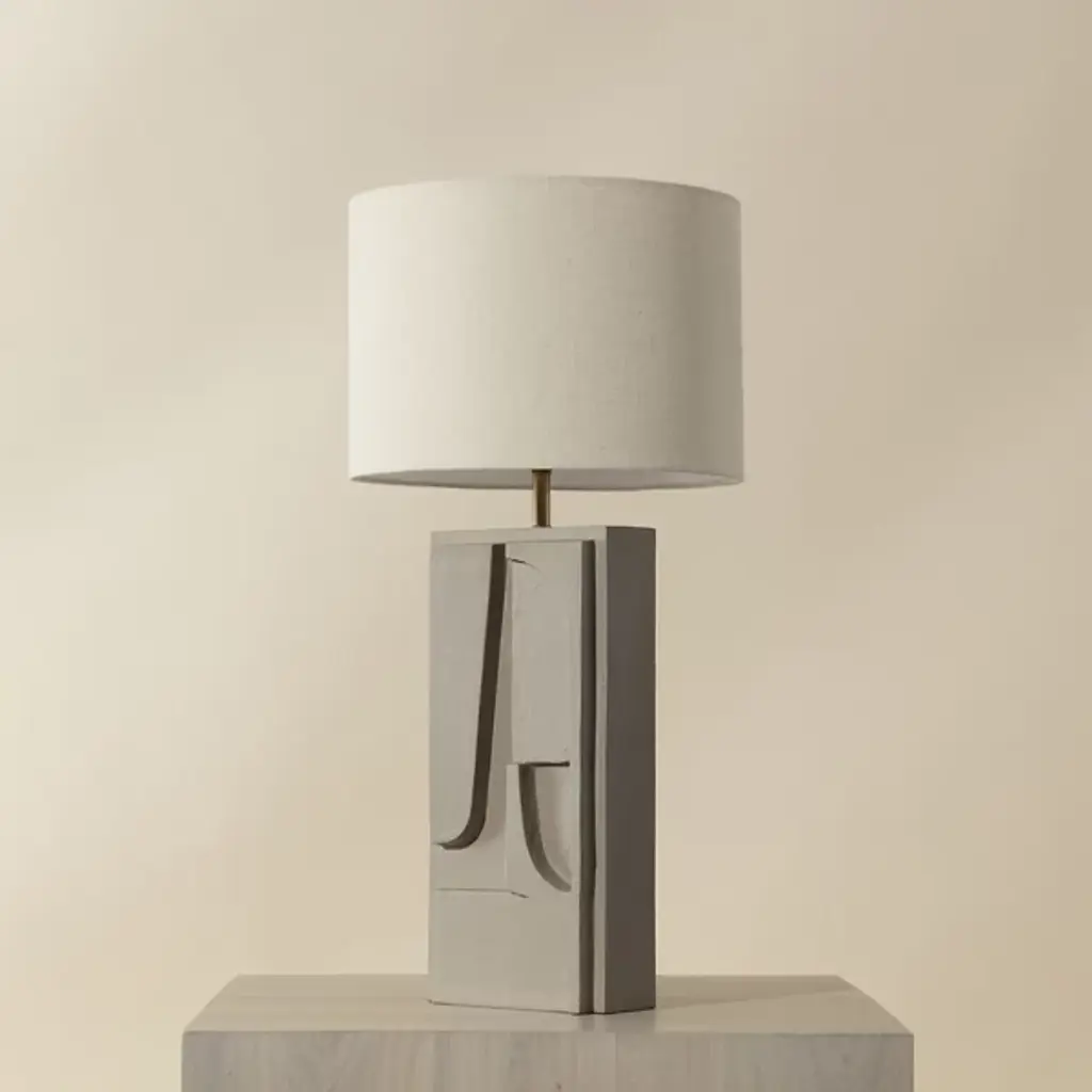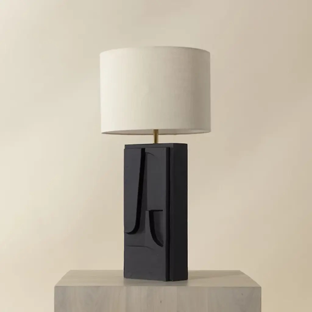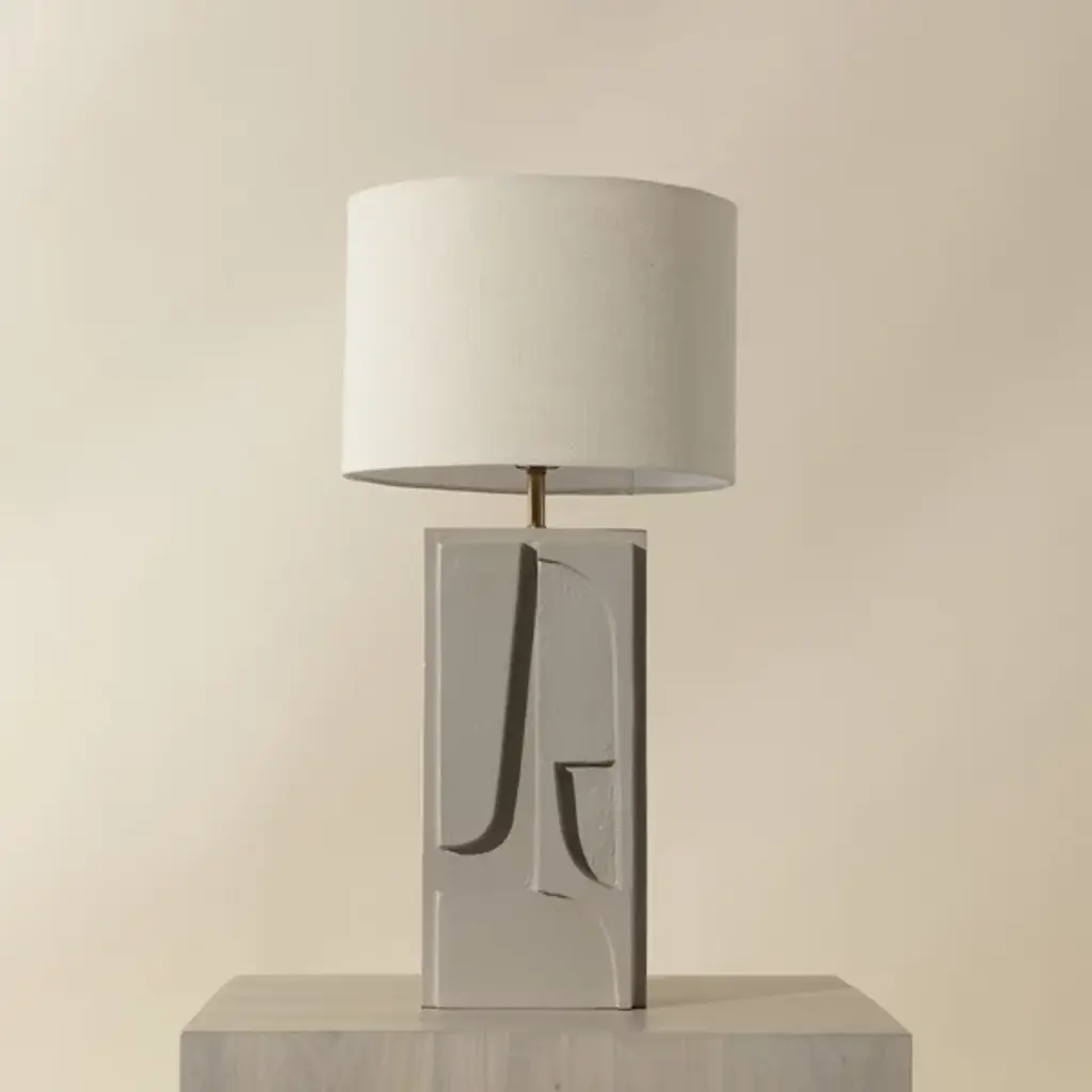 The Dirsan Table Lamp from Sunpan features abstract shapes carved into its base, giving the design a unique artistic flair. It is crafted from casted aluminum, and this lamp showcases a sculptural look that is both modern and timeless. With a subtle texture, enhancing the overall aesthetic of the piece. This lamp provides functional lighting and a stunning decorative accent, making it a perfect addition to any contemporary or eclectic space.