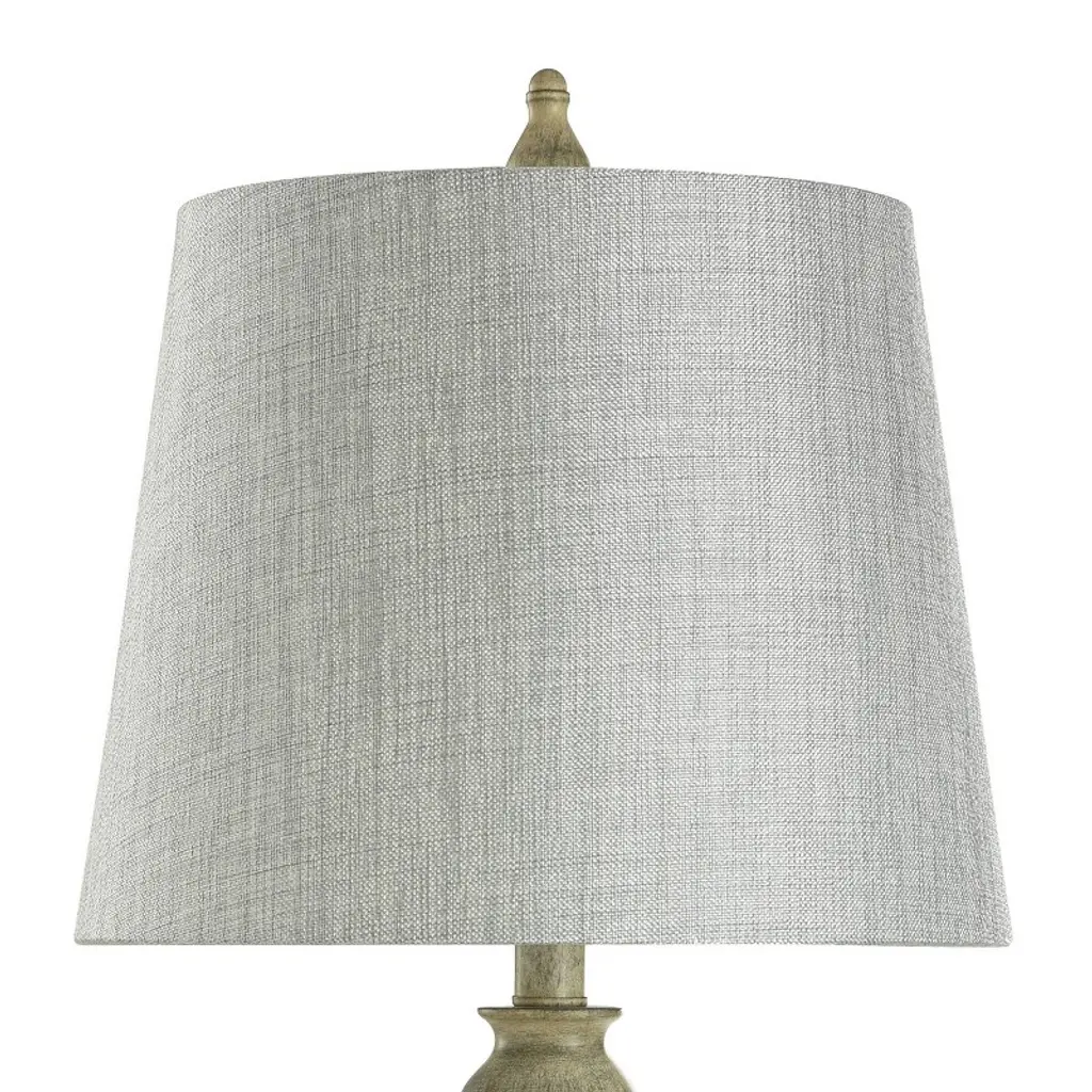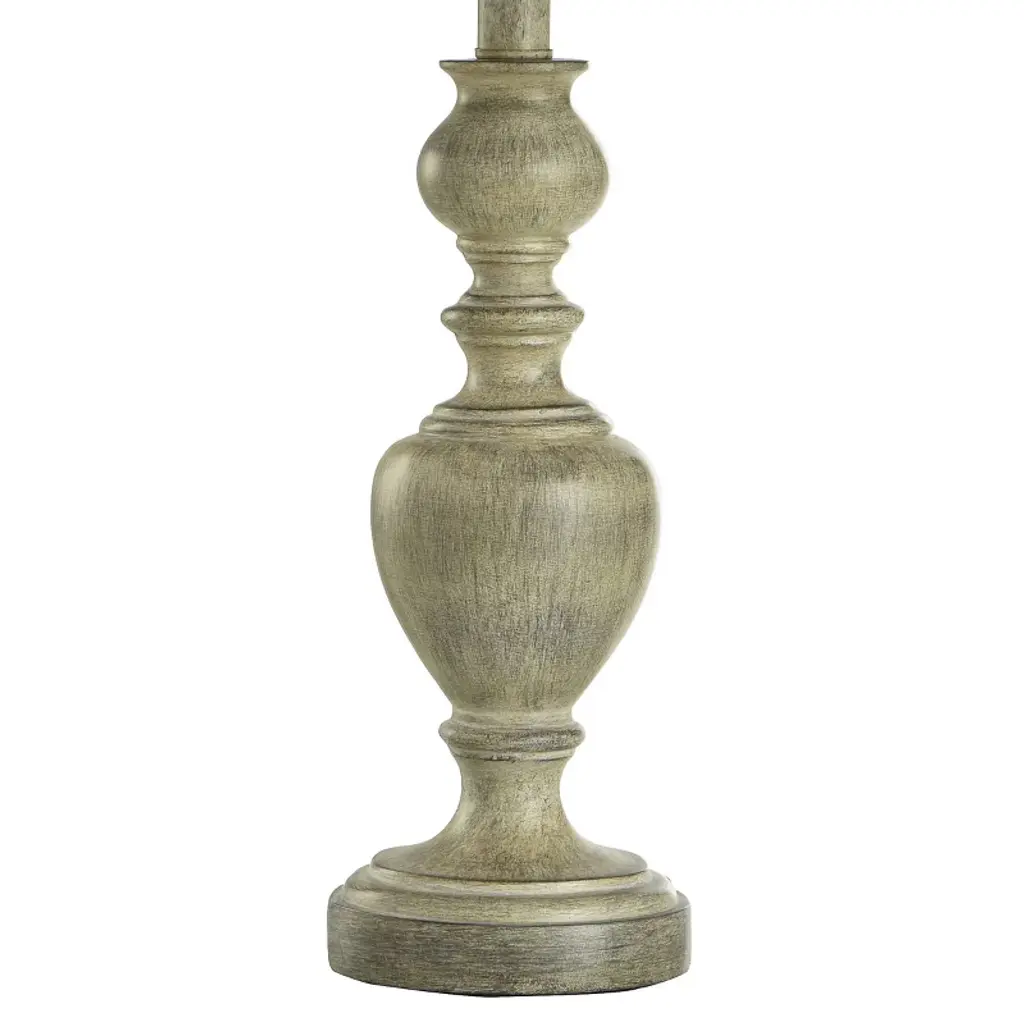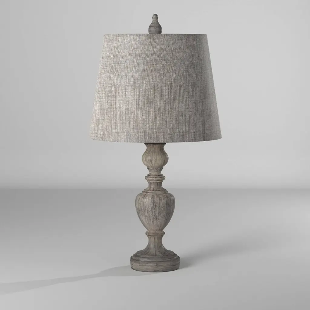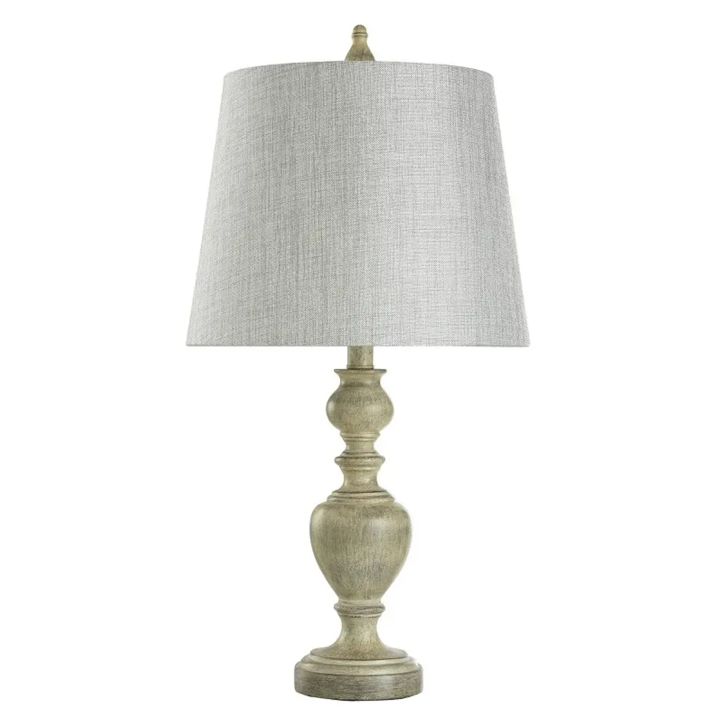 Add some charming illumination to your home with the Carol table lamp. The poly resin body, which is adorned with a metal turn knob in brush nickel, comes with a cream and distressed gray finish. A classic round, hardback shade will make this one lamp people remember when they step foot in your family room.