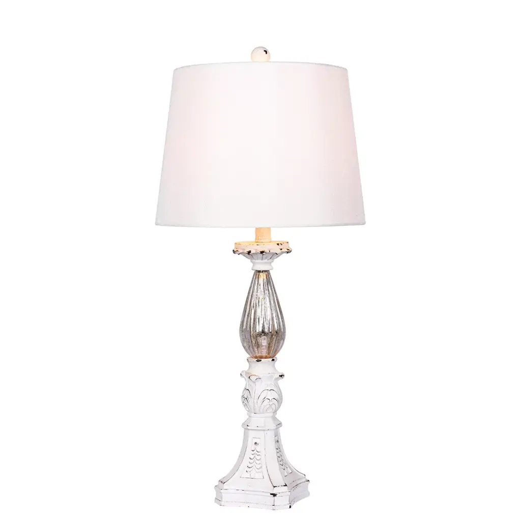 Bring a touch of vintage-inspired flair to your living space with this Mercury-Glass Table Lamp from Fangio Lighting. This antique white table lamp features a white lampshade supported by a filigree-candlestick and mercury-glass base, with allover distressed detailing completing the antique look. Place this table lamp on your side table, coffee table and more — you'll bring steady light and timeless flair to any room in your home.