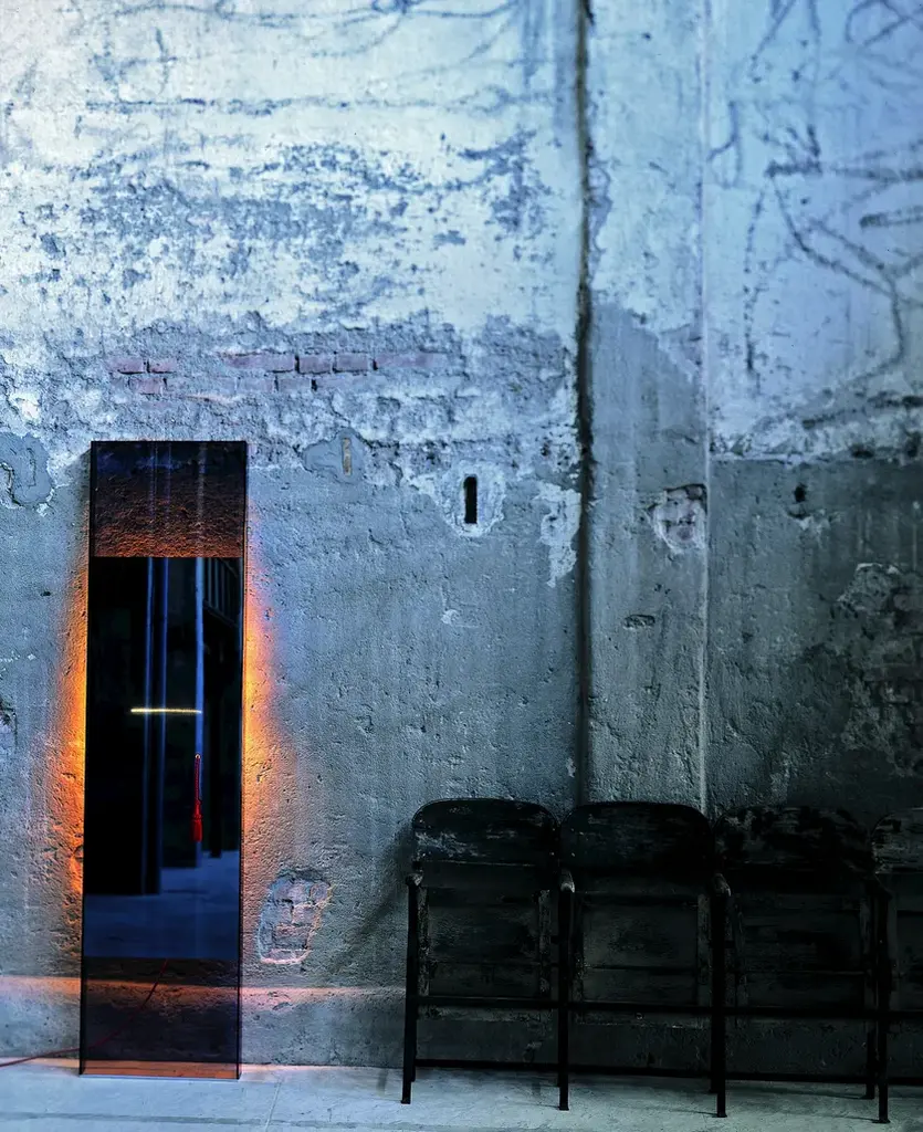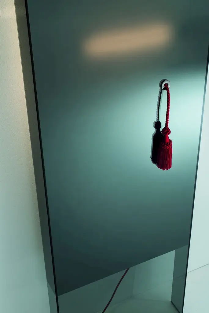 Diva is a standing mirror realized in glued smoked glass. The upper and lower part is transparent while the central part has a special mirroring effect through which the luminous trace of a lamp placed on the backside can be seen. It is possible to switch on and off the lamp by pulling a red cord.Attention, when the light is switched on, small marks can appear on the mirror. These are an intrinsic feature of the special semi-covering silver plating.