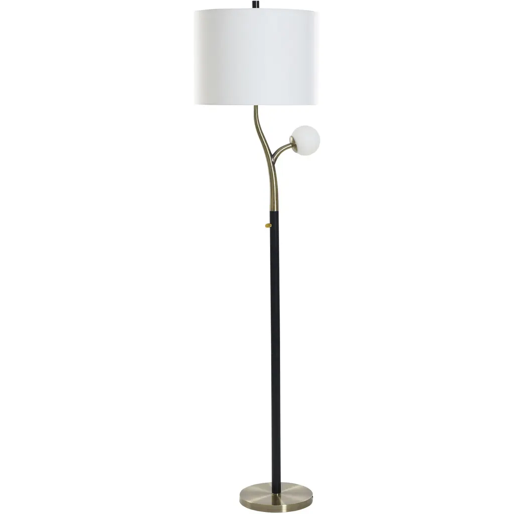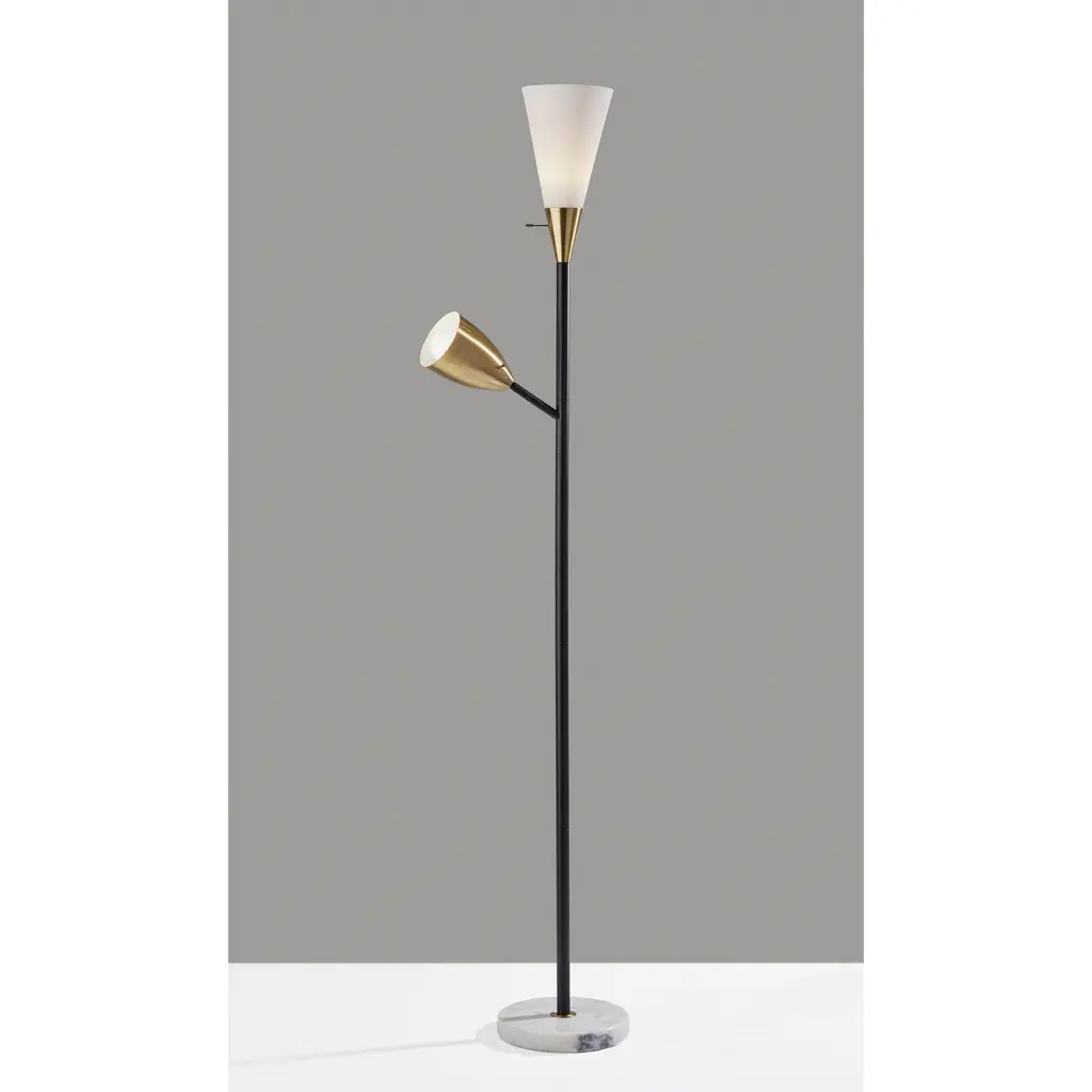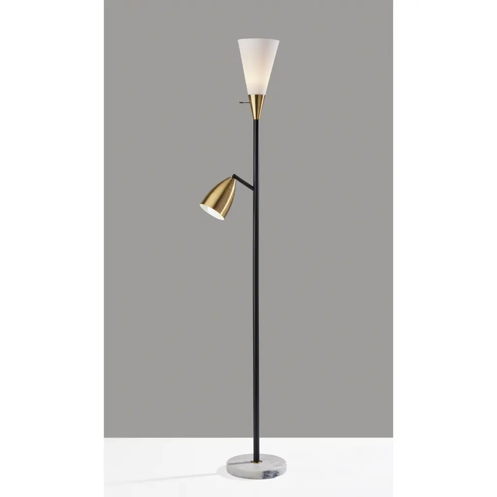 The Dixon combo torchiere floor lamp combines high quality materials to create a unique modern chic design. At 70.5″ tall and a mere 14.5″ deep, the lamp's compact footprint provides convenient lighting to smaller spaces. A 10″ round white marble base supports a long pole in a black metal finish. The lamp is topped by a frosted glass cone-shaped shade with an antique brass base to softly diffuse light from a 100W bulb (not included). Branching from the lamp's pole is a second, all-antique brass cone-shaped shade. The shade features an articulation point to easily direct the light from a 40W bulb (not included) wherever it's needed. Each light is operated by a rotary switch located on the sockets. Complete your décor with the coordinating Dixon 3-light torchiere floor lamp. Features: Black and brass metals are mixed to create a striking, mid-century modern look. A frosted glass cone shaped shades provide soft, ambient room filling light while a metal shade also provides task, directive lighting. A 10" round white marble base both elevates the look while also keeping the lamp sturdy on any surface. Operated by a rotary socket switch on each shade turning each light on and off. Additional Specs: Shade Dimensions: 6.75"TD x 2"BD x 9.75"H Shade Material: Frosted Glass Shade Shape: Cone Shade Fitter: Screw Down uno Tube Diameter: .625" & 1.5" Light Settings: On/Off & 3-Way Rotary Switch Bulb Required: 100W (top), 40W (bottom) Switch: Rotary Switch on each Socket Base Finish: White Marble Base Measurement: 10" Dia. Cord Length 60-inches