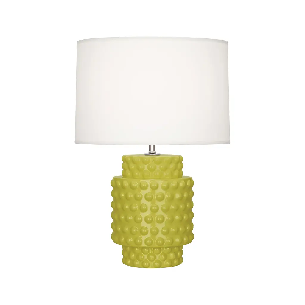 Citron Dolly Contemporary Accent LampFeaturesNumber of bulb: 1Bulb type: AMax wattage: 150WVoltage: 120VSocket: Medium Plated Sheet E26Switch: Full Range DimmerSwitch location: SocketFinish: Citron Glazed Textured CeramicShade: Fondine Fabric ShadeCord color: SilverUL listed: DryDimensionsShade dimensions: 14.5 inches top x 15 inches bottom x 9.5 inches down sideBase dimensions: 10.25 inch height x 6 inches width x 6 inches depth
