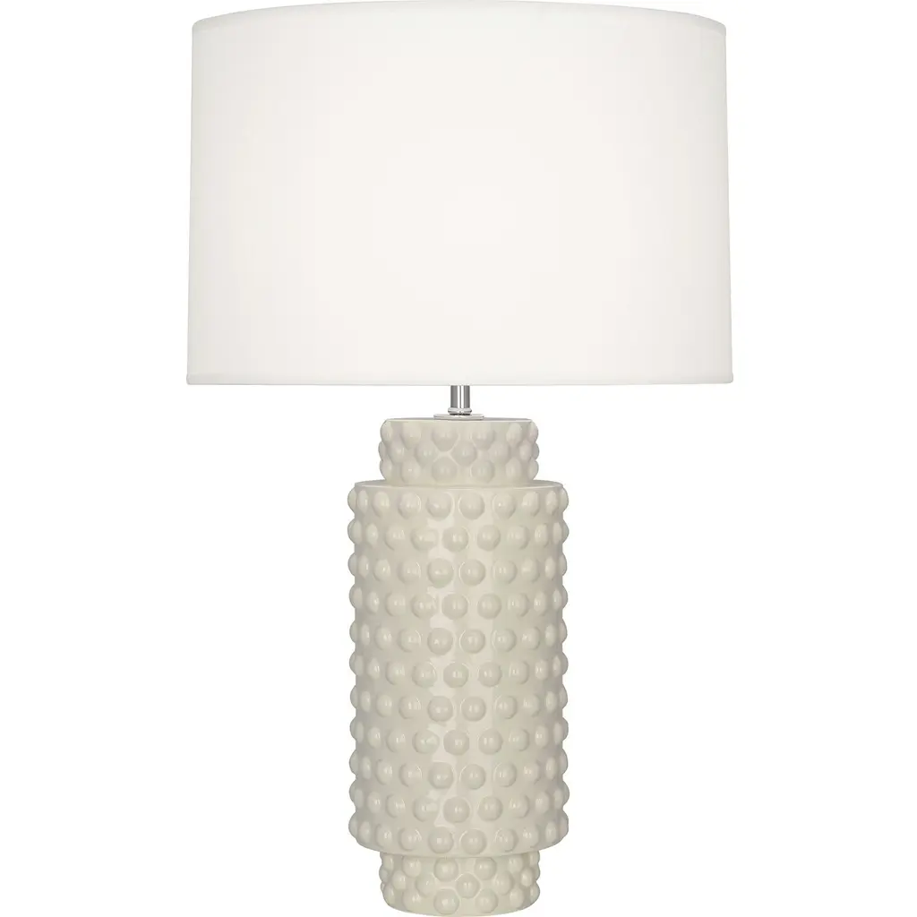 Lily Dolly Contemporary Accent LampFeaturesNumber of bulb: 1Bulb type: AMax wattage: 150WVoltage: 120VSocket: Medium Plated Sheet E26Switch: Full Range DimmerSwitch location: SocketFinish: Lily Glazed Textured CeramicShade: Fondine Fabric ShadeCord color: SilverUL listed: DryDimensionsShade dimensions: 14.5 inches top x 15 inches bottom x 9.5 inches down sideBase dimensions: 10.25 inch height x 6 inches width x 6 inches depth