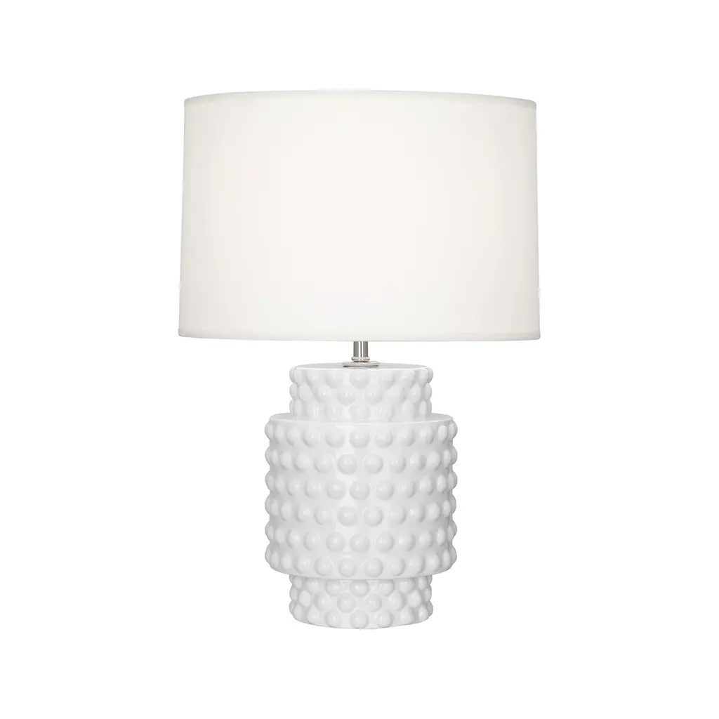 The Dolly Accent Table Lamp from Robert Abbey blends classic elements with a fresh, contemporary spirit. Its short, stout frame features simple cylindrical shapes adorned with playful bubbles, creating a unique texture that catches the eye. Paired with a Fondine fabric shade, this lamp delivers warm, focused accent lighting that adds a touch of youthful wonder and whimsy to any space. Perfect for brightening your room with style and charm. Highlights