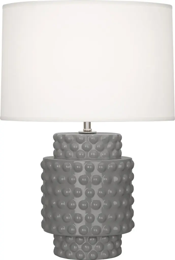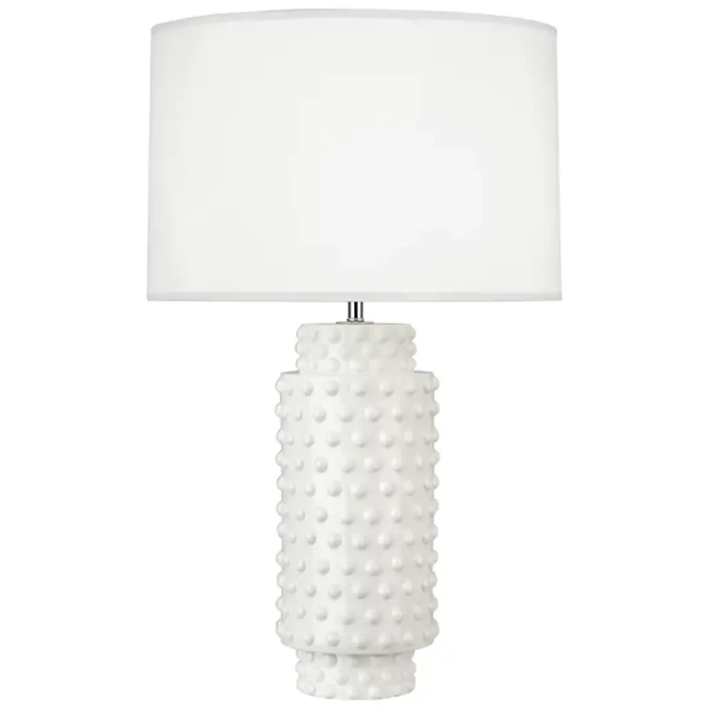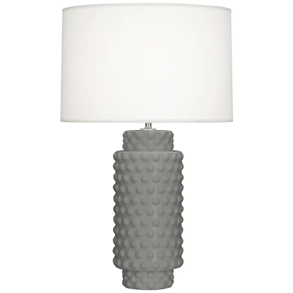 A true doll of a table lamp, with a whimsical appeal sure to bring out the child in any customer. Bring home the Dolly Table Lamp by Robert Abbey, a lively and fun table lamp that will liven up your space with its look and charm. Its frame is simple yet distinctive, with low key cylindrical shapes pockmarked with round bubbles. A simple cylindrical Fabric shade contrasts beautifully and starkly with the colorful vibe of the base.
