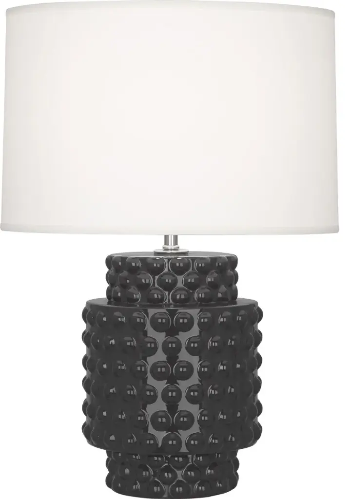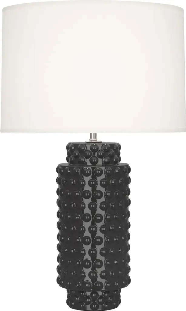 A true doll of a table lamp, with a whimsical appeal sure to bring out the child in any customer. Bring home the Dolly Table Lamp by Robert Abbey, a lively and fun table lamp that will liven up your space with its look and charm. Its frame is simple yet distinctive, with low key cylindrical shapes pockmarked with round bubbles. A simple cylindrical Fabric shade contrasts beautifully and starkly with the colorful vibe of the base.