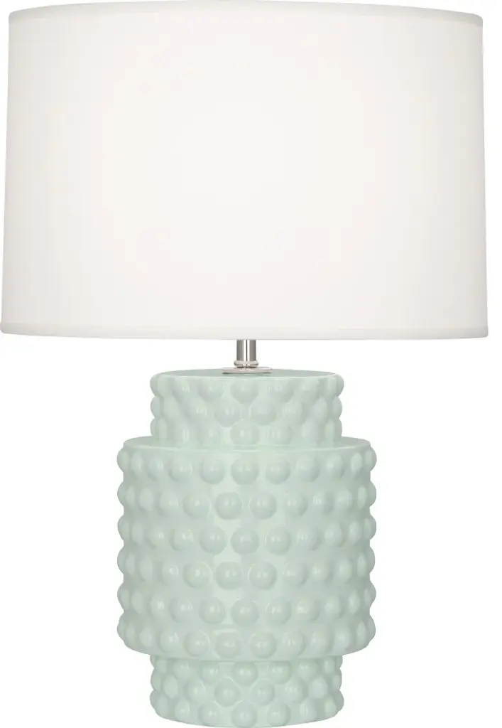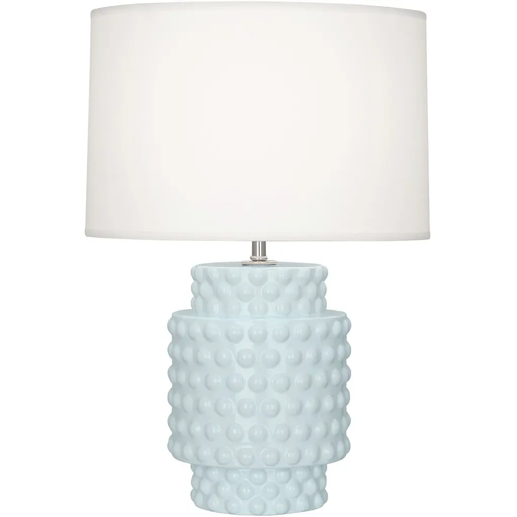 A true doll of a table lamp, with a whimsical appeal sure to bring out the child in any customer. Bring home the Dolly Table Lamp by Robert Abbey, a lively and fun table lamp that will liven up your space with its look and charm. Its frame is simple yet distinctive, with low key cylindrical shapes pockmarked with round bubbles. A simple cylindrical Fabric shade contrasts beautifully and starkly with the colorful vibe of the base.