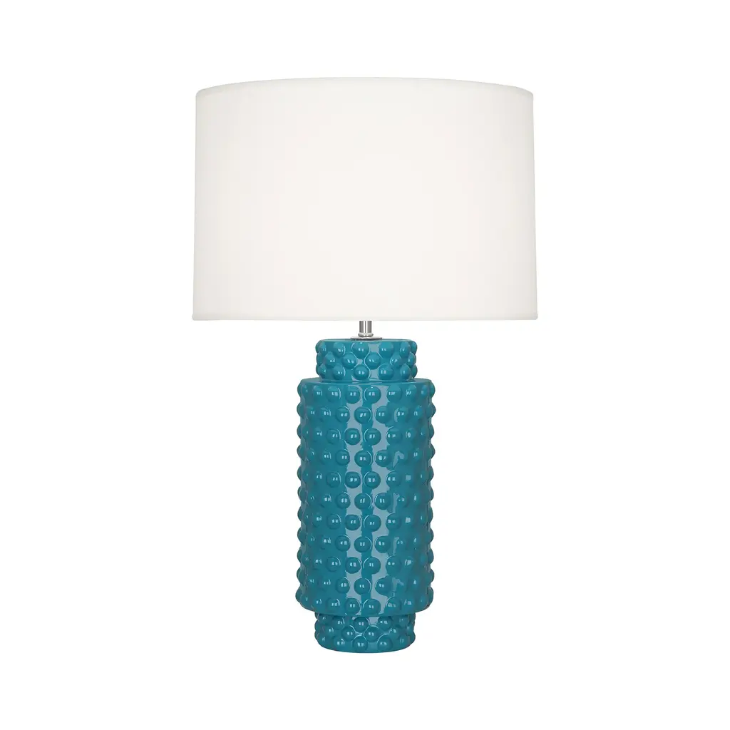 Egg Blue Dolly Contemporary Table LampFeaturesNumber of bulb: 1Bulb type: AMax wattage: 150WVoltage: 120VSocket: Medium Plated Sheet E26Switch: Full Range DimmerSwitch location: SocketFinish: Egg Blue Glazed Textured CeramicShade: Fondine Fabric ShadeCord color: SilverUL listed: DryDimensionsShade dimensions: 16.5 inches top x 17 inches bottom x 11 inches down sideBase dimensions: 15.25 inches height x 5 inches width x 5 inches depth