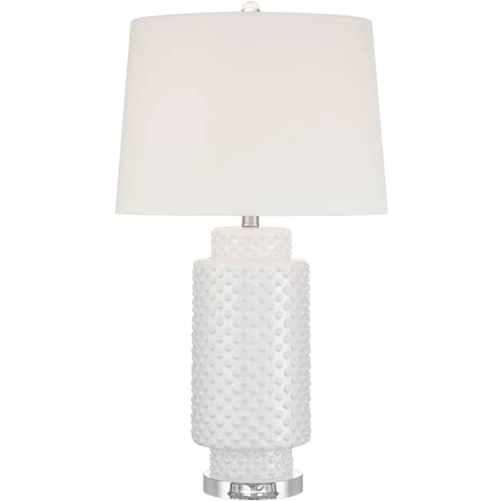 Lily Dolly Contemporary Table LampFeaturesNumber of bulb: 1Bulb type: AMax wattage: 150WVoltage: 120VSocket: Medium Plated Sheet E26Switch: Full Range DimmerSwitch location: SocketFinish: Lily Glazed Textured CeramicShade: Fondine Fabric ShadeCord color: SilverUL listed: DryDimensionsShade dimensions: 16.5 inches top x 17 inches bottom x 11 inches down sideBase dimensions: 15.25 inches height x 5 inches width x 5 inches depth