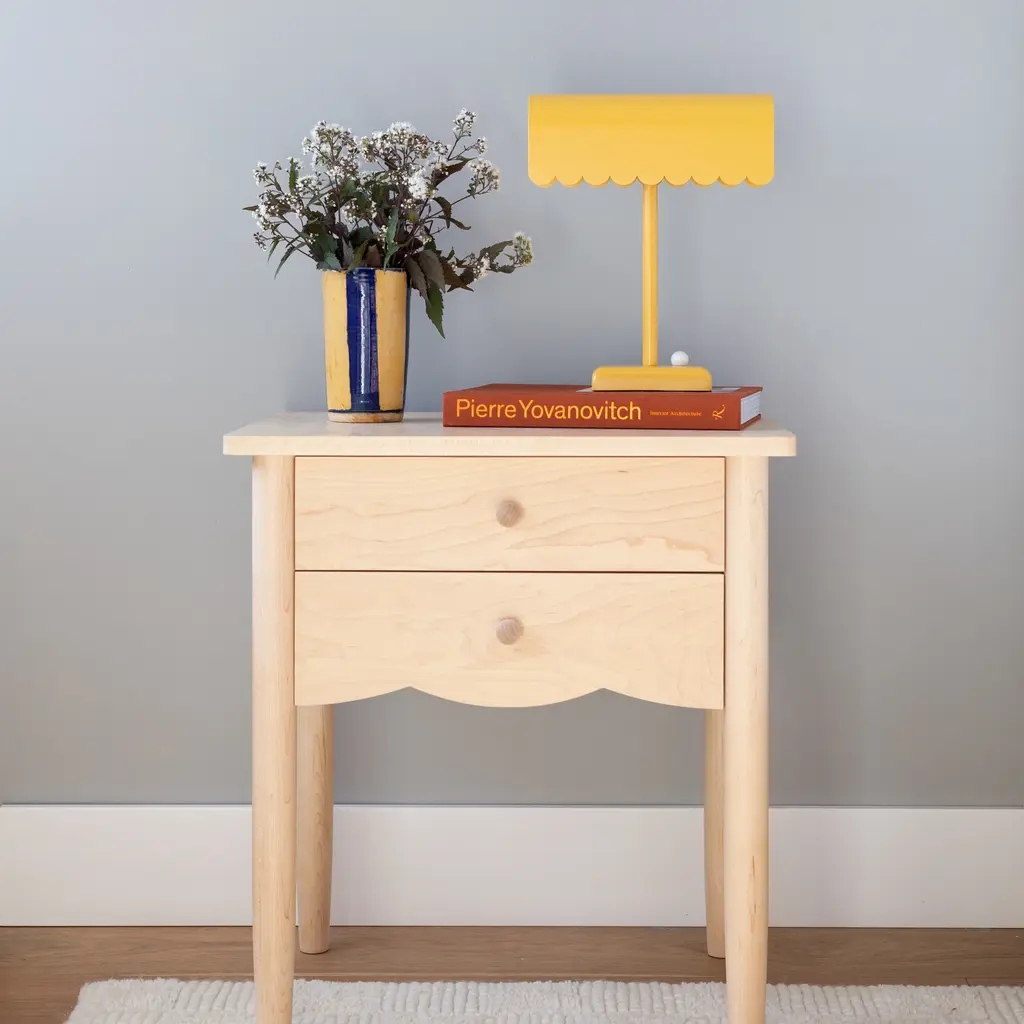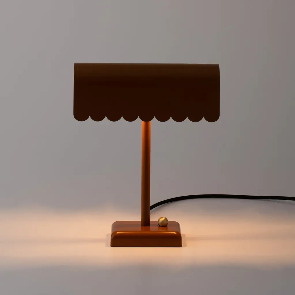 Stay indoors and add a soft glow to your space with the Dolores Table Lamp. Inspired by the rhythmic patterns found in Shaker textiles, it has a scalloped edge and contrasting dimmer knob. Playful color options add to its charm.