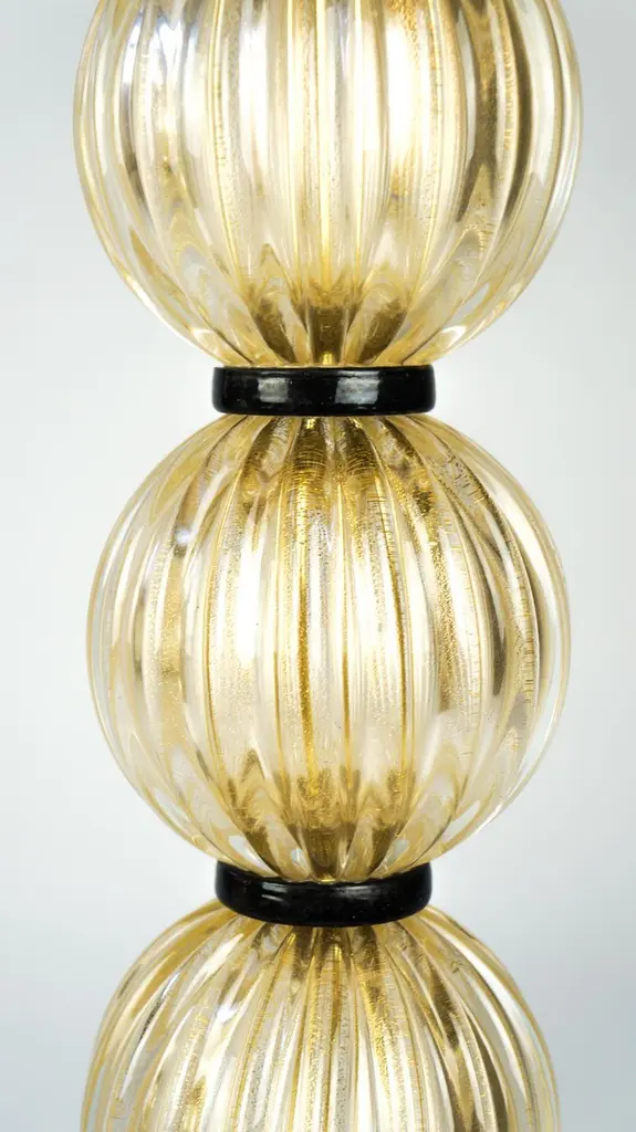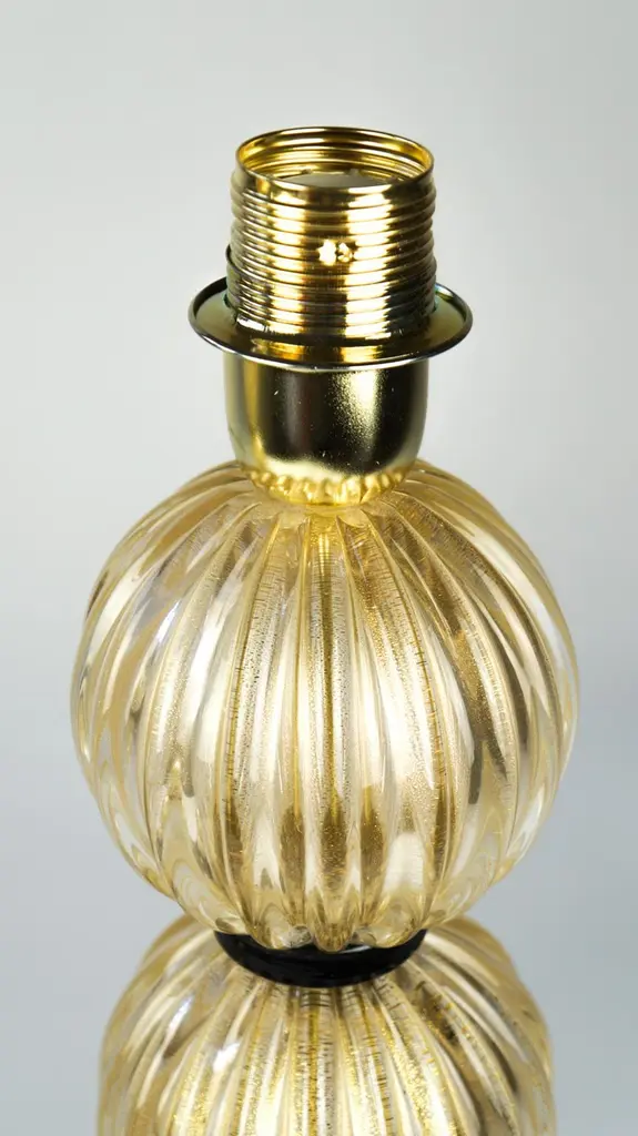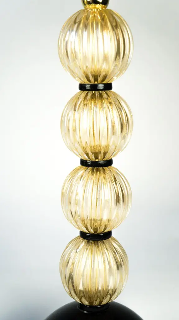 Composed by four gold 24-karat glass spheres, this lamp is, cosiderating only glass, 56.5 cm (inches 22.24)As you can see, the table lamp has three rings between all the spheres, that accentuate its form. It was created in 1985 by Alberto Donà.Glass workers blow the spheres that will be pierced by a place called “moleria”. Its peculiarity is its base that make it soar this its curve forme.A vintage lamp in which the light passed between the gold enphatinsing it and creating a beautiful effect.Lamps signed on the bottom: Alberto Donà Murano.The products are entirely handmade in style Mid-Century Modern.The price of the item includes professional and tailored packing.Lamps can be rewired for your country code.