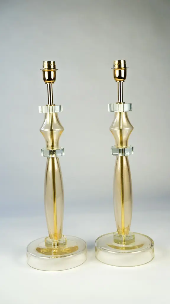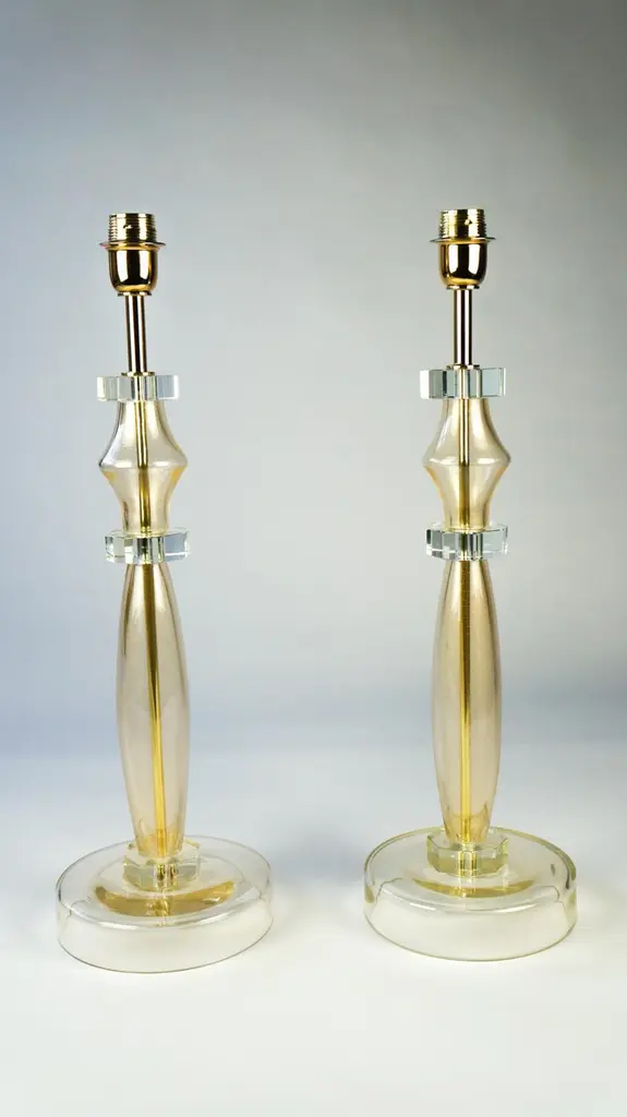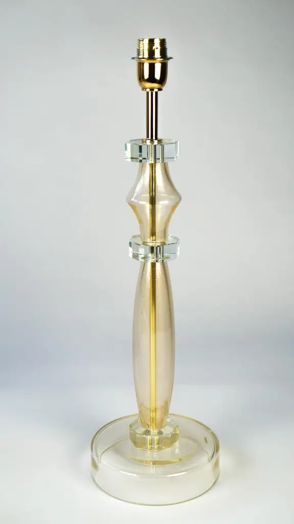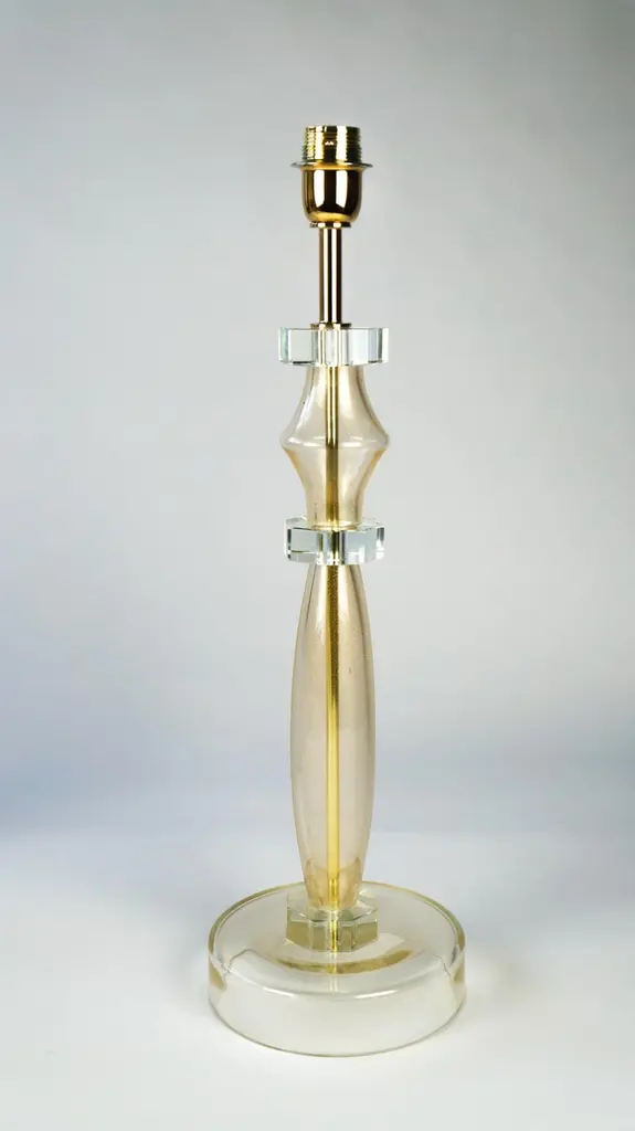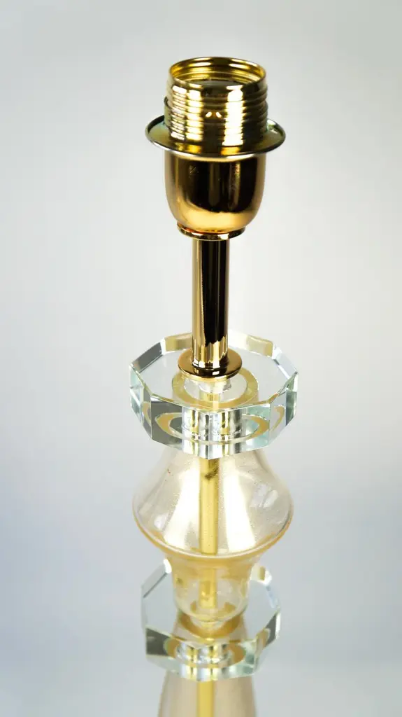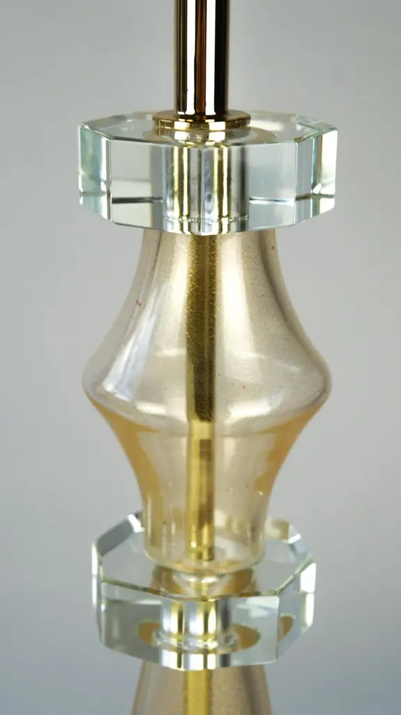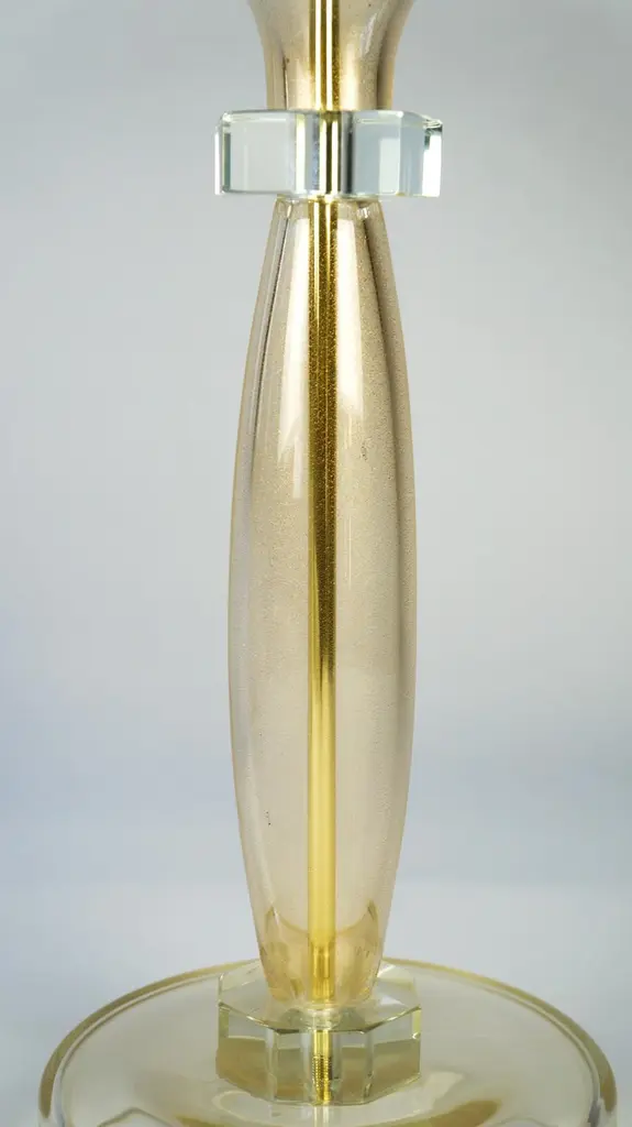 This beautiful lamp was designed in 1978 by Alberto Donà and cannot be missed.Majestic for the lightness it transmits, it is a sinuous and slender lamp, formed by a cylindrical base that supports a neck that has a taper on both sides. In turn, the latter supports a glass prism divided by the neck of the lamp thanks to two faceted crystal glass rings.These rings reflect light creating wonderful light effects that match perfectly with the 24k gold of the lamp.The Lamp is 51 cm high (considering only glass)The products are entirely handmade in style Mid-Century Modern.The price of the item includes professional and tailored packing.Lamps can be rewired for your country code.