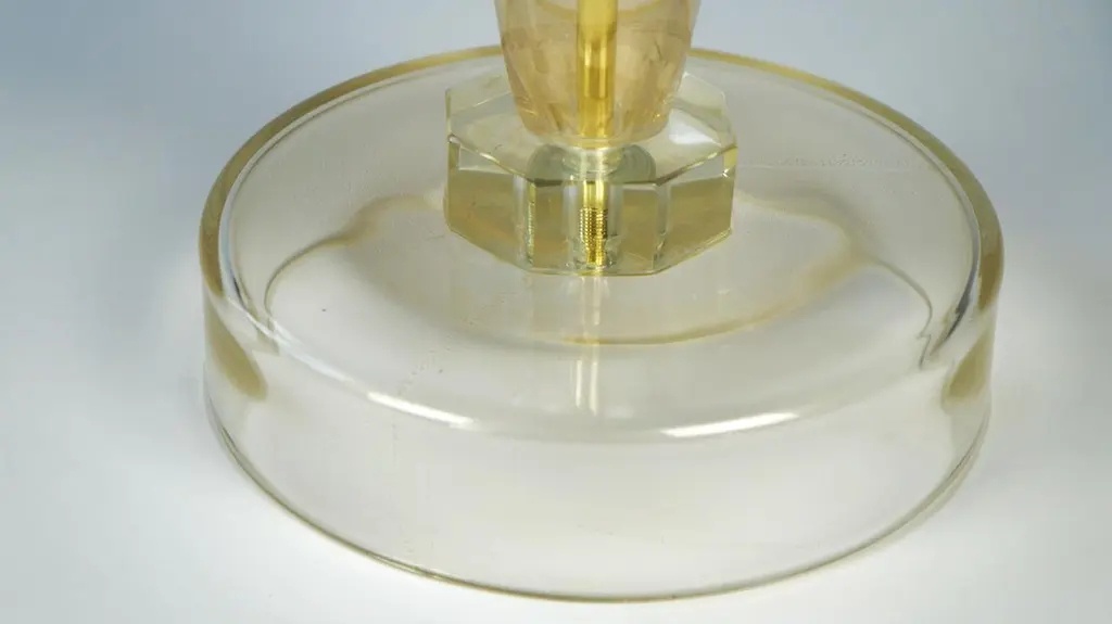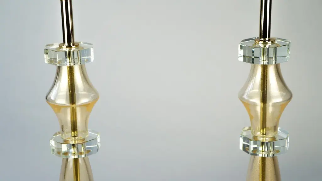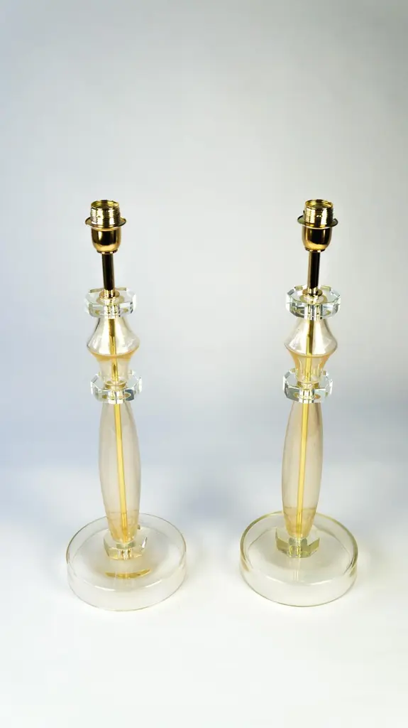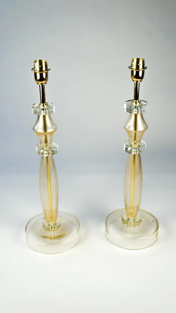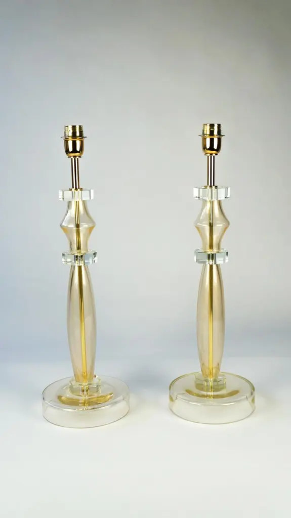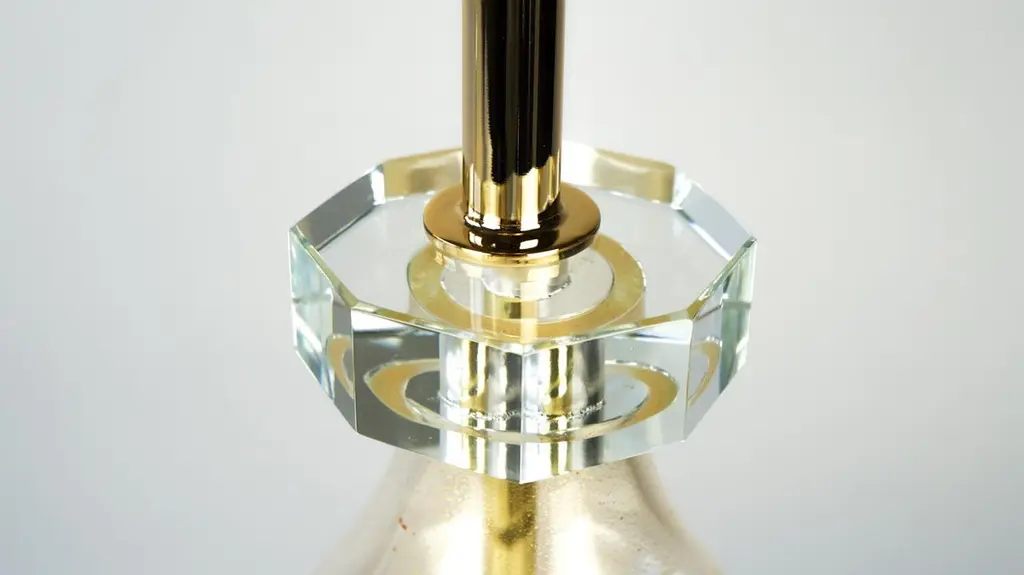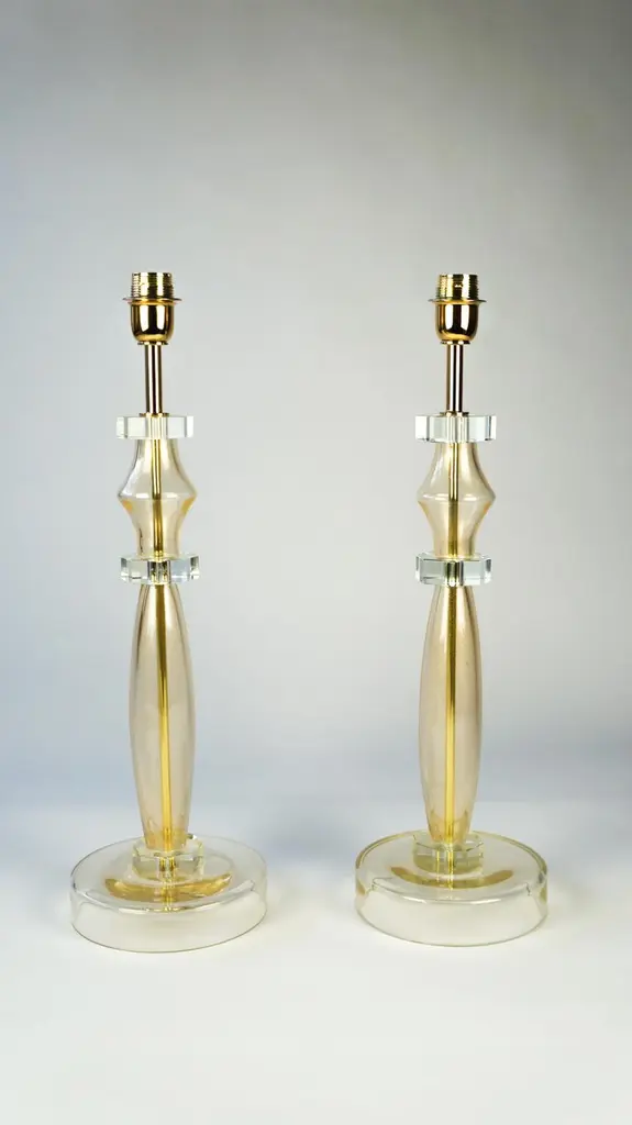 This beautiful lamp was designed in 1978 by Alberto Donà and cannot be missed.Majestic for the lightness it transmits, it is a sinuous and slender lamp, formed by a cylindrical base that supports a neck that has a taper on both sides. In turn, the latter supports a glass prism divided by the neck of the lamp thanks to two faceted crystal glass rings.These rings reflect light creating wonderful light effects that match perfectly with the 24k gold of the lamp.The Lamp is 51 cm high (considering only glass)The products are entirely handmade in style Mid-Century Modern.The price of the item includes professional and tailored packing.Lamps can be rewired for your country code.