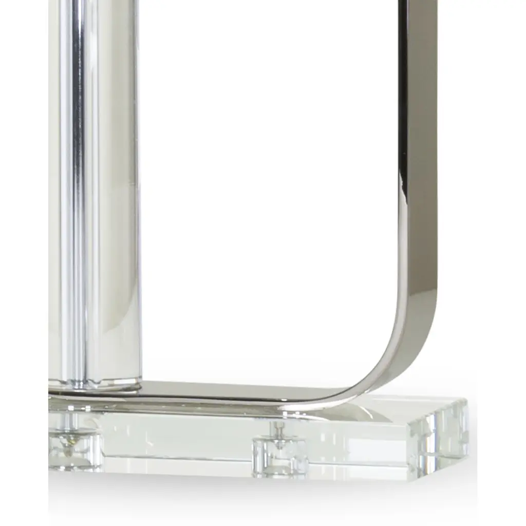 A crystal column and base act as anchors for the Polished Nickel "D" frame in this table lamp, which is also available in a 'brother" option with a flipped silhouette. A White linen shade tops both options. Combine them to make a pair to flank a bed or an entryway table. Also available in an Antique Brass finish.