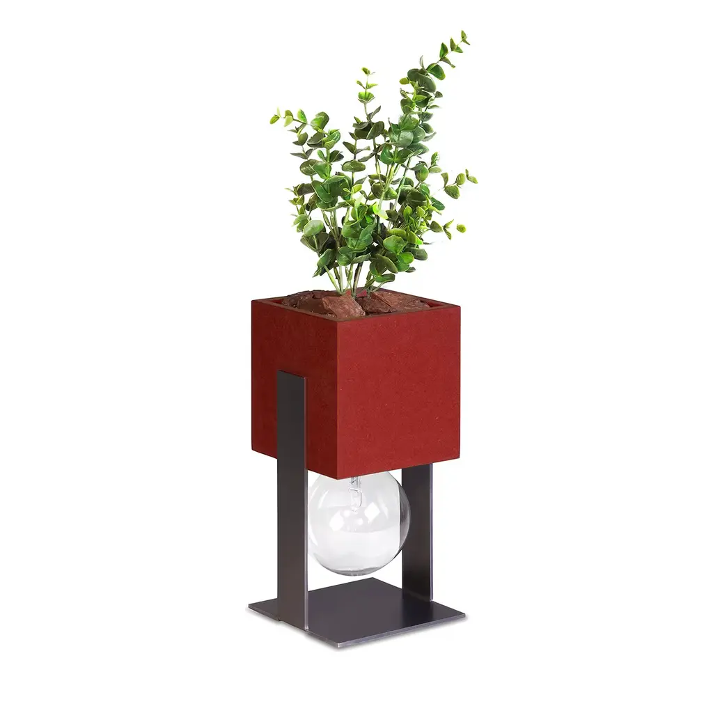This impressive ultra-modern table lamp incorporates elegance in a functional design. Doppiosenso by Stefano Mazzucchetti showcases a chic black iron base supporting a vibrant red Valchromat crafted cube, with a bottom light fixture and ingenious upper container to house decorative ornaments, small plants, or practical items.