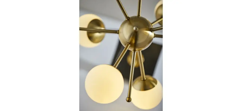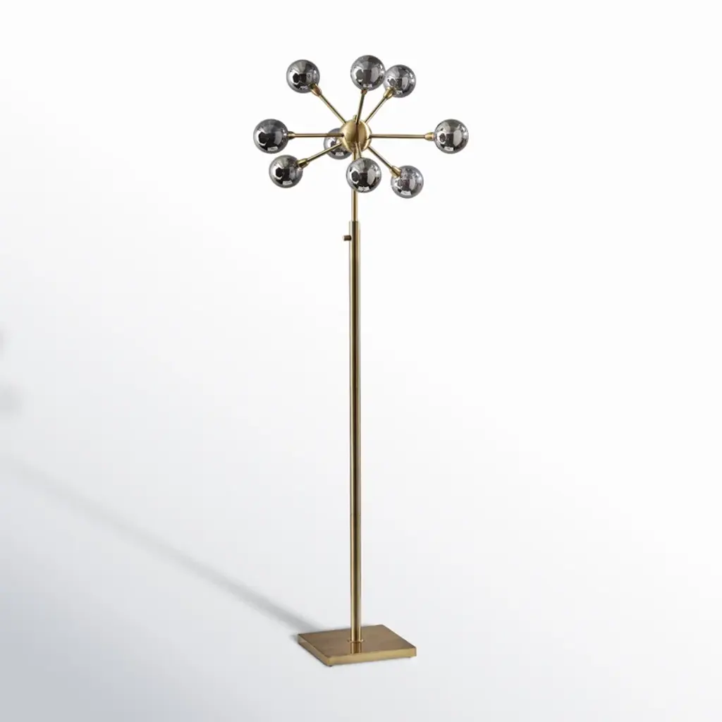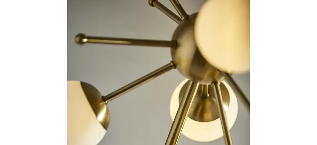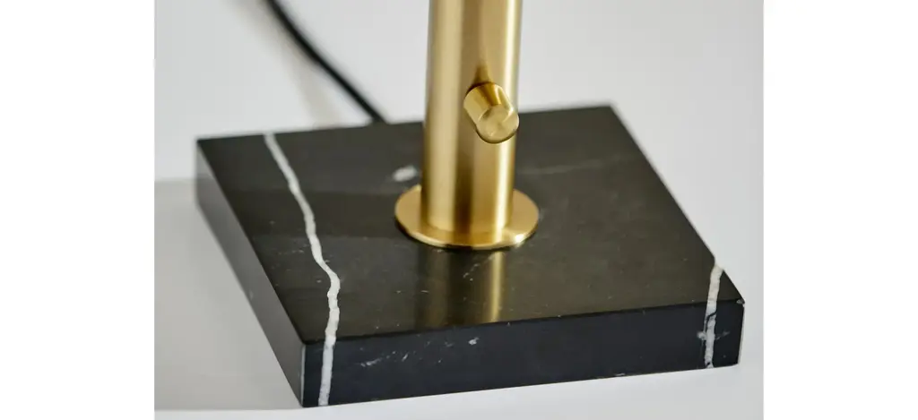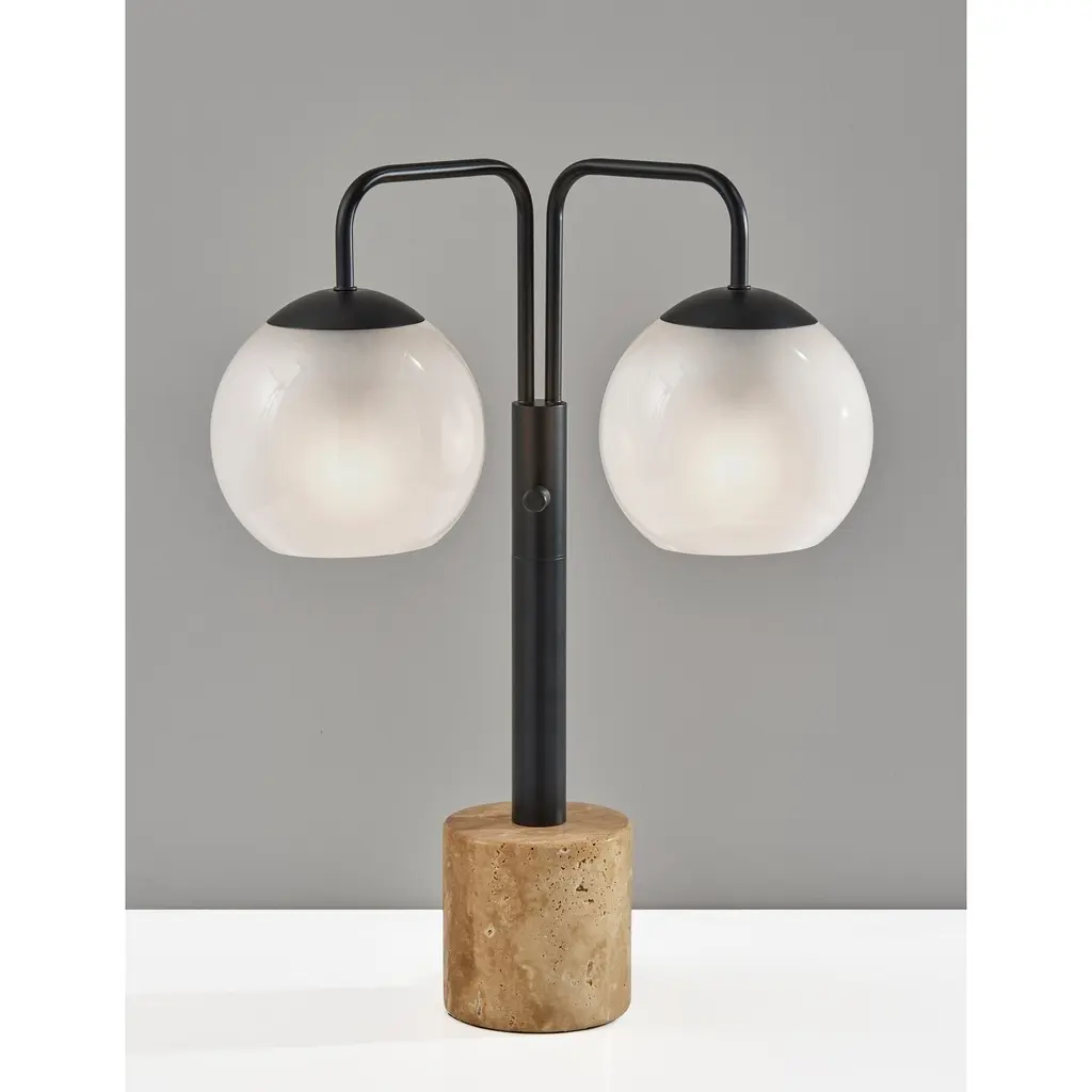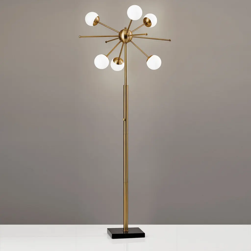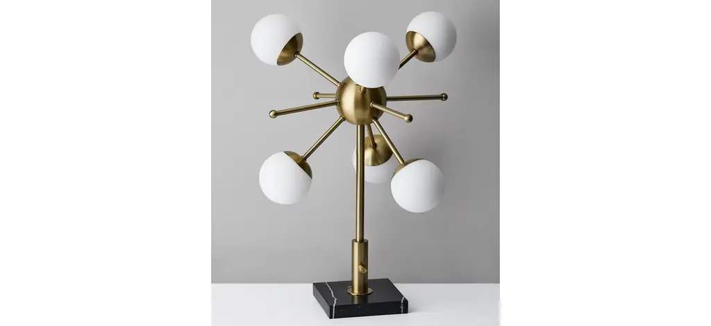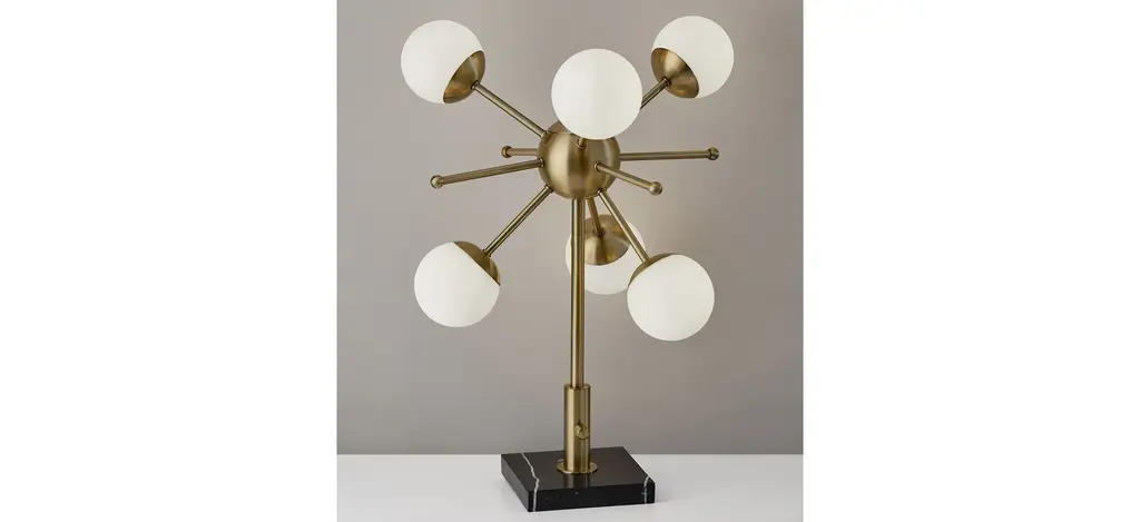 The Doppler LED Table Lamp has mid-century modern inspiration. Six white opal glass globe shades are clustered together to create a beautiful and eye-catching burst of light. An antique brass finish is paired with a square black marble base. This table lamp ships with six G9 replaceable LED bulbs that give off a total of 1,200 lumens of warm, ambient lighting. The sleek look is finished off with a black fabric covered cord. Bulbs are included. This lamp is smart outlet compatible.