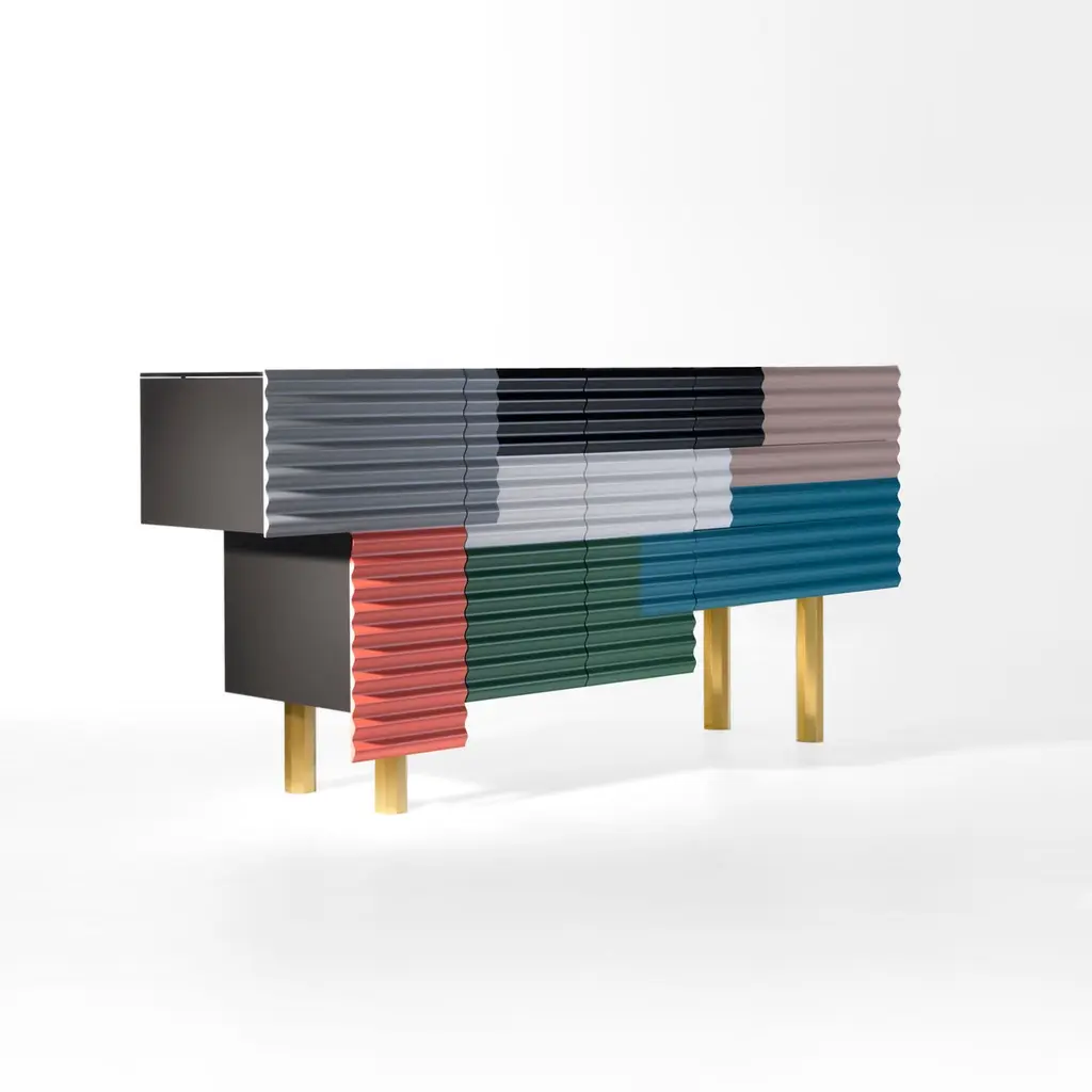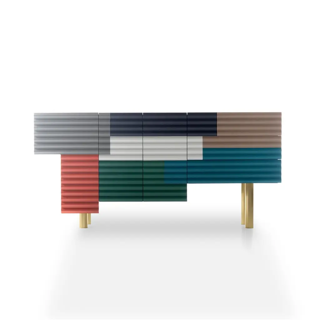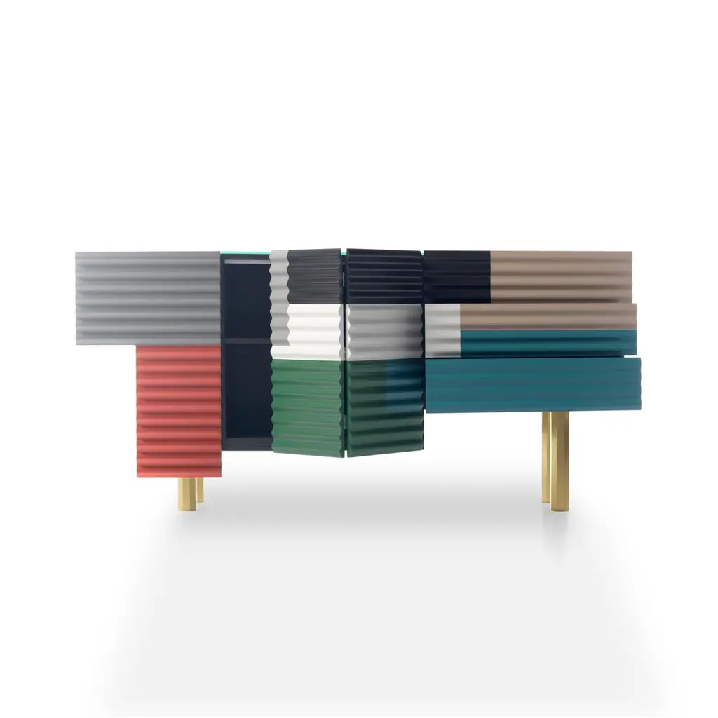Shanty cabinet designed by Doshi Levien in 2014 manufactured in Barcelona by BD.Shanty is inspired in the patchwork of corrugated steel sheets which are used to construct many temporary or provisional homes, which exist in the whole world. Its beauty lies in imperfection. This spontaneous composition of superimposed surfaces in different colours is recreated with a wavy front. Its body has an asymmetrical volume and each door opens differently.Materials:Containers: MDF in a matte lacquered finish.Doors: MDF with mechanised wave-form fronts, and matte lacquered finish.Glass top 8mmLegs: Gold extruded aluminumStructure: Tubular iron MODEL B: hinged door + drawersAvailable in Small Size and different colors.Dimensions:D 208 cm x W 52 cm x H 97.5 cmD 72 in x W 20.5 in x H 38.4 inAbout the designers:Doshi Levien is a London based design office, established in 2000 by Nipa Doshi and Jonathan Levien. Doshi Levien's work celebrates the hybrid and explores the coming together of cultures, technology, storytelling, Industrial Design and fine craftsmanship.Working across disciplines and industries, they make their own rules that are based on extracting as much richness as possible out of an idea. Doshi Levien work for a broad range of clients, including Moroso, Swarovski, Intel, Camper, Authentics, Cappellini and now BD Barcelona Design.About BD Barcelona:Accompanied with artisanal processes instead of mass production, their products always have more proximity to art than Industrial Design. Characterised by superior quality, short-series productions (and on occasion limited editions), and unique pieces due to crafted manufacturing. In the 70’s, BD pleasantly surprised by editing Gaudí’s furniture for his famous buildings and in the early 90’s, BD again astounded by introducing an exclusive first collection of furniture and lamps designed by Dalí. Recently the collections and designers with an accentuated artistic profile like Jaime Hayon and Doshi Levien, continue to point the way where design and art meet together. Design meets Art. Since 1972.