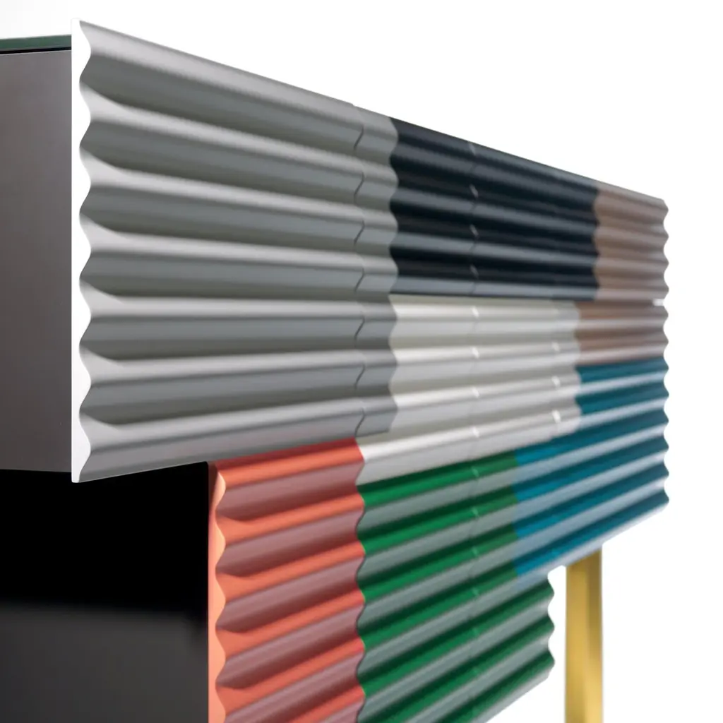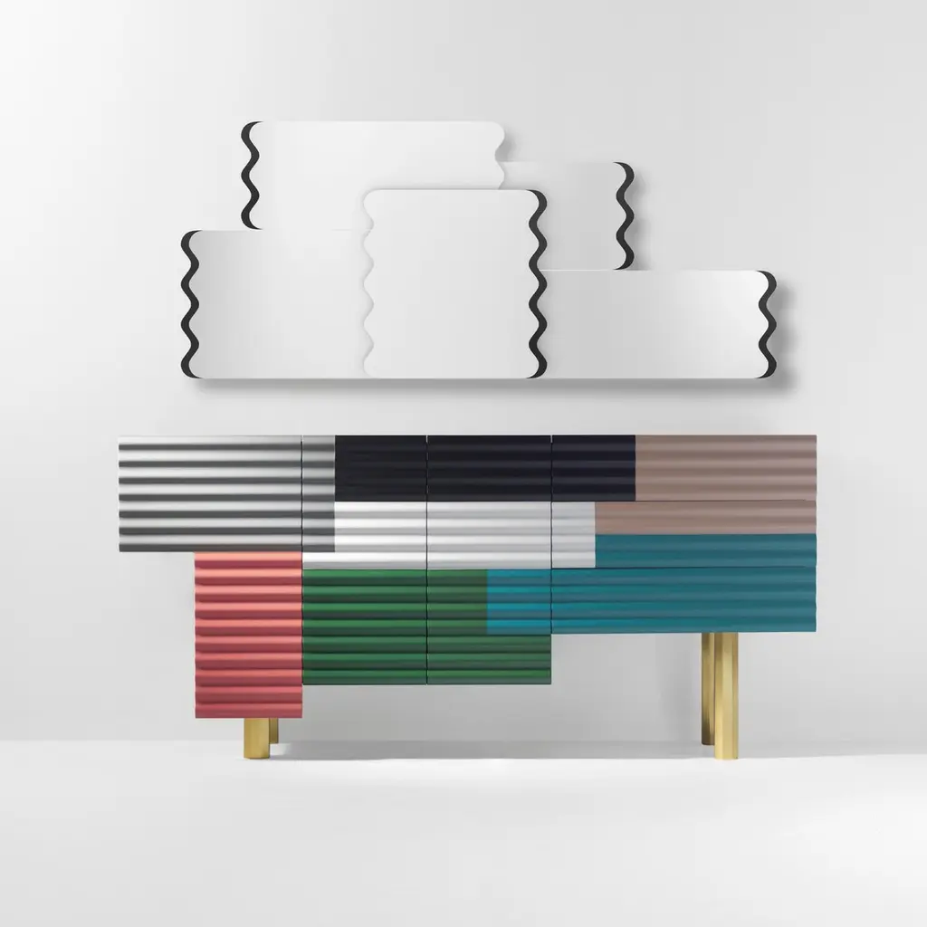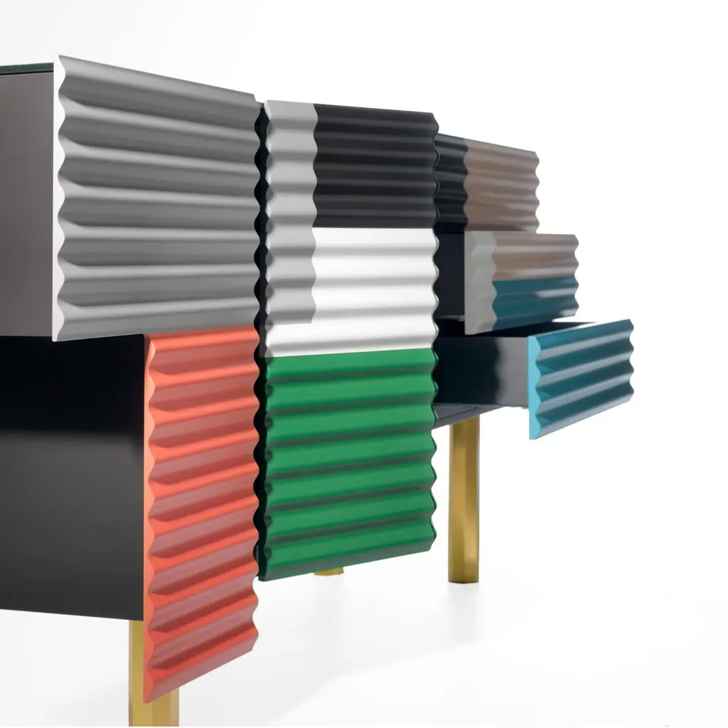 Shanty cabinet designed by Doshi Levien in 2014 manufactured in Barcelona by BD.Shanty is inspired in the patchwork of corrugated steel sheets which are used to construct many temporary or provisional homes, which exist in the whole world. Its beauty lies in imperfection. This spontaneous composition of superimposed surfaces in different colours is recreated with a wavy front. Its body has an asymmetrical volume and each door opens differently.Materials:Containers: MDF in a matte lacquered finish.Doors: MDF with mechanised wave-form fronts, and matte lacquered finish.Glass top 8mmLegs: Gold extruded aluminumStructure: Tubular iron MODEL B: hinged door + drawersAvailable in Small Size and different colors.Dimensions:D 208 cm x W 52 cm x H 97.5 cmD 72 in x W 20.5 in x H 38.4 inAbout the designers:Doshi Levien is a London based design office, established in 2000 by Nipa Doshi and Jonathan Levien. Doshi Levien's work celebrates the hybrid and explores the coming together of cultures, technology, storytelling, Industrial Design and fine craftsmanship.Working across disciplines and industries, they make their own rules that are based on extracting as much richness as possible out of an idea. Doshi Levien work for a broad range of clients, including Moroso, Swarovski, Intel, Camper, Authentics, Cappellini and now BD Barcelona Design.About BD Barcelona:Accompanied with artisanal processes instead of mass production, their products always have more proximity to art than Industrial Design. Characterised by superior quality, short-series productions (and on occasion limited editions), and unique pieces due to crafted manufacturing. In the 70’s, BD pleasantly surprised by editing Gaudí’s furniture for his famous buildings and in the early 90’s, BD again astounded by introducing an exclusive first collection of furniture and lamps designed by Dalí. Recently the collections and designers with an accentuated artistic profile like Jaime Hayon and Doshi Levien, continue to point the way where design and art meet together. Design meets Art. Since 1972.