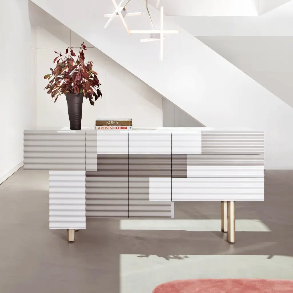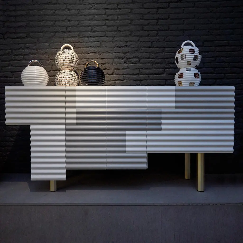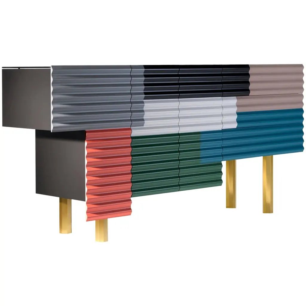 Shanty cabinet designed by Doshi Levien in 2014 manufactured in Barcelona by BD.Shanty is inspired in the patchwork of corrugated steel sheets which are used to construct many temporary or provisional homes, which exist in the whole world. Its beauty lies in imperfection. This spontaneous composition of superimposed surfaces in different colors is recreated with a wavy front. Its body has an asymmetrical volume and each door opens differently.Materials:Containers: MDF in a matte lacquered finish.Doors: MDF with mechanized wave-form fronts, and matte lacquered finish.Glass Top 8mmLegs: Gold extruded aluminumStructure: Tubular ironMODEL B: hinged door + drawersAvailable in small size and different colors.Dimensions:D 208 cm x W 52 cm x H 97,5 cmD 72 in x W 20.5 in x H 38.4 inProduction delay:8 weeks.About the designers:Doshi Levien is a London based design office, established in 2000 by Nipa Doshi and Jonathan Levien. Doshi Levien's work celebrates the hybrid and explores the coming together of cultures, technology, story telling, Industrial Design and Fine craftsmanship.Working across disciplines and industries, they make their own rules that are based on extracting as much richness as possible out of an IDEA. Doshi Levien work for a broad range of clients, including Moroso, Swarovski, Intel, Camper, Authentics, Cappellini and now BD Barcelona Design.About BD Barcelona:Accompanied with artisanal processes instead of mass production, their products always have more proximity to art than Industrial Design. Characterized by superior quality, short-series productions (and on occasion limited editions), and unique pieces due to crafted manufacturing. In the 1970s, BD pleasantly surprised by editing Gaudí’s furniture for his famous buildings and in the early 1990s, BD again astounded by introducing an exclusive first collection of furniture and lamps designed by Dalí. Recently the collections and designers with an accentuated artistic profile like Jaime Hayon and Doshi Levien, continue to point the way where design and art meet together. Design meets Art. Since 1972.