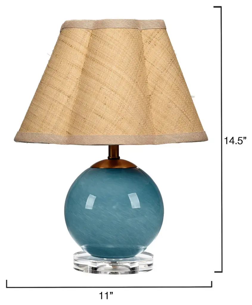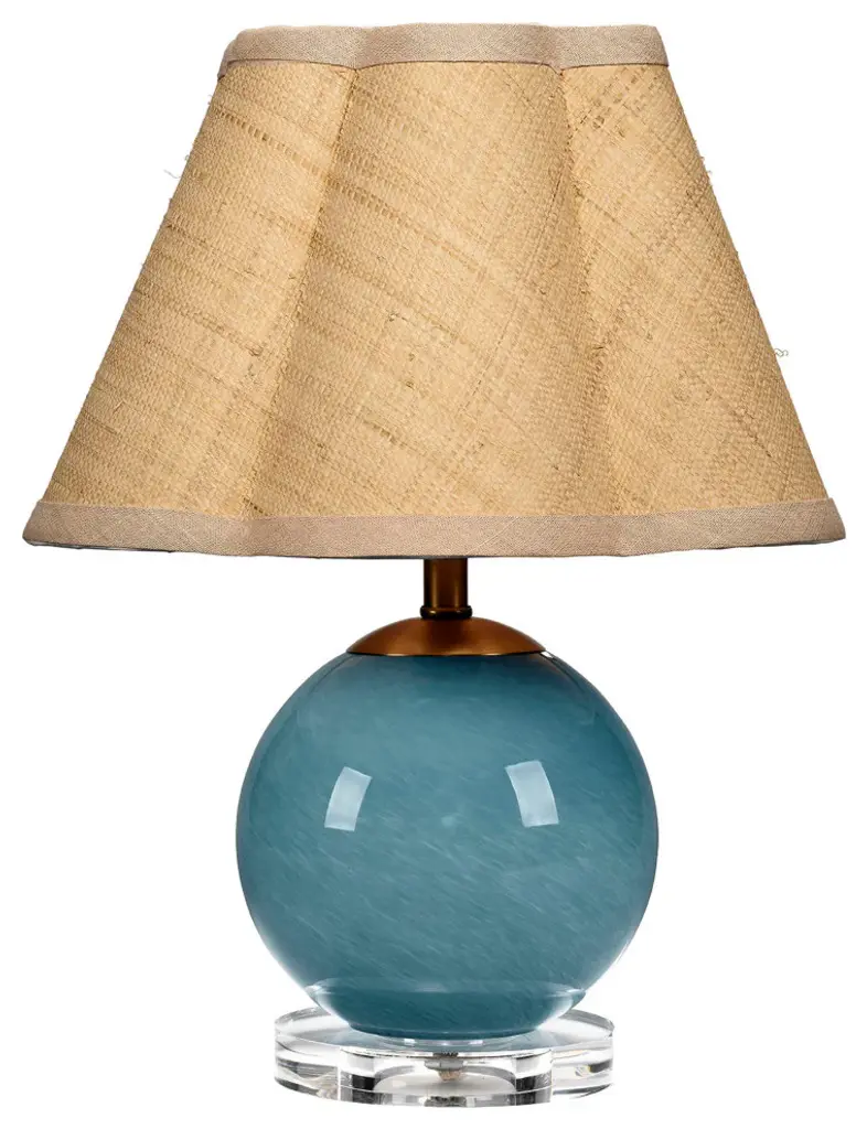 Brilliant baubles to brighten and lighten a bedroom, family room, or entryway, these charming lamps aren''t overly serious, but they are seriously well-made! Their round bases are handblown glass and rest atop a circle of crystal-clear acrylic. They are topped with softly scalloped shades that have been hand-trimmed. Made of hand-blown glassScalloped Cone, 100% Raffia Shade, Trim Edge, UNOAcrylic Base: 4.75"W x 4.75"D x 0.75"HUNO Socket; No Harp/FinialWhite SpiderCrafted of hand-blown glass, this lamp will feature subtle markings and variations in tone. These unique imperfections and variations are what define our products, with each piece having its own personality. Lamp Body Dimensions: 6"W x 6"D x 6"HShade Dimensions: 7.5"H x 11"W x 11"D, Top Diameter 5.5"1 bulb required; Bulb Not Included40 Max Wattage; Volts 110E26 Bulb Base Type 8 FT Clear Cord 1-Way Rocker Switch In LineNot Damp RatedCare Instructions: We do not recommend using harsh or abrasive cleaners at anytime as they can damage product. Wipe surfaces gently with a soft, dry cloth. If needed, you may use a lightly damp cloth with water only on base.