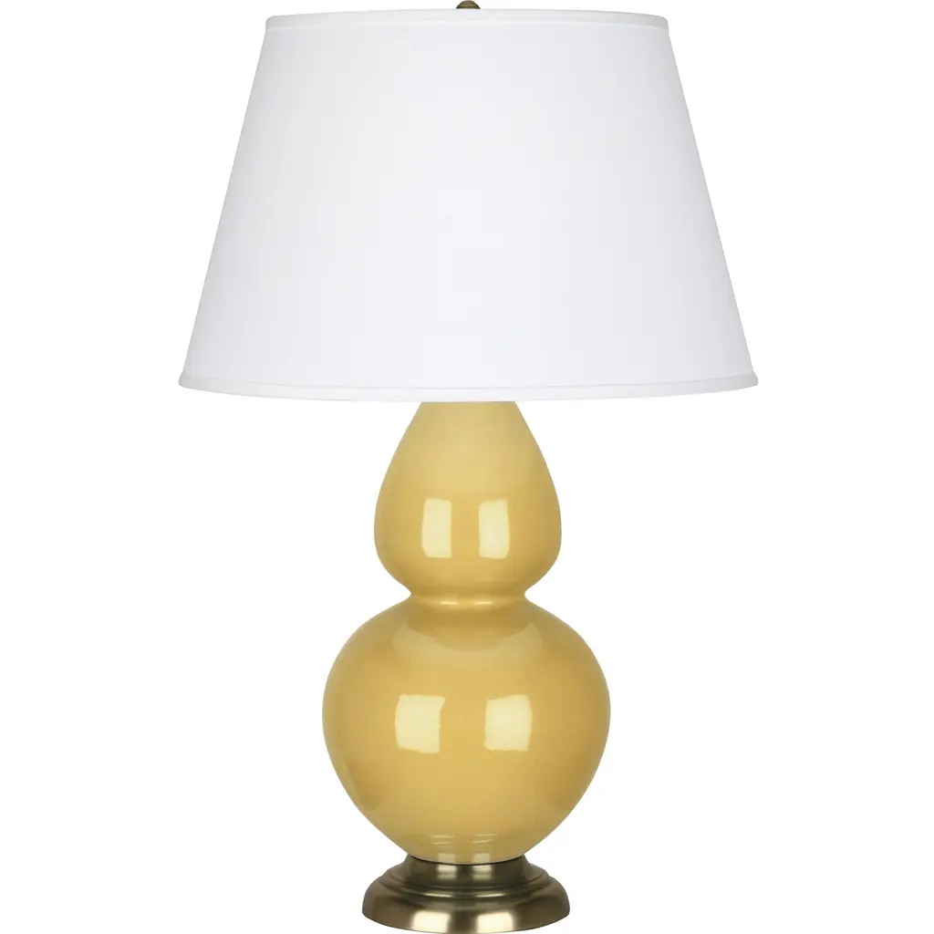 Daisy Glazed Ceramic With Antique Natural Brass Finished Accents Double Gourd Table Lamp With Pearl Dupioni Fabric Shade - Our Double Gourd collection features a simple but gracefully curving silhouette. Available in a wide array of vibrant colors and several different base finishes.