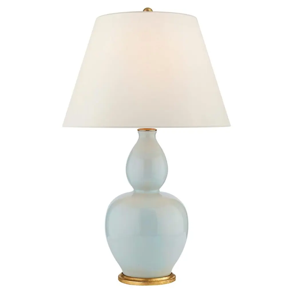 Baby Blue Double Gourd Contemporary Table LampFeaturesNumber of bulb: 1Bulb type: AMax wattage: 150WVoltage: 120VSocket: Medium E26Switch: 3-WaySwitch location: SocketFinish: Baby Blue Glazed Ceramic with Antique Natural Brass AccentsShade: Pearl Dupioni Fabric ShadeCord color: SilverUL listed: DryDimensionsShade dimensions: 13 inches top x 19 inches bottom x 12 inches down sideBase dimensions: 2 inches height x 7 inches width x 7 inches depth