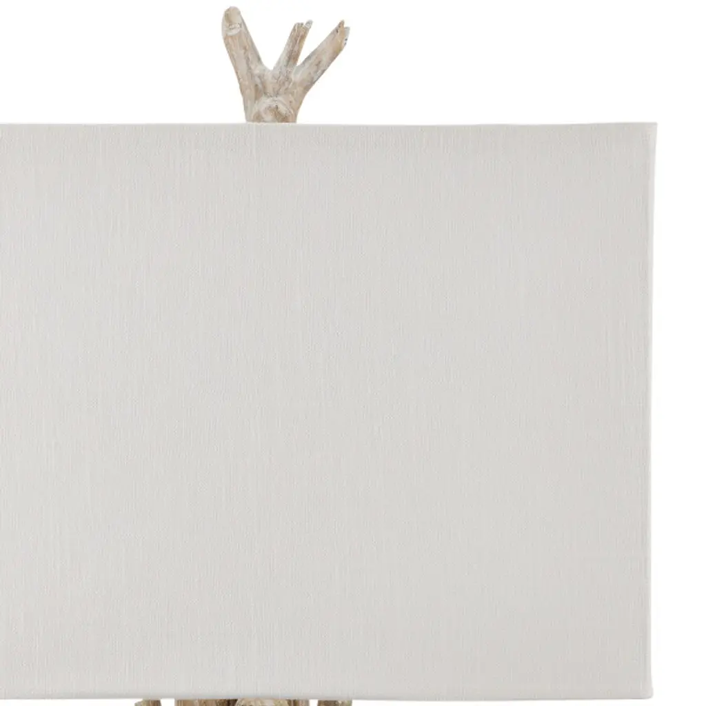 The Driftwood Whitewash Table Lamp is made of flowing driftwood sticks that rise from a square wood base, all in a washed driftwood finish. The forked finial on the composition is also in this finish, the disparate elements rubbed by hand to create uniformity while still maintaining hints of patina. The off-white linen shade is the perfect scale for this rustic creation, as it echoes the shape of the base.
