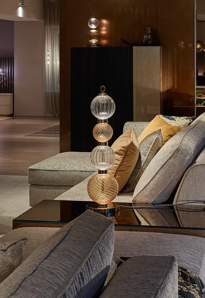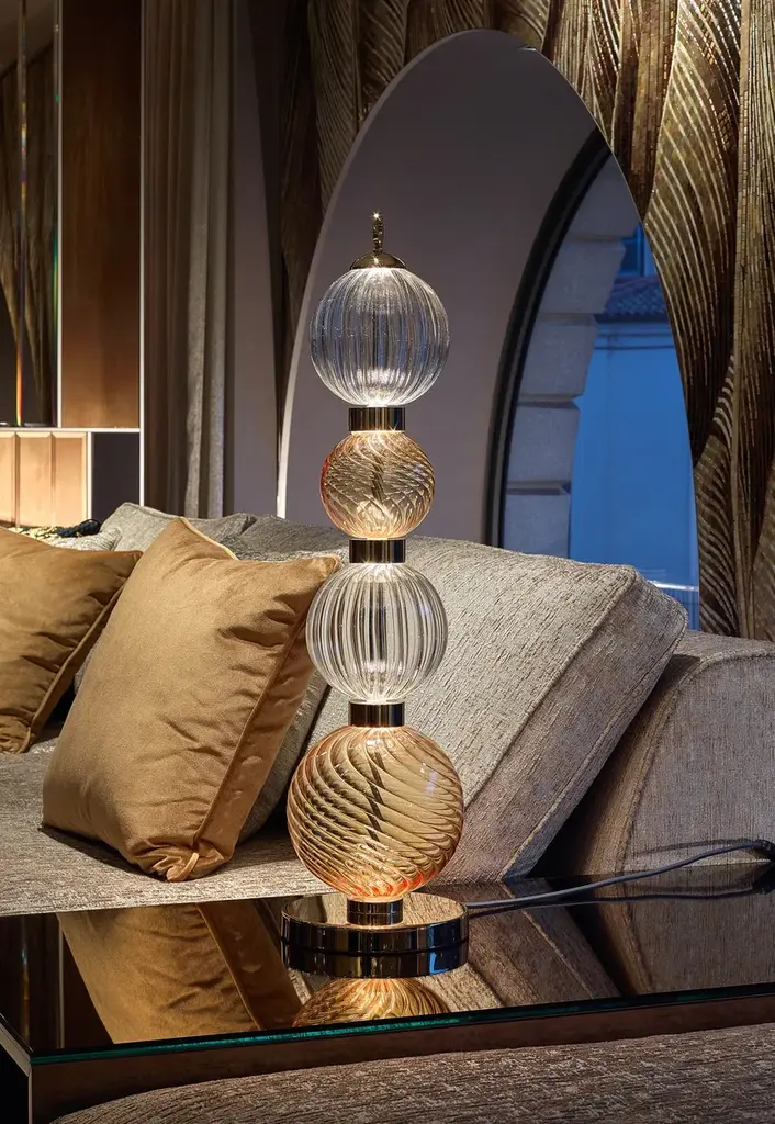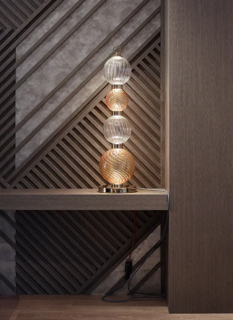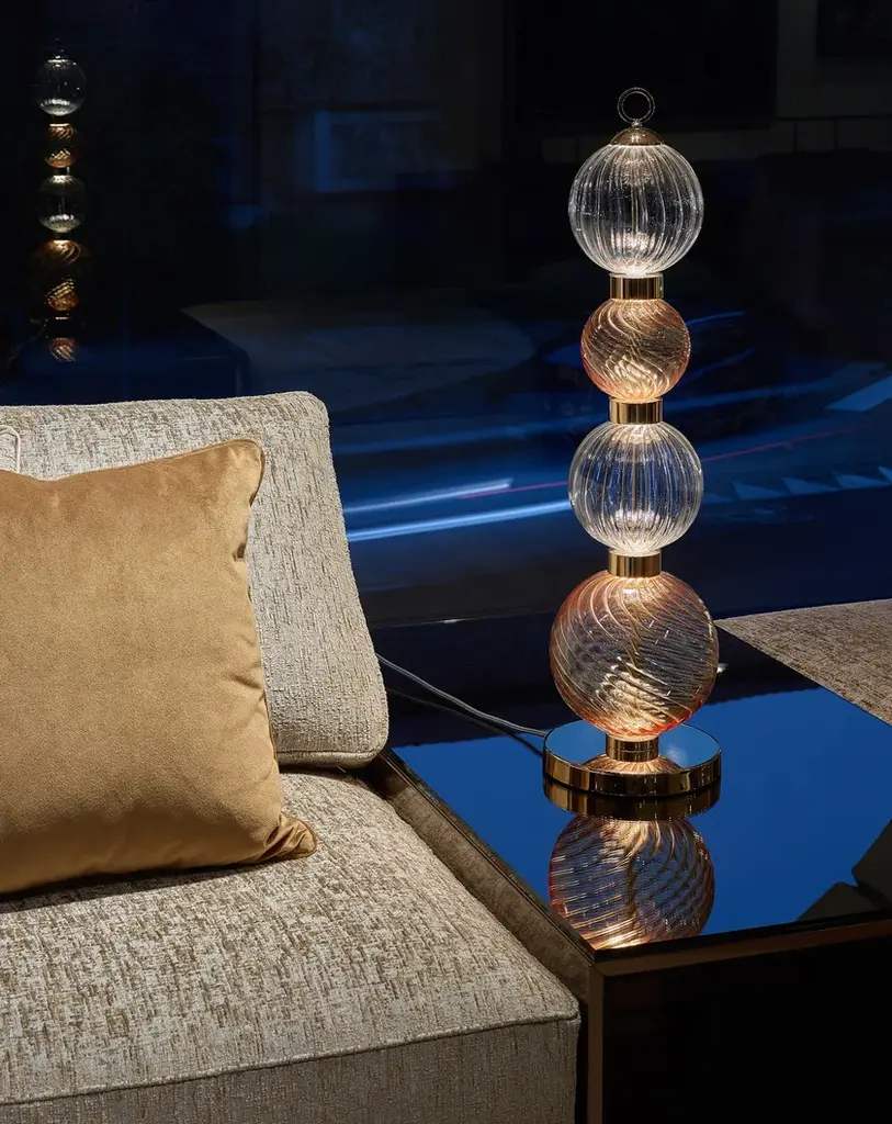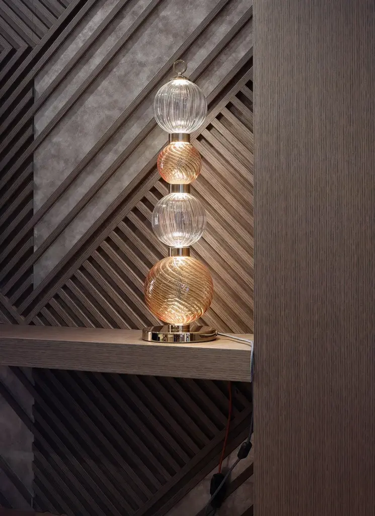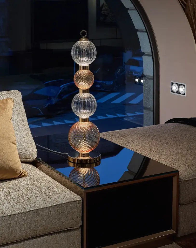 Drop is a table lamp with metal frames in satin finish and spheres in pyrex glass. BULB INFORMATION4X4W LED - 2700K - 1760 LUMENVOLTAGE220 VCERTIFICATIONCE