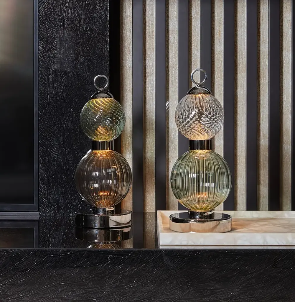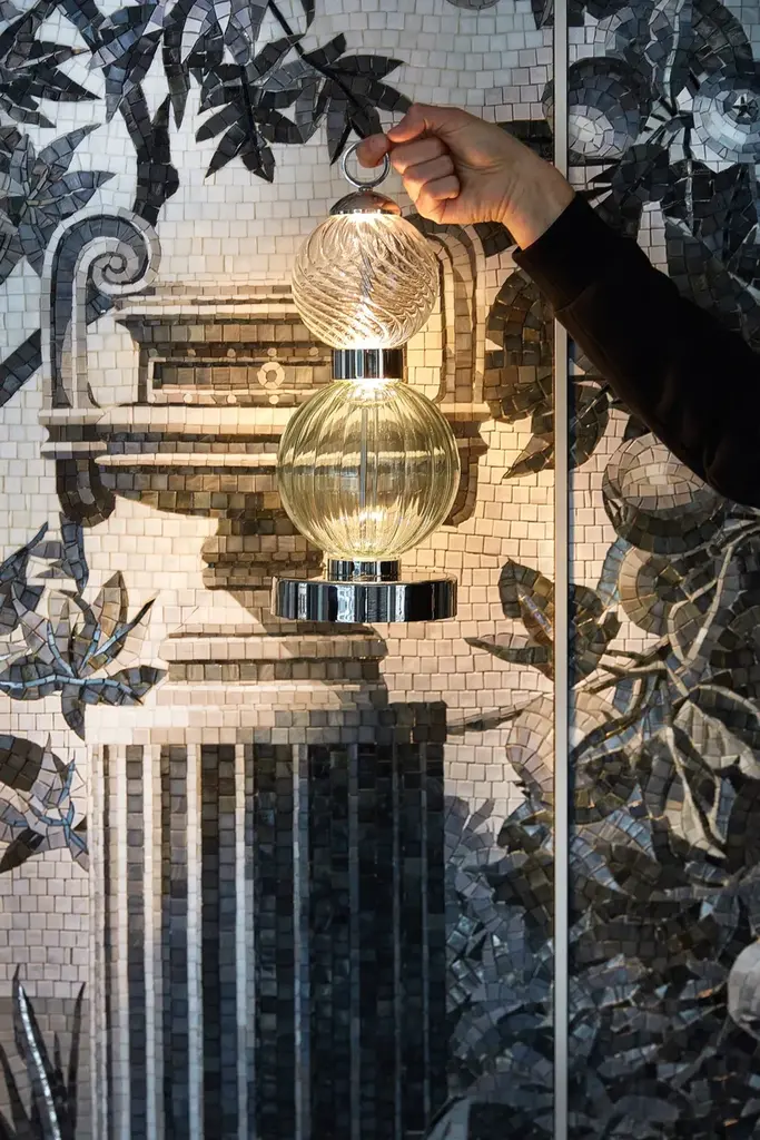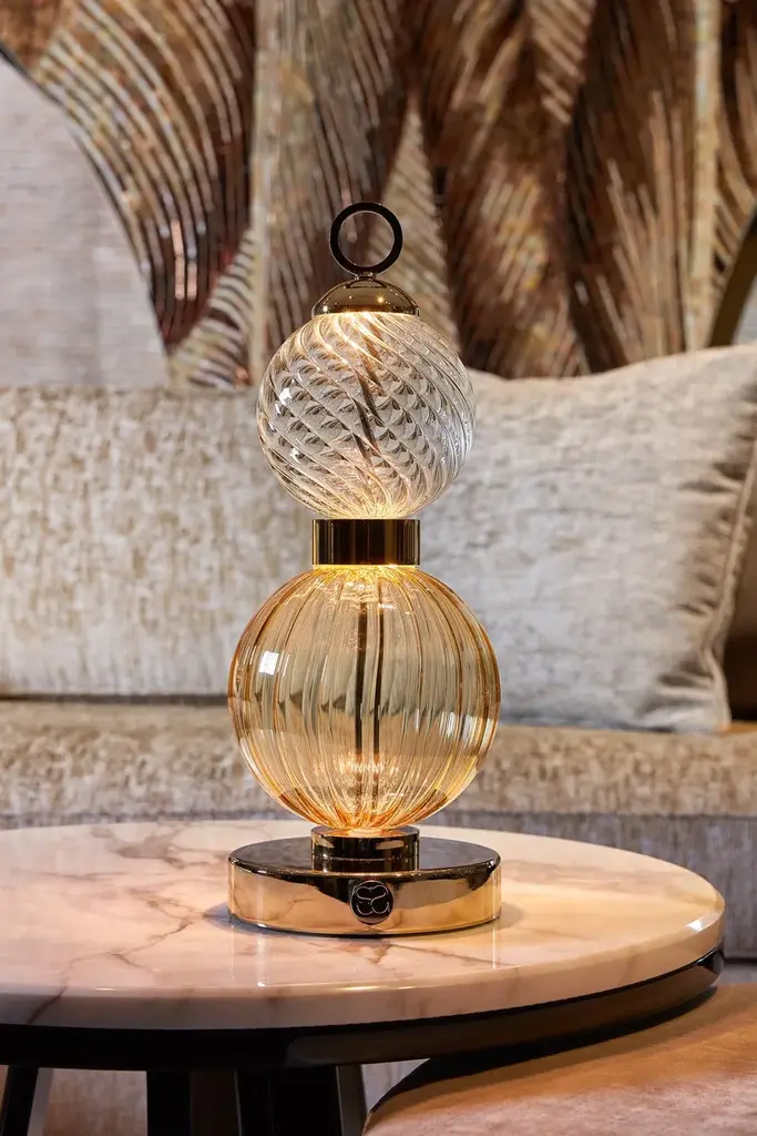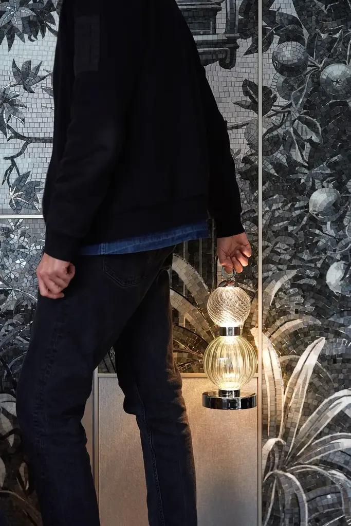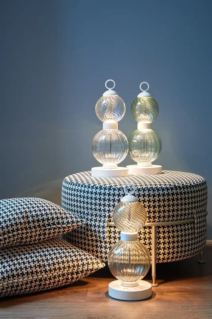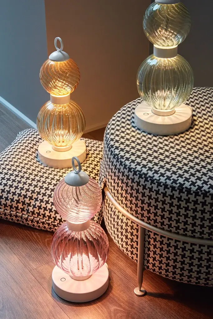 Drop is a table battery lamp with metal frames in satin finish and spheres in Murano glass. USB rechargeable battery. Touch lamp.BULB INFORMATION5 W LED - 500 lm - 3000 K - IP44VOLTAGE2 X 3,7V LITHIUM BATTERYCERTIFICATIONCEBATTERY AUTONOMY5 HOURSBATTERY CHARGED100/240 VAC - 50/60 HZOUTPUT5 V · 3000 mA