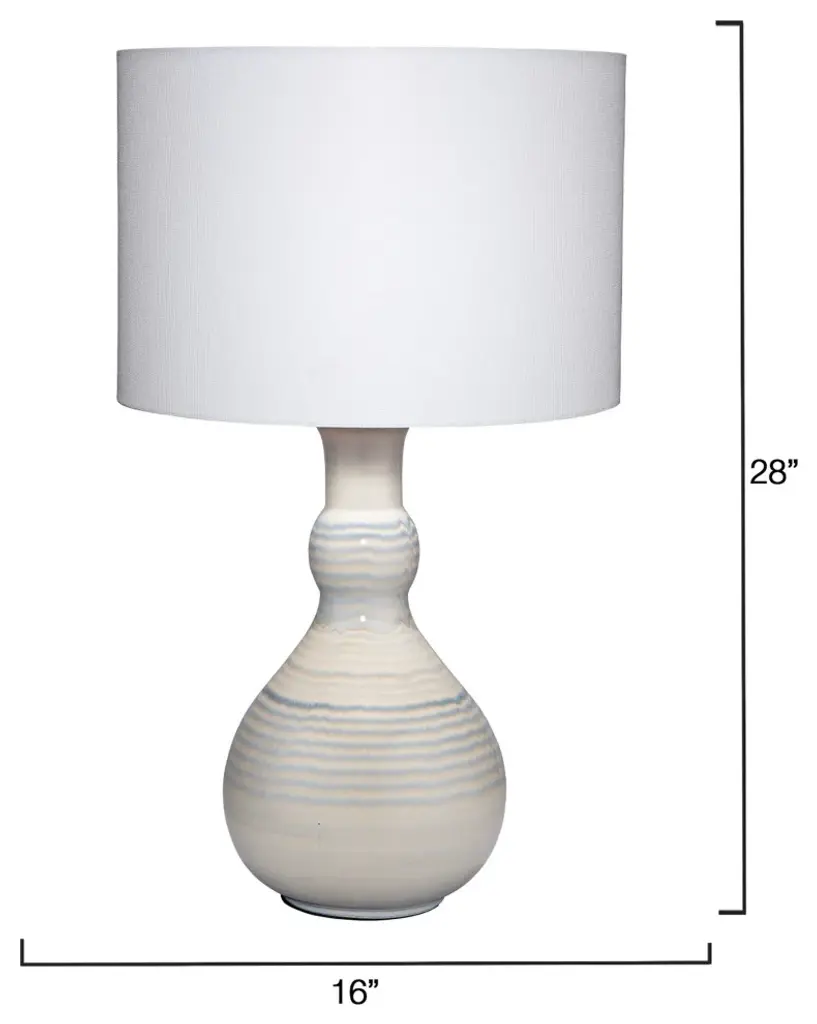 The concentric circles that ring this table lamp in soft shades of blue were inspired by the patterns that can be created by even a single drop of rain gently landing on a sidewalk. Each is expertly crafted of fine ceramic and topped with a cream linen drum shade and a silver ball finial. Try a pair on either side of a bed topped with a fluffy white quilt for a look that is light, bright, and breezy!Handmade of CeramicDrum, 100% Cream Linen, Rolled EdgeStriped Blue and White Pattern1" Round Ball Silver Finial9.5" Silver Harp, Silver SpiderThe handcrafted nature of ceramic creates products with character and individuality. The inherent variations in tone or texture, are preserved, to create pieces rich in detail and natural beauty. These unique imperfections and variations are what define our products, with each piece having its own personality. Lamp Body Dimensions: 15"H x 9"W x 9"DShade Dimensions: 11"H x 16"W x 16"D1 bulb required; Bulb Not Included150 Max Wattage; Volts 110E26 Bulb Base Type 8 FT Clear Cord 3-Way Switch on SocketProtective Black FeltNot Damp RatedCare Instructions: We do not recommend using harsh or abrasive cleaners at any time as they can damage product. Wipe surfaces gently with soft, dry cloth. If needed, you may use a lightly damp cloth with water only on base.