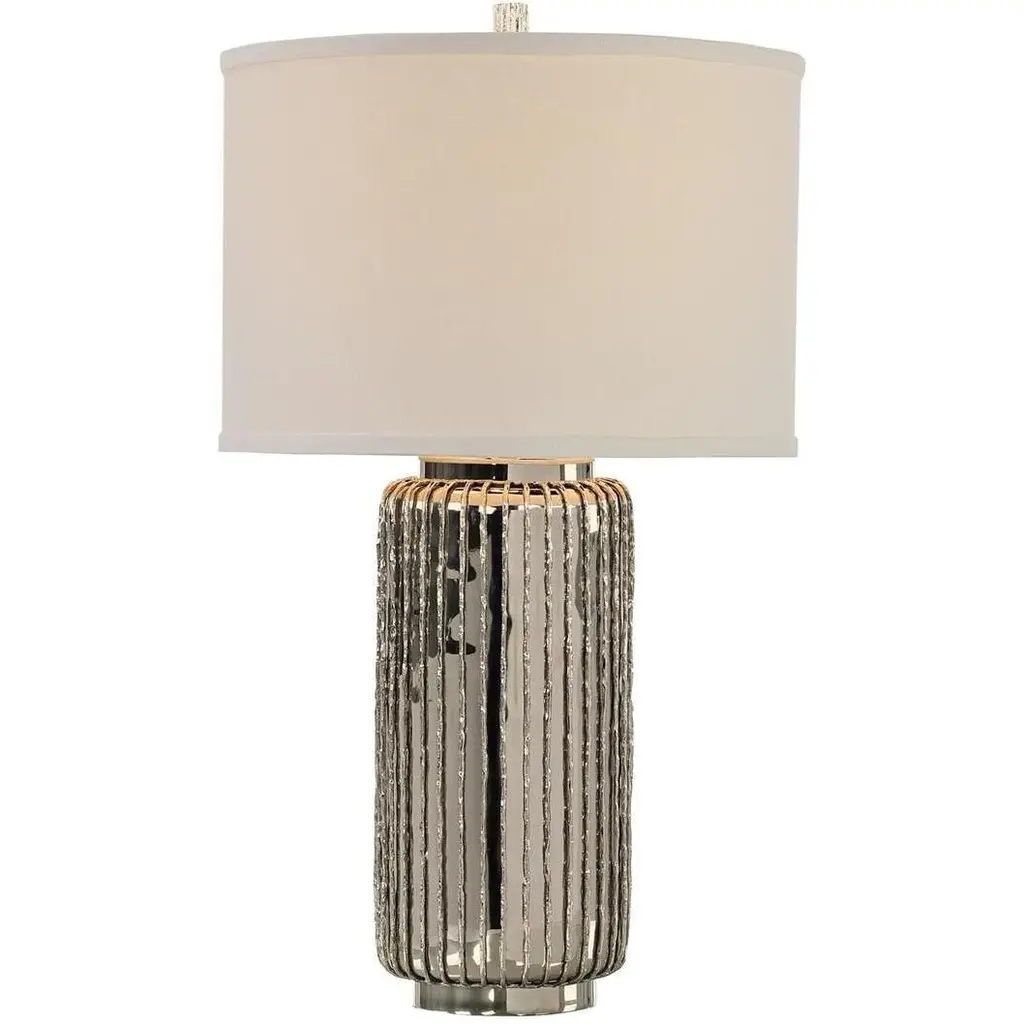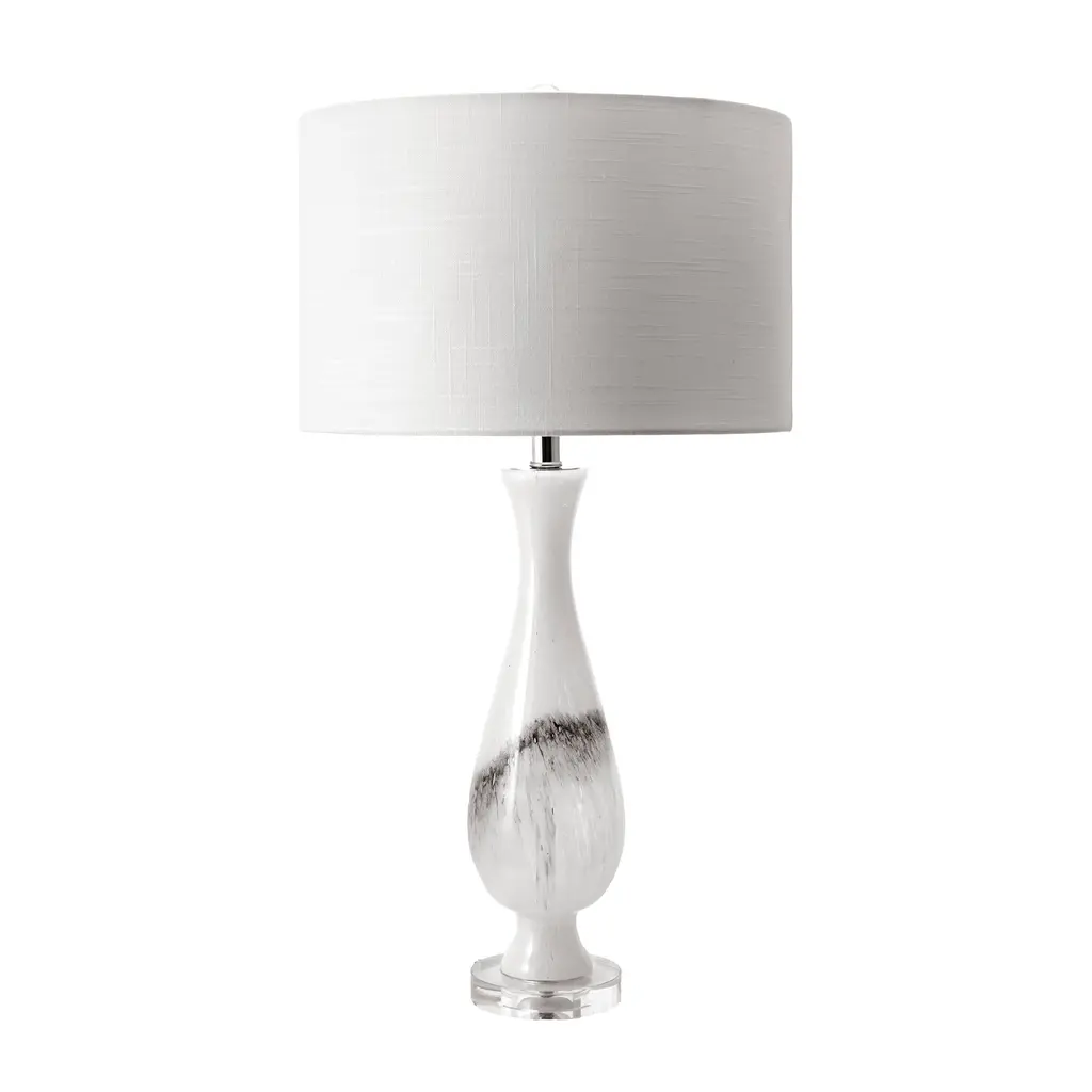 The Duality Table Lamp is an elegant design statement with a two-toned look. A navy-blue ceramic body showcases a stylish taper at the neck, and is overlain with wispy, hand-painted streaks of white. The piece sits atop a round base of clear acrylic, matched by the ball finial. A white linen drum shade with rolled edges completes the look.