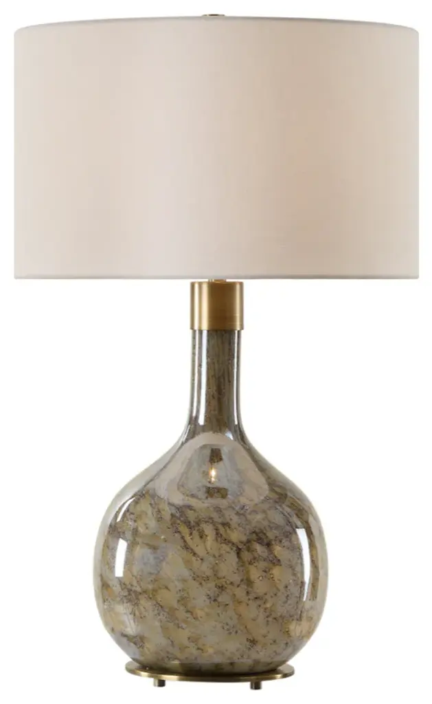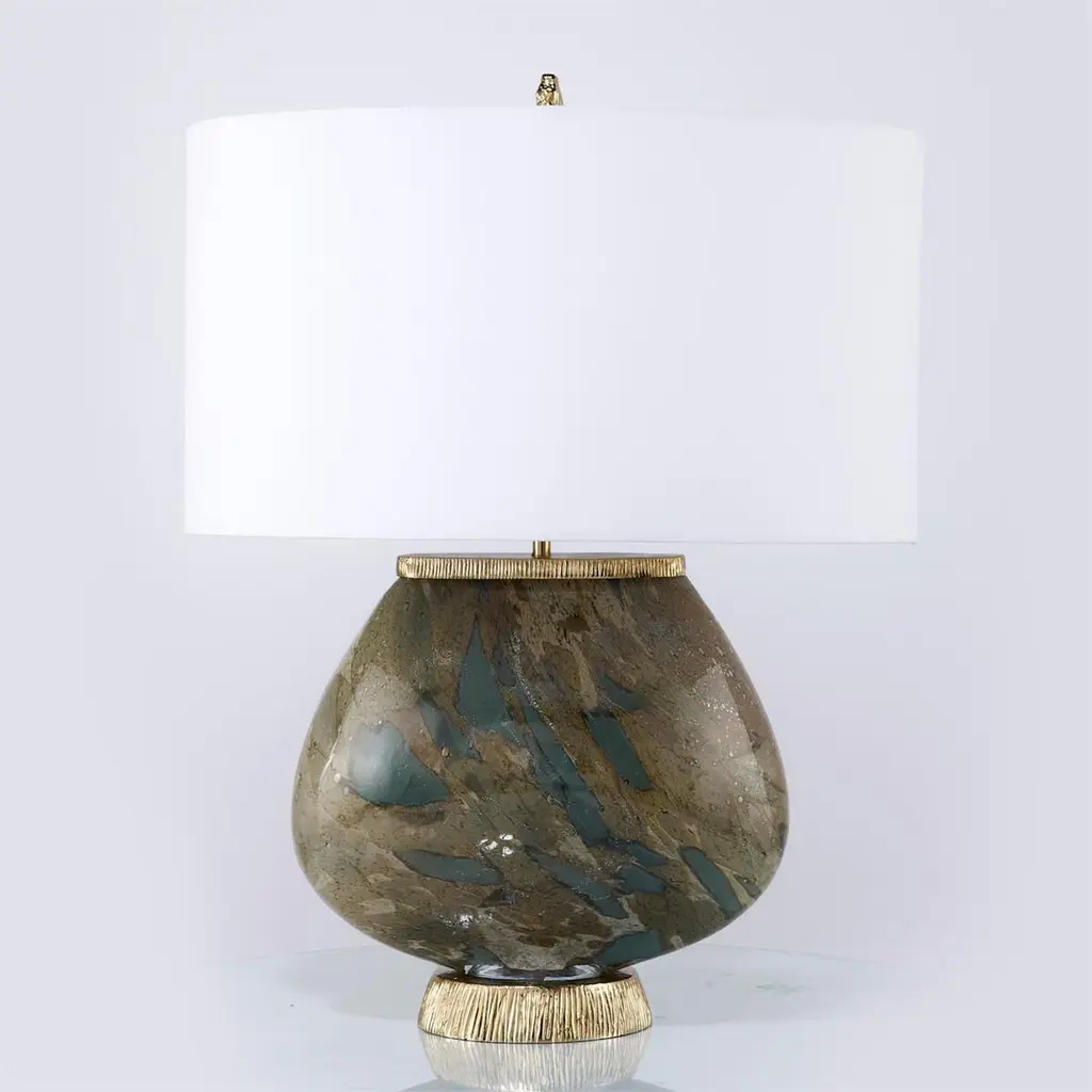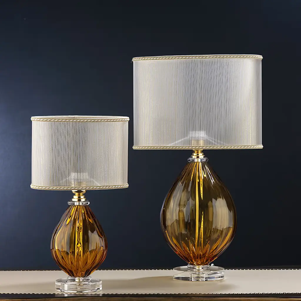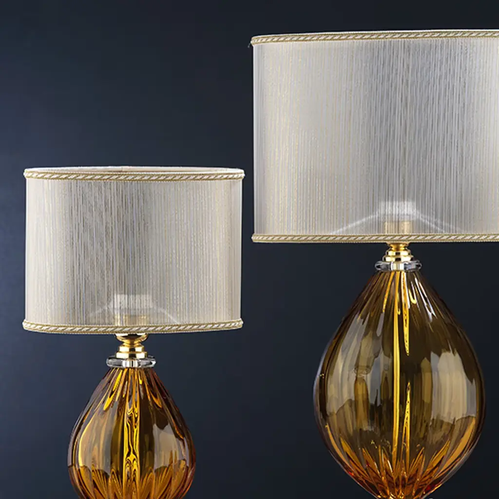 This elegant lamp was designed to sit on a bedside table. Its body is crafted in mouth-blown crystal in a rich amber coloration, with a clear base. The transparent lampshade harmoniously complements the body.
