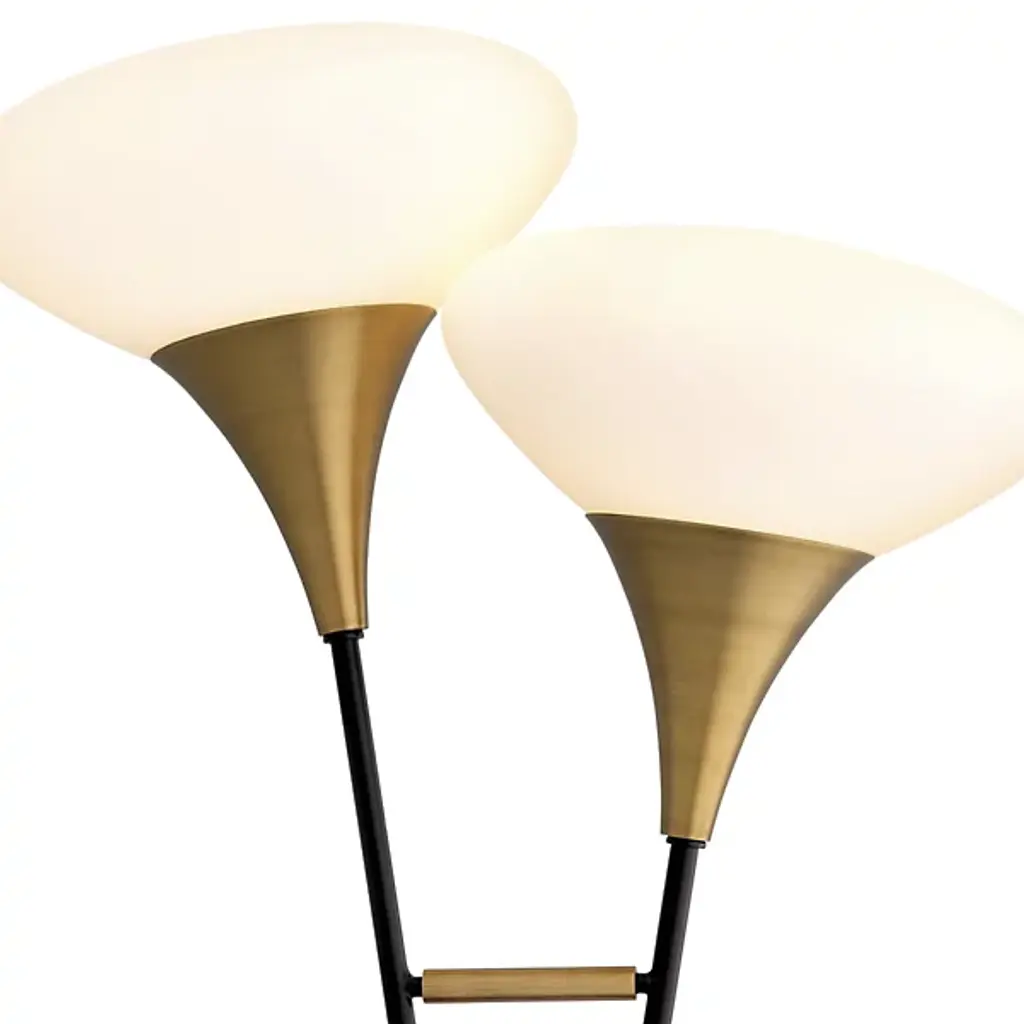 The intersection of elegant styling and eco-friendly sensibility have come together effortlessly with the Duco Table Lamp. It is a transitional and mid-century modern piece of lighting design from Eichholtz. Two stems flow up from the base and sway slightly outward as they peak at the bulbous glass shades and antique brass finishings. Meant to exude energy-efficient LED illumination, the light diffuses beautifully through the shades and onto the surrounding surfaces.