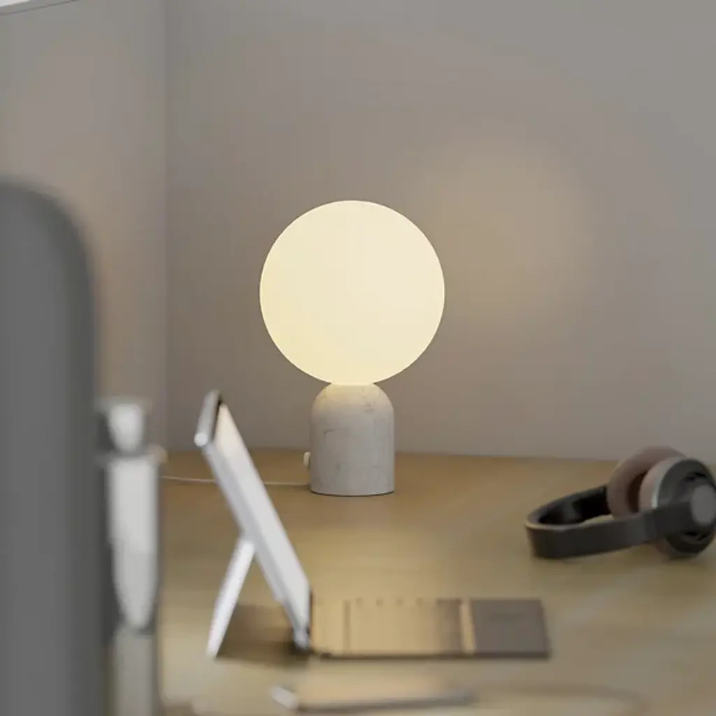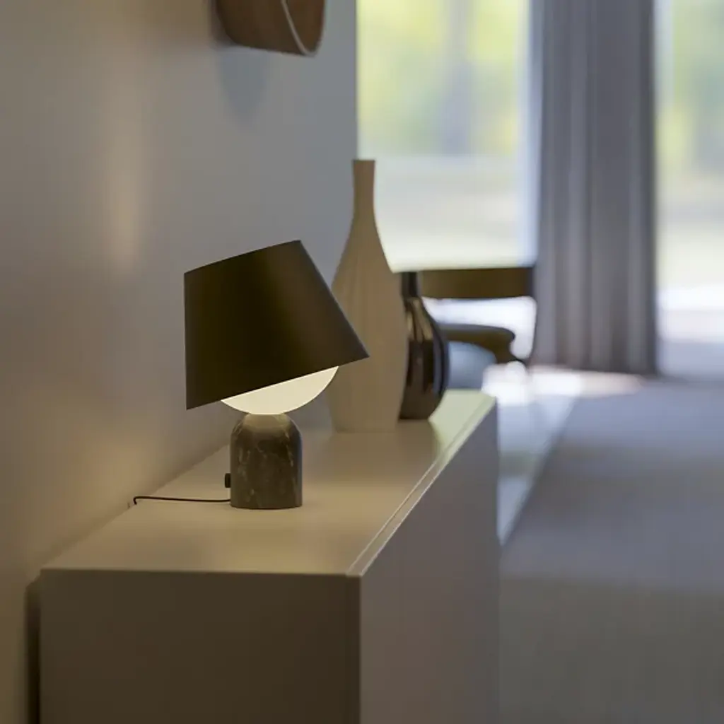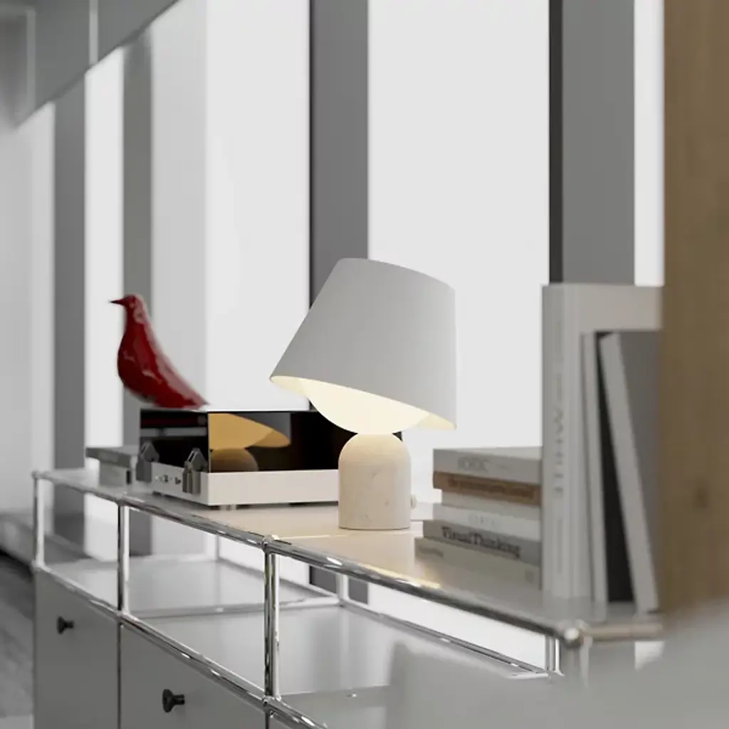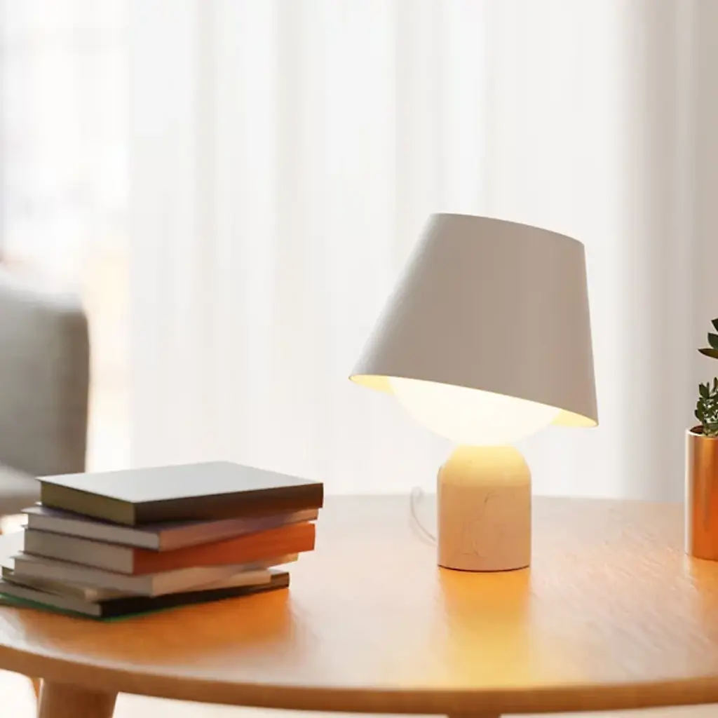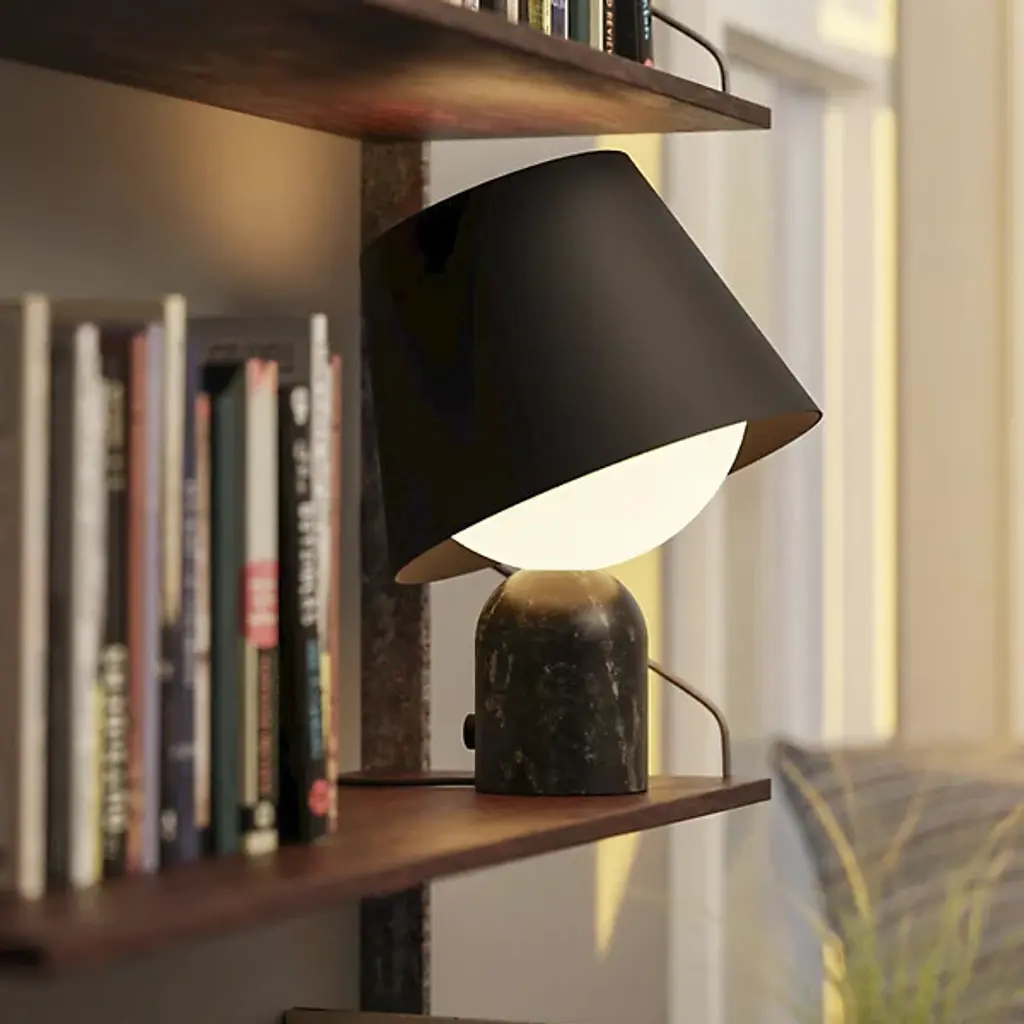 The Dude LED Table Lamp from Koncept features a classic and elegant style with modern customizability. The shade can tilt and adjust its angle like a hat on one's head, and a rotary dial on the marble base offers full-range dimming capabilities; both features work together to create the perfect lighting for a variety of settings. Designed by Kenneth and Edmund Ng, it shines a warm light down on the base, accentuating the beauty of the marble, and the askew plastic shade gives it a playful personality.