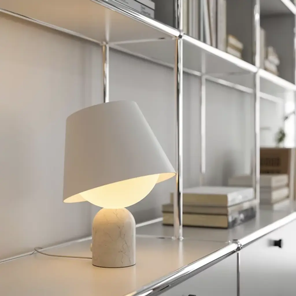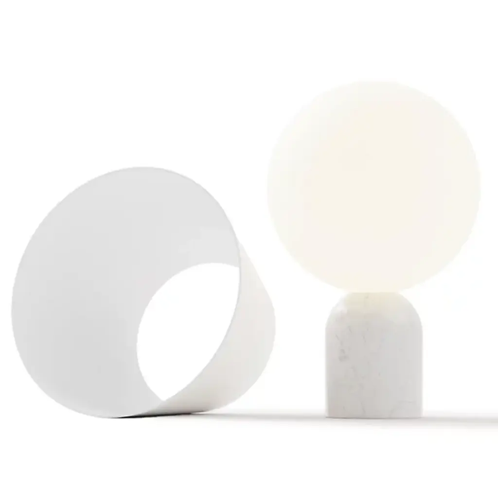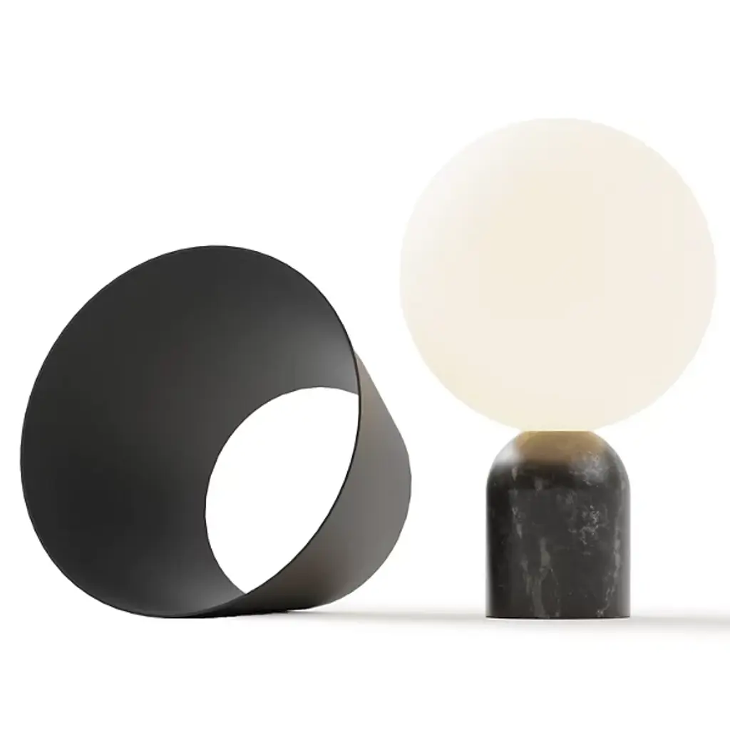 The Dude LED Table Lamp from Koncept features a classic and elegant style with modern customizability. The shade can tilt and adjust its angle like a hat on one's head, and a rotary dial on the marble base offers full-range dimming capabilities; both features work together to create the perfect lighting for a variety of settings. Designed by Kenneth and Edmund Ng, it shines a warm light down on the base, accentuating the beauty of the marble, and the askew plastic shade gives it a playful personality.