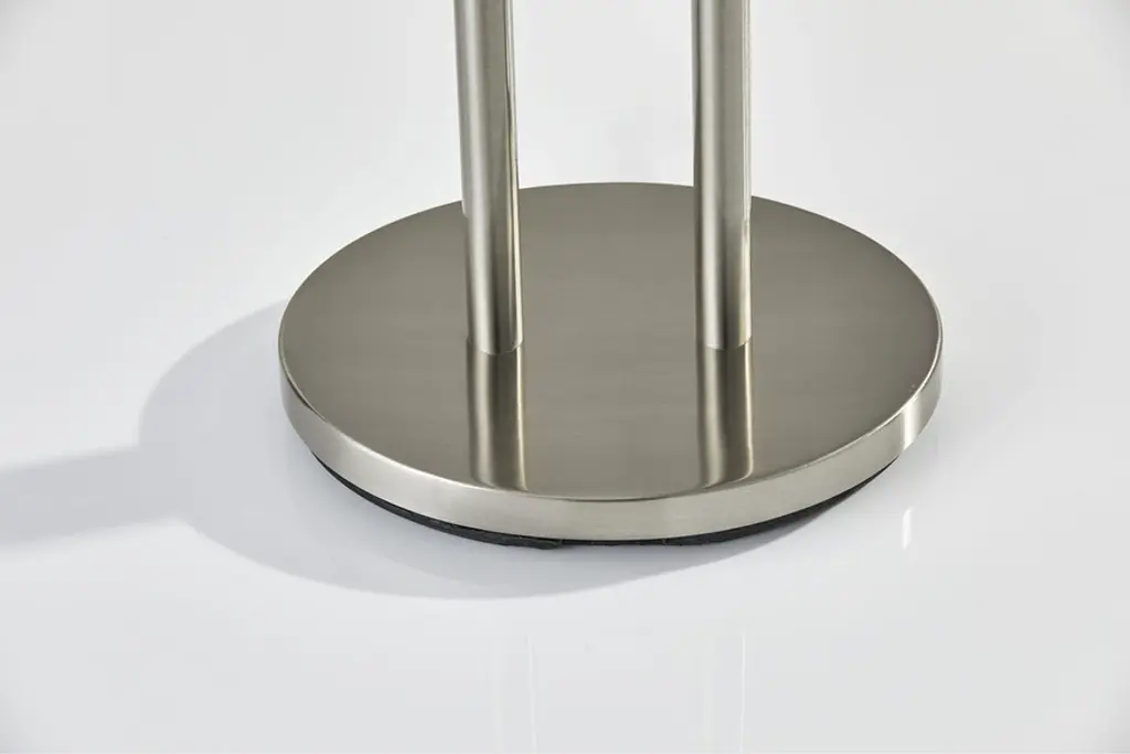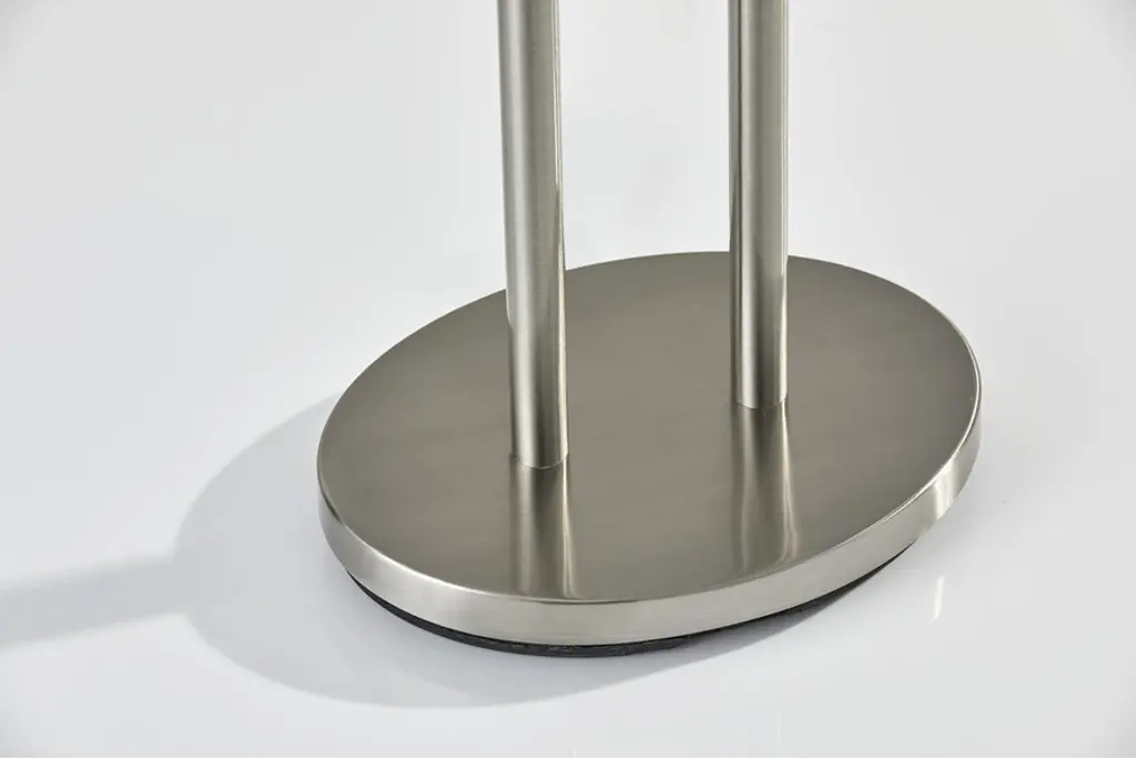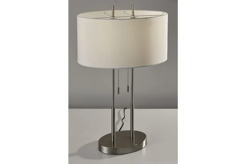 This remarkably beautiful piece is a smaller, tabletop version of the gorgeous Duet Floor Lamp. Crafted of luxurious, industrial chic satin steel, the Duet Table Lamp delivers a clever contemporary twist to a classic shape. A flat, 10 x 6.5 weighted oval base ensures unparalleled stability with increased visual appeal. Display this radiant lamp on any tabletop, desk, or workstation in your modern or transitional home for an instantly style upgrade.Shade: 17"w x 11"d x 8"h