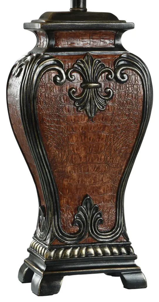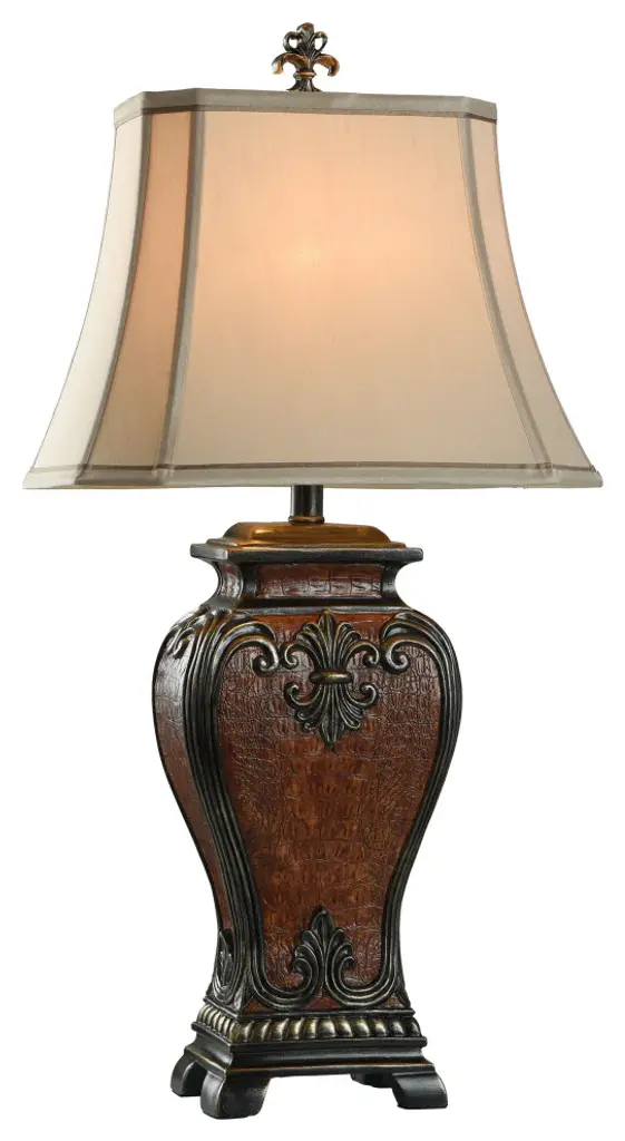 Accent your decor with this lovely Table Lamp.Features: Finish: Faux Crocodile Hide And Gold HighlighedShade Finish: CreamMaterial: Poly Shade Material: FabricLength: 12 inchesWidth: 16 inchesHeight: 33.5 inchesVoltage: 120VWattage: 100Safety Rating: Dry Location - This item is rated for dry locations, meaning it can be used in an indoor area that is not normally subject to dampness. May include a location subject to temporary dampness provided ventilation is adequate to prevent any accumulation of moisture such as the bathroomBulb(s) Included: NoBulb Type: IncandescentNumber of Bulbs: 1Due to lighting and monitor differences, actual colors and finishes may vary slightly from what appears online.