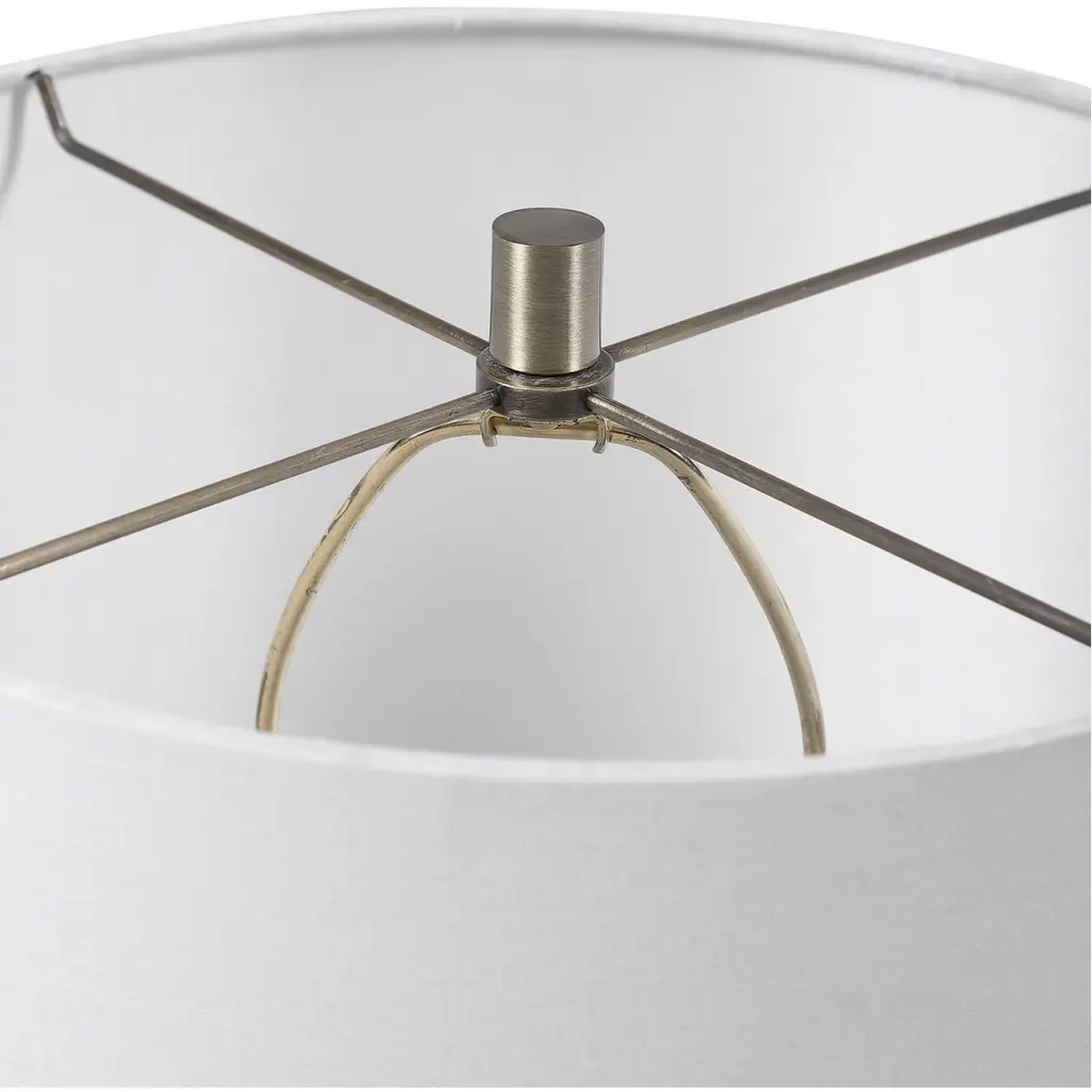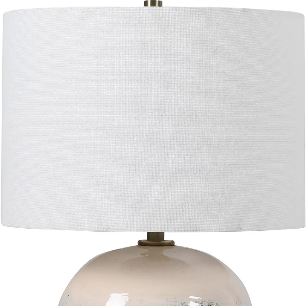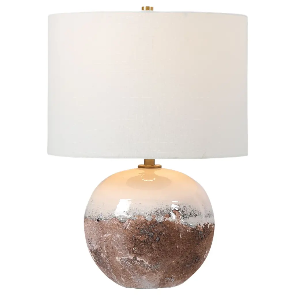 This Accent Lamp Features A Ceramic Base Finished In An Earthy Terra Cotta Rust That Transitions Into A Crackled Aged White Glaze, Accented With Light Antique Brass Plated Details. The Lamp Is Paired With A White Linen Drum Shade.