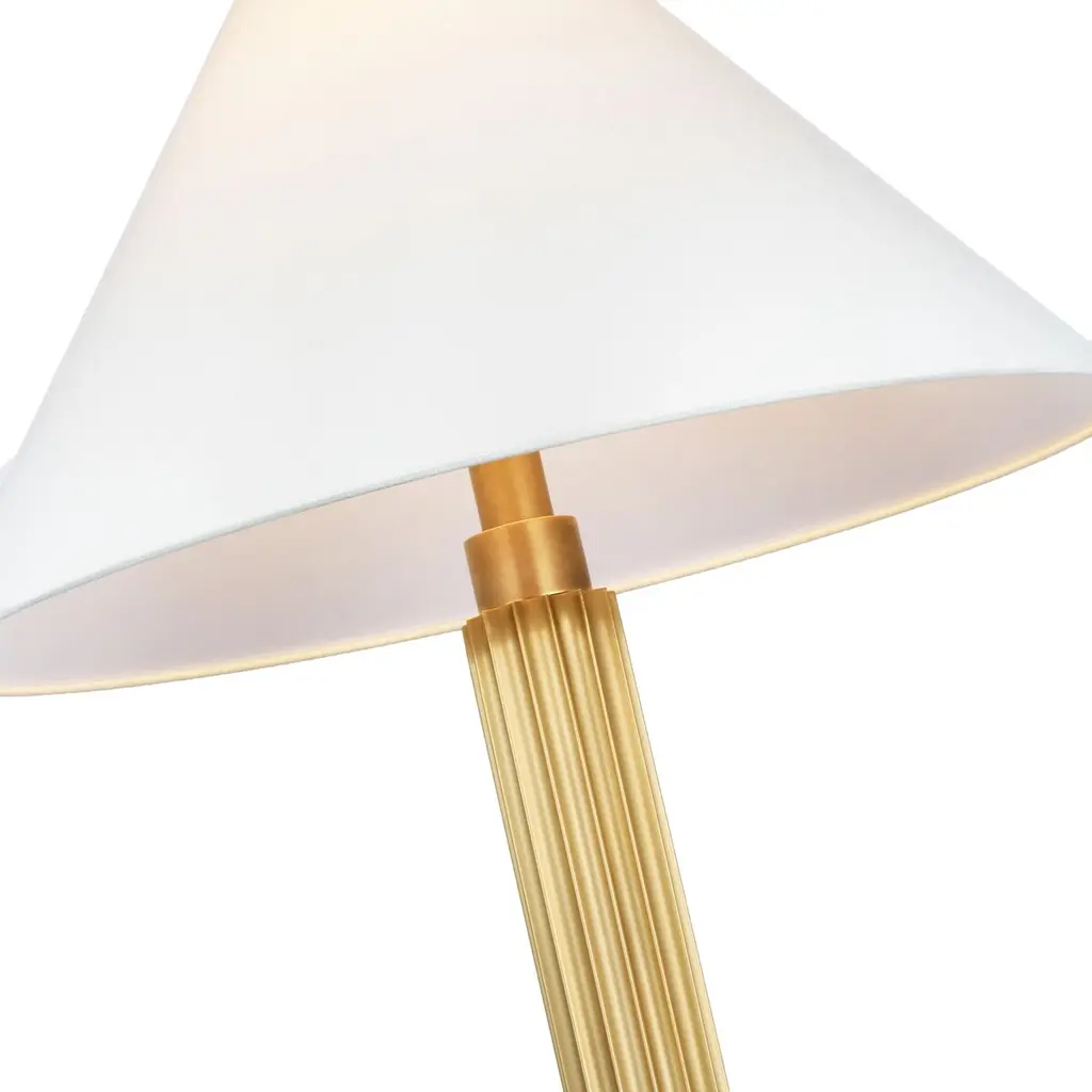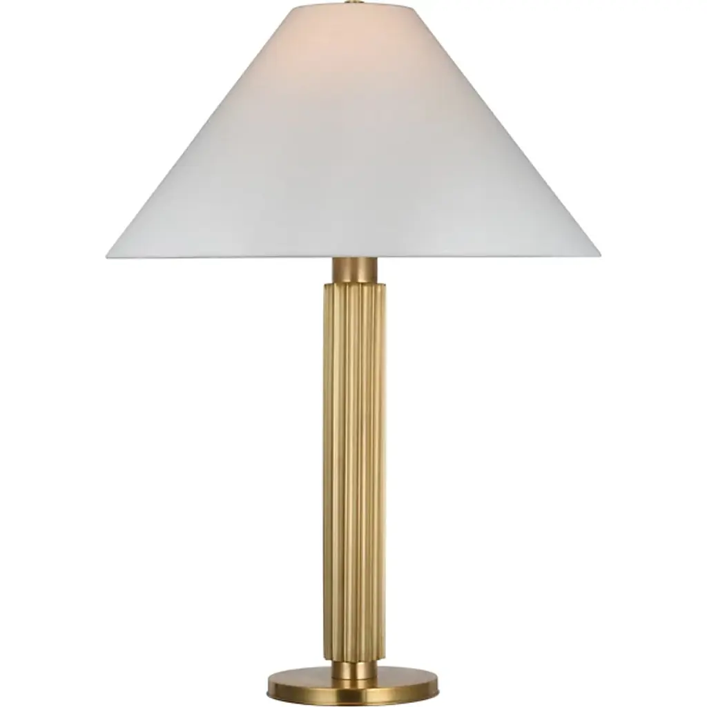 Fluting on the gleaming brass body gives this table lamp an Art Deco-inspired glamour, which is accentuated by the dramatically tapered white linen shade.