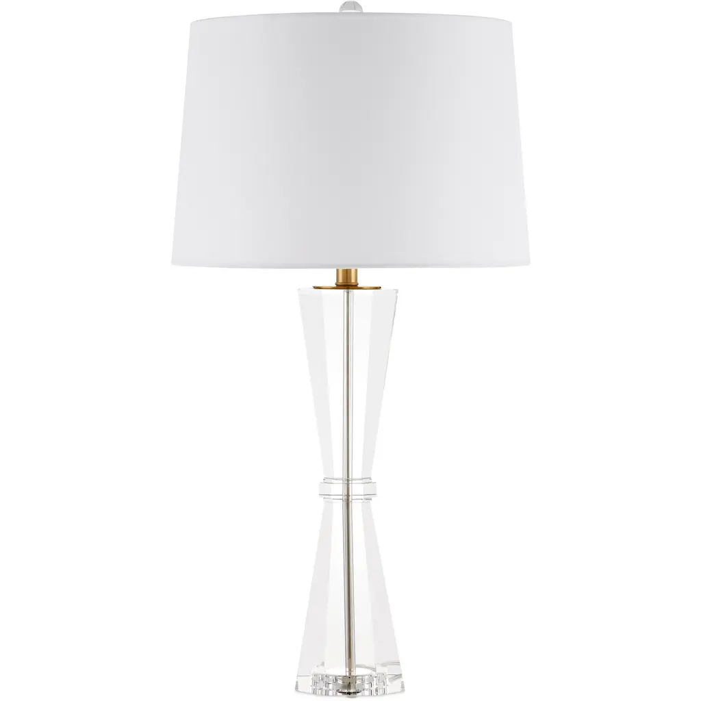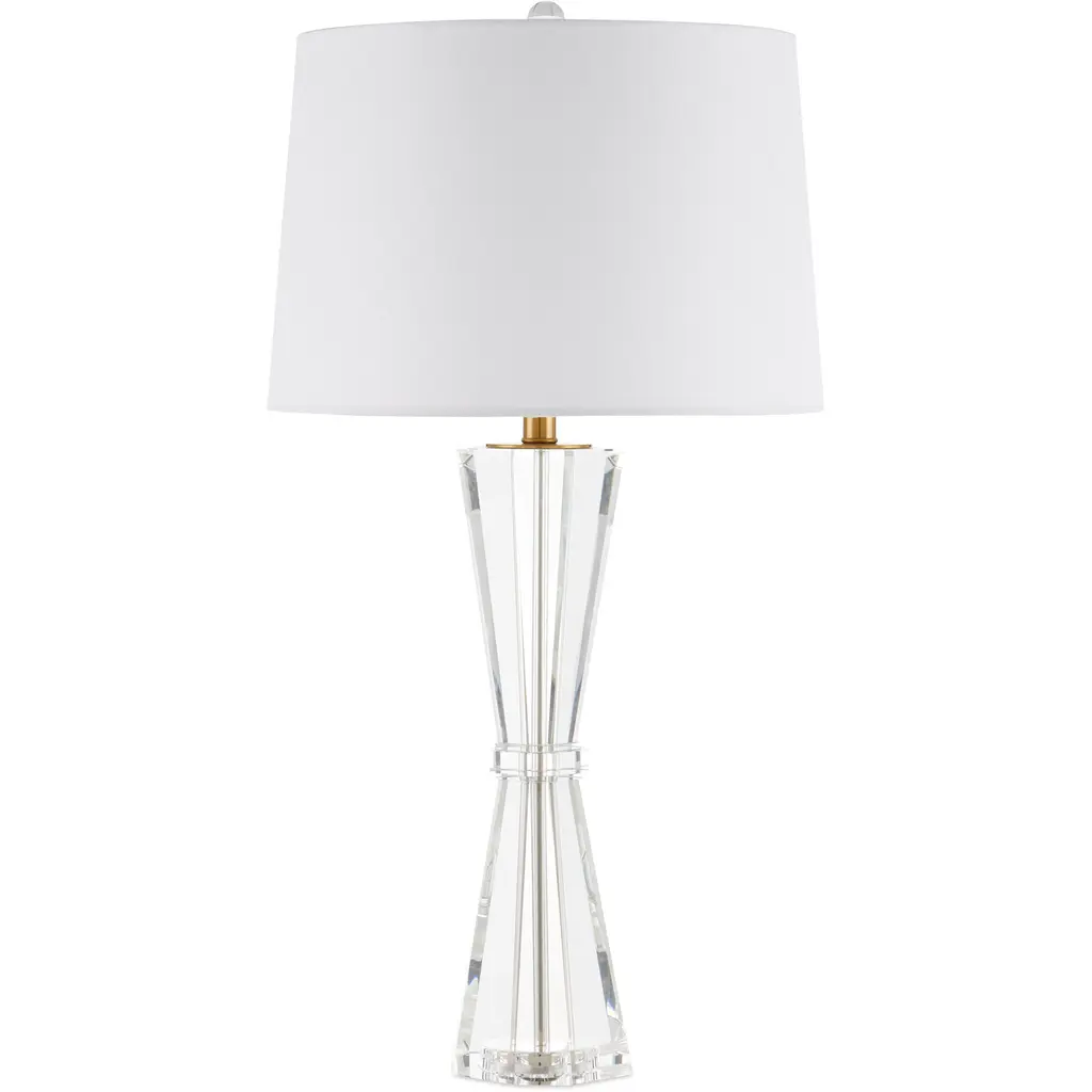 The Duveen Table Lamp has an elegant hourglass shape made of pieces of clear optic crystal arranged to swell at the top and bottom, its waist cinched by an octagonal ring. The gleaming polished brass finish combined with the clarity of the optic crystal makes this lamp luminous even when the lights are switched off.